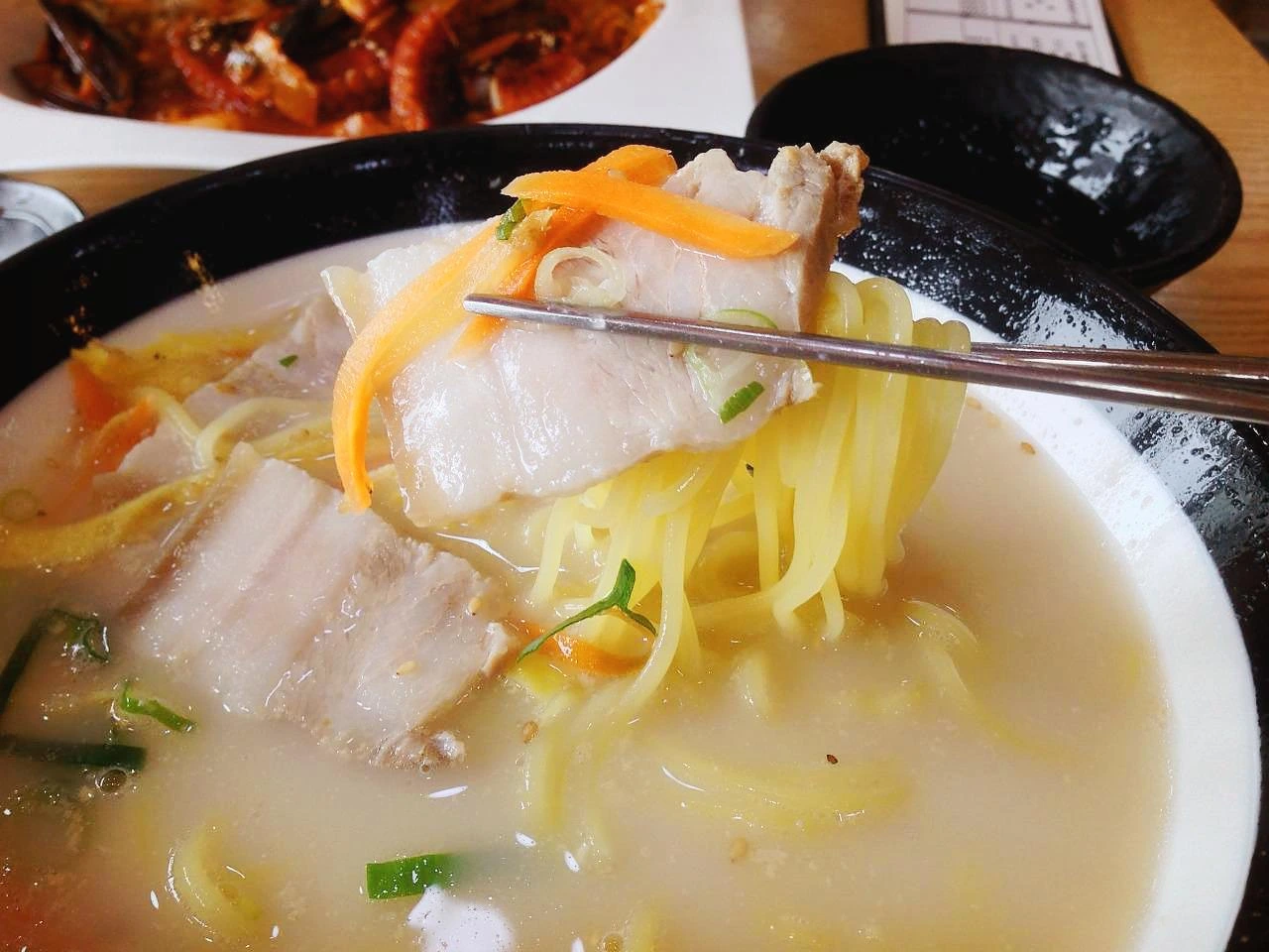 국물은 뽀얗고 구수했다. 일본 라멘 국물보다는 덜 짜고 덜 느끼한 맛이었고 면은 직접 만든 생면이라고 써있다시피 쫀득하고 탱글했다. 국물은 제주산이었는데 위에 올라가는 돼지고기는 두툼하고 양이 적지 않았는데, 수입산이었다. 양이 많았다.