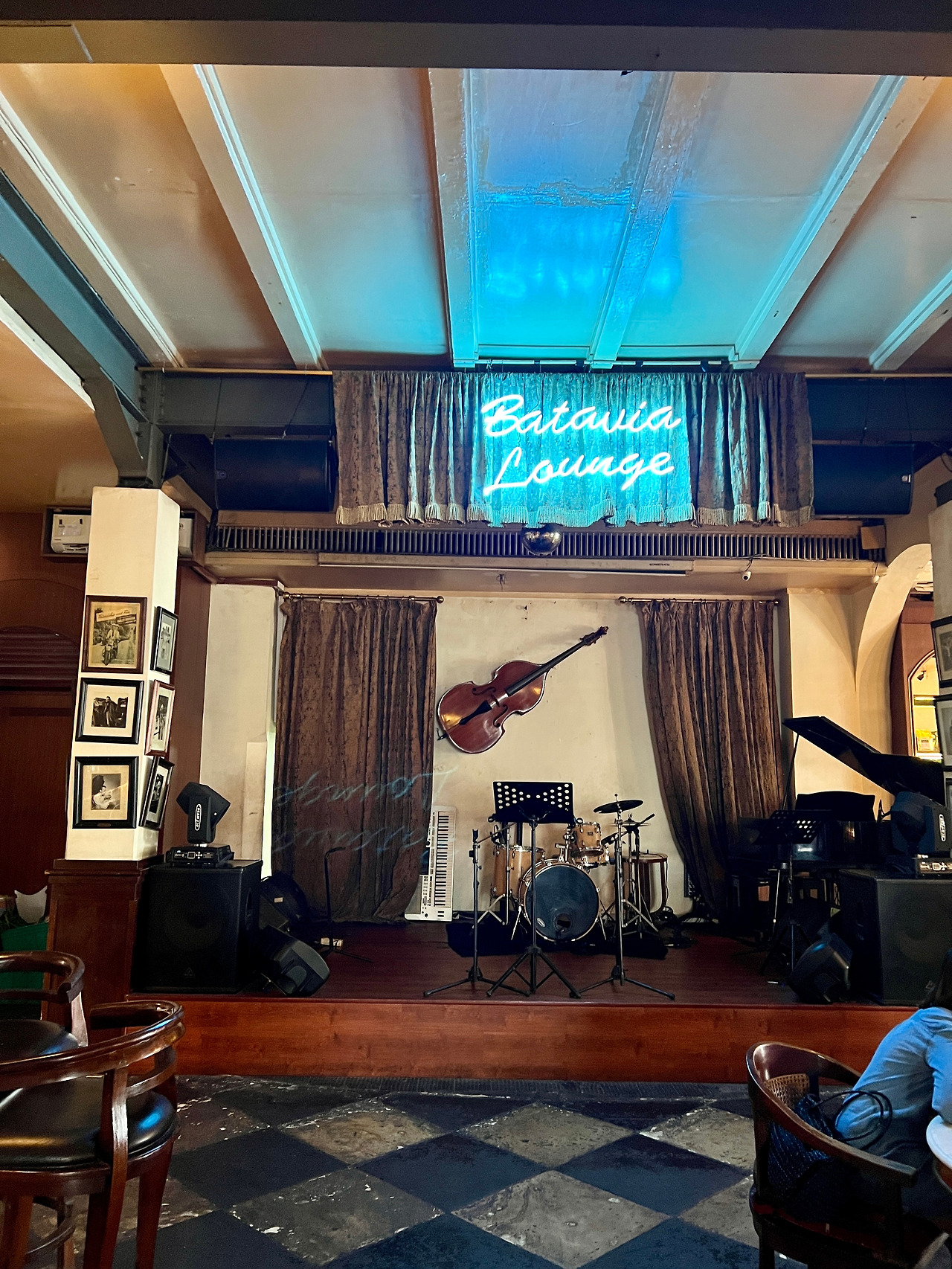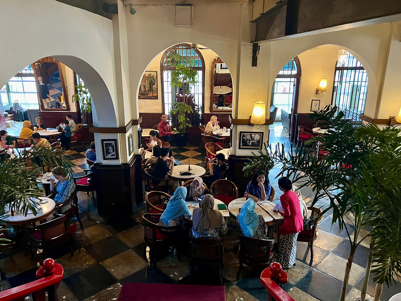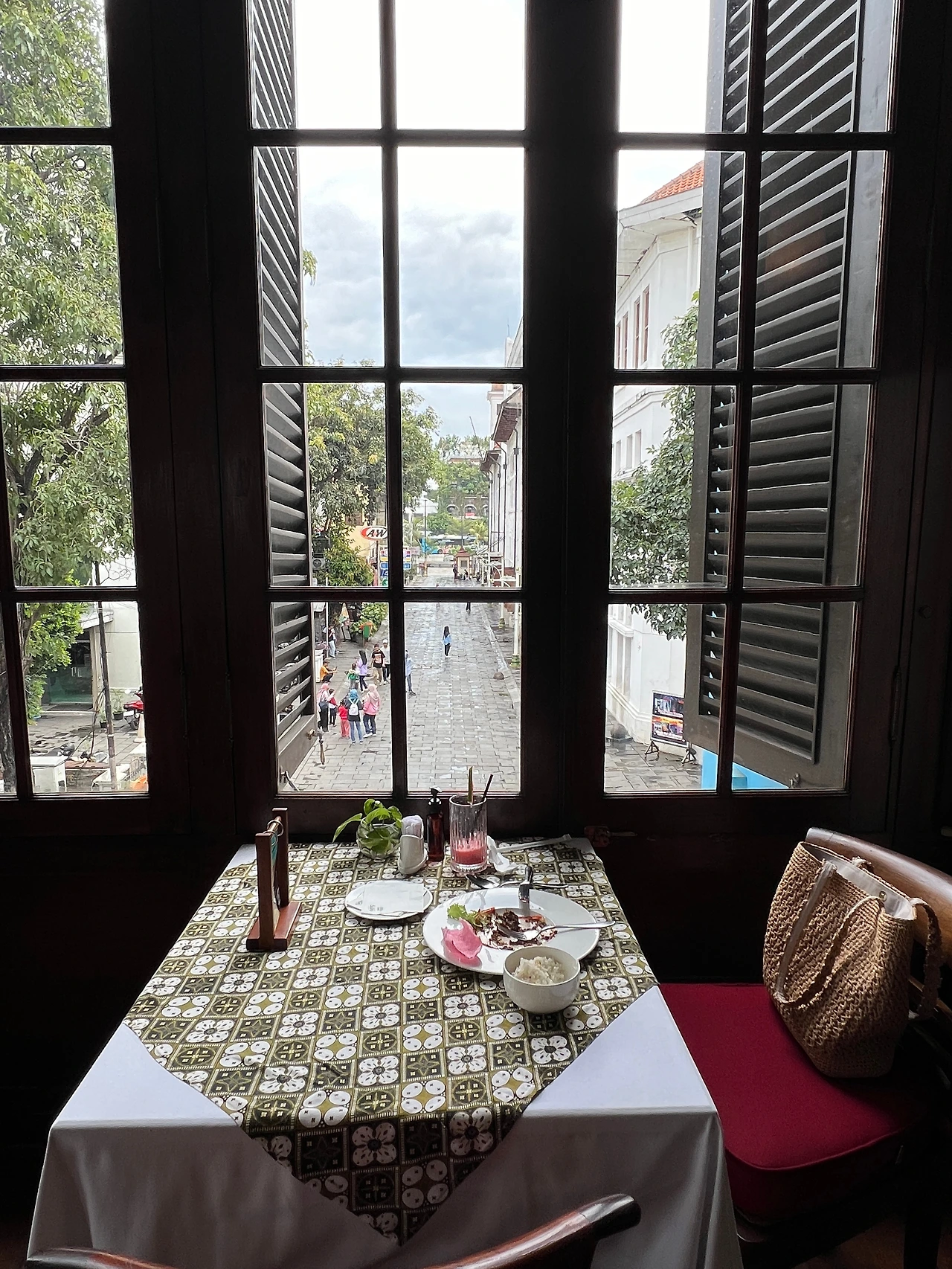 파타힐라 광장에 오니 자카르타 와서 처음으로 나와 같은 외국인 관광객들이 보인다. 자카르타에는 랜드마크랄 게 정말 없어서 그나마 여기가 관광지 같은 관광지이다. 관광객뿐 아니라 가족을 데리고 온 히잡을 쓴 엄마들이 많다. 식민지 시대의 정부청사와 같은 건물들이 있는데 와, 이국적인 건물들을 보니 여행지에 온 기분이 확 든다. 이들에게는 아픈 역사일까. 이리저리 건물 사진을 찍다가 목이 말라서 뭐라도 먹을 겸 들어가야겠다. 약간은 비싸다고 하지만 파타힐라 광장에 유명한 Cafe Batavia라는 곳이 있고, 주변에 가성비 맛집이라는 곳들도 있는데 카페 바타비아의 외관이 매력적이어서 들어가 보기로 한다. 입구에는 야자수 나무들이 심어져 있고, 진초록색 천막에는 감각적인 폰트로 CAFE BATAVIA라고 쓰여있다. 폰트가 경쾌해 보인다.