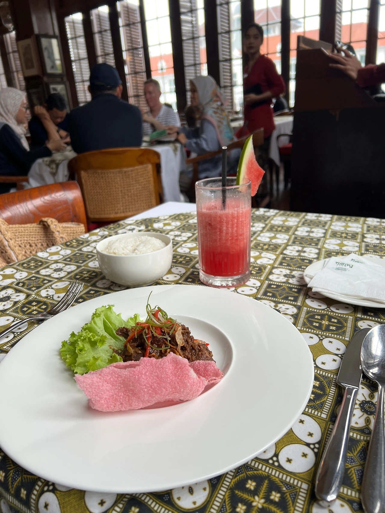 메뉴판을 보니 어제 폭풍우가 부는 야시장에서 사 먹은 나시고랭보다 거의 10배 가격이다. 서울은 아무리 빈부격차가 심해도 같은 메뉴가 이렇게 가격차이가 심하지는 않은데, 아닌가 서울도 시장에서는 3천 원짜리 칼국수를 먹고 호텔에서는 3만 원짜리 칼국수를 먹고 그런가. 여기서 괜히 가성비 떨어지게 나시고랭 미고랭을 먹느니 새로운 음식을 먹어보자, 하고 다른 메뉴를 보았다. 아, 렌당! 저번에 친구가 먹어보라고 한 음식인데 이걸 먹어보자. 고기이니 영양가가 있겠지. 렌당과 음료는 음... 수박주스를 마셔볼까. 주문을 하려는데 렌당은 주로 밥이랑 먹는데 렌당에는 밥이 같이 나오지 않으니 밥을 추가로 시킬 것이라고 묻는다. 아, 네 그럼 밥도 같이 주세요. 이렇게 렌당, 밥, 수박주스 가격은 230k이고 서비스 차지는 10%, 세금 10%가 붙어서 278k가 나왔다. 2만 3천 원. 와, 인도네시아에서 기대치 않은 굉장히 비싼 밥이지만 그것보다도 서비스 차지와 세금이 이렇게 많이 붙는다니 놀라웠다. 친구 말이 와룽이 아닌 레스토랑에서 먹으면 이렇게 붙는다고 한다.