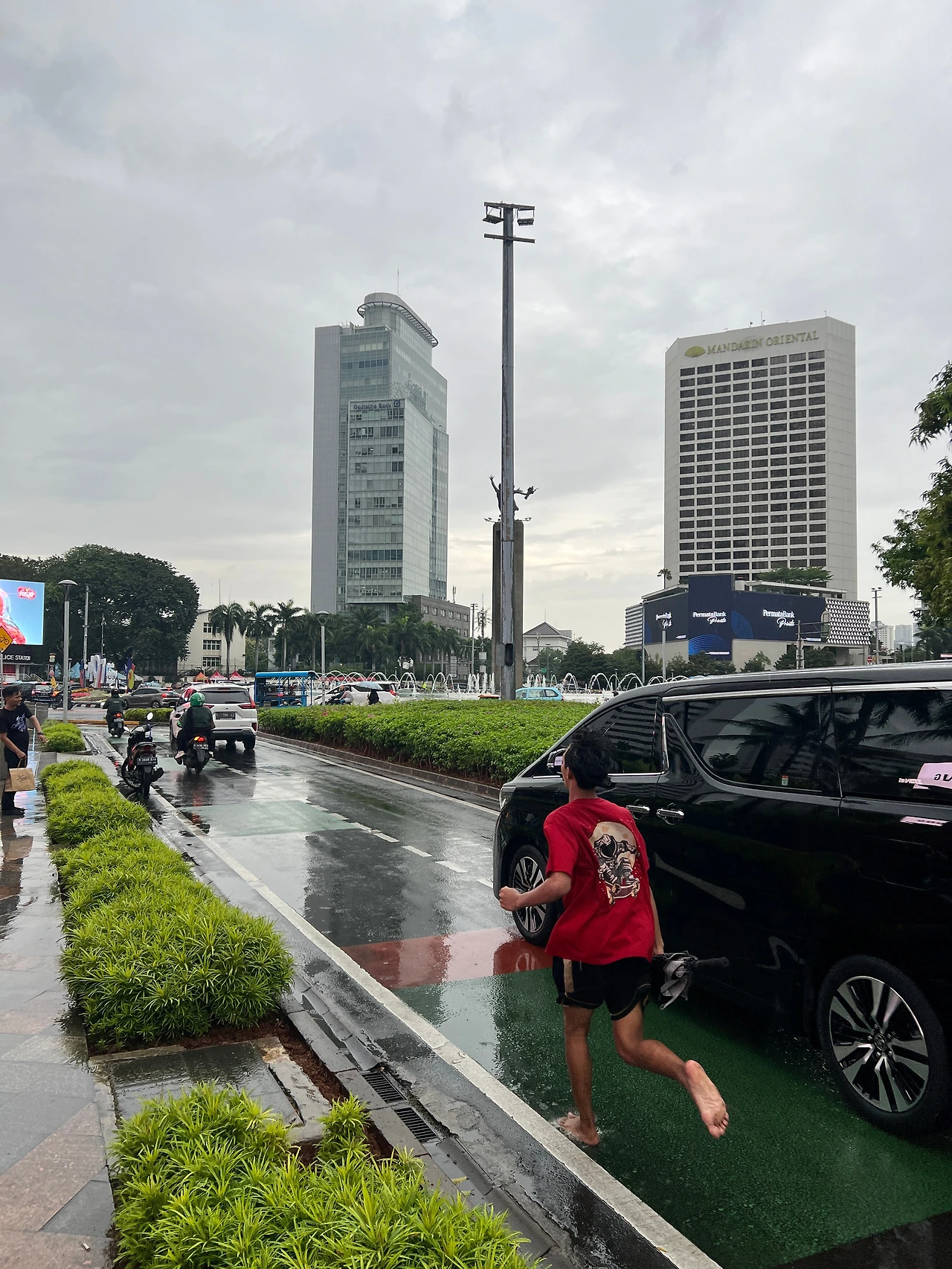 아, 또 비가 내리네. 그렇게 거세게 내리지는 않지만 젖을 정도는 내린다. 두 손을 펴서 머리와 이마를 가리며 주위를 둘러본다. 몇몇 사람들은 우산을 쓰고 있기도 한데 대부분 그냥 맞으며 걸어간다. 그냥 시원하게 맞으며 걸어가자, 하고 마음먹고 손을 내렸다. 하늘을 쳐다보며 얼굴로 비를 맞았다. 시원하게 정화되는 느낌이 든다. 주위를 둘러보니 나는 자카르타 대로 한복판에 서 있다.