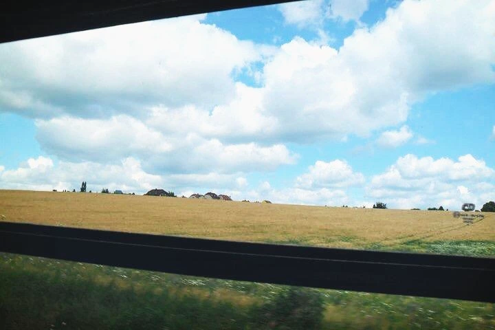 나는 기차를 타고 갔는데, 기차 창밖으로 보이는 시골 풍경과 풍성한 구름의 조화가 정말 아름다웠다.