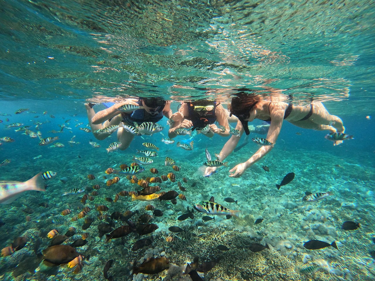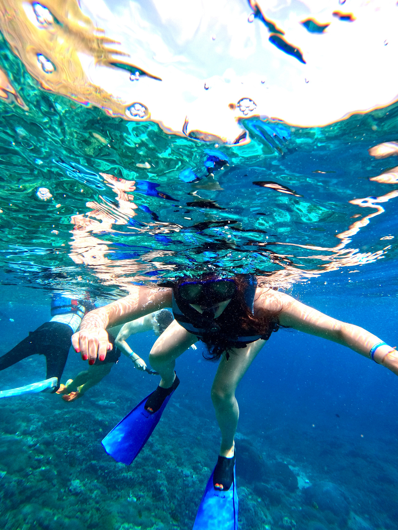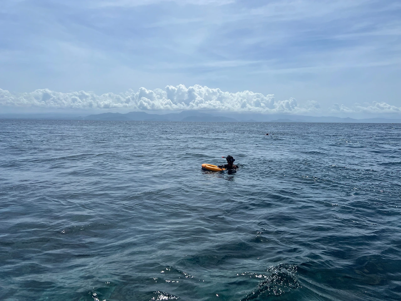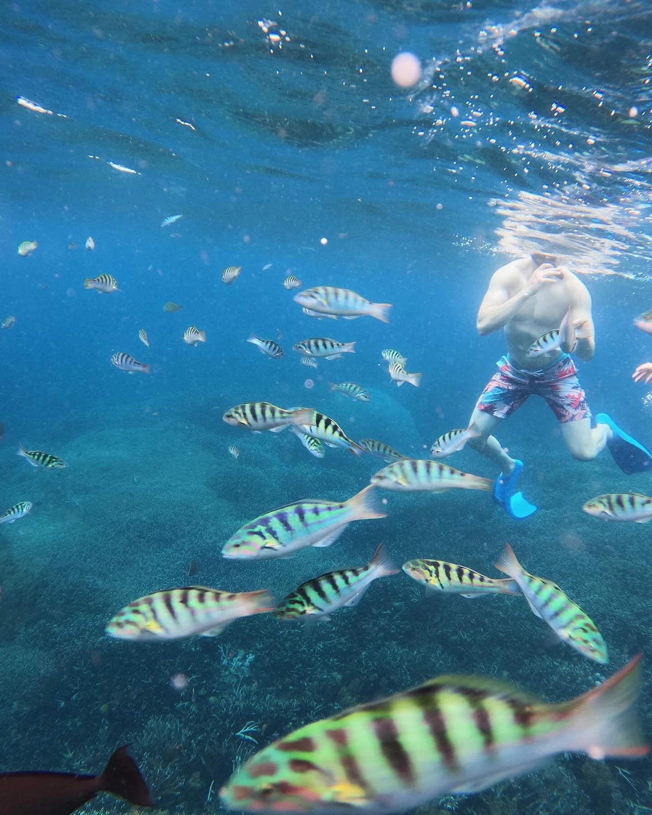 다행히 두 번째, 세 번째 포인트는 청록색의 맑고 깨끗한 물에 파도가 잠잠한 곳이었다. 초심자로서 마음에 여유를 가지고 한가롭게 떠다니며 물속을 구경할 수 있는 곳이었다. 여러 배가 나누어 포인트를 돌아다니는데 사진을 찍는 가이드를 만나면 사진을 찍어준다. 같이 간 미국인은 수영을 매우 잘해서 구명조끼를 벗고 바닷속 깊이 들어가는데 너무 멋있고 부럽다. 만타 베이에서 너무 무서웠고 패닉상태에 빠졌었다 하니 다음 포인트에서는 중간중간 나를 챙겨주며 괜찮냐고 자기만 따라다니라고 해 주었다. 고마워라. 구명조끼를 벗고 깊이 들어가는 사람들이 꽤 있는데 꽤 인생 사진을 찍어준다. 나도 언젠가 그렇게 해보고 싶다. 지금은 수영도 잠수도 못하는 인간.