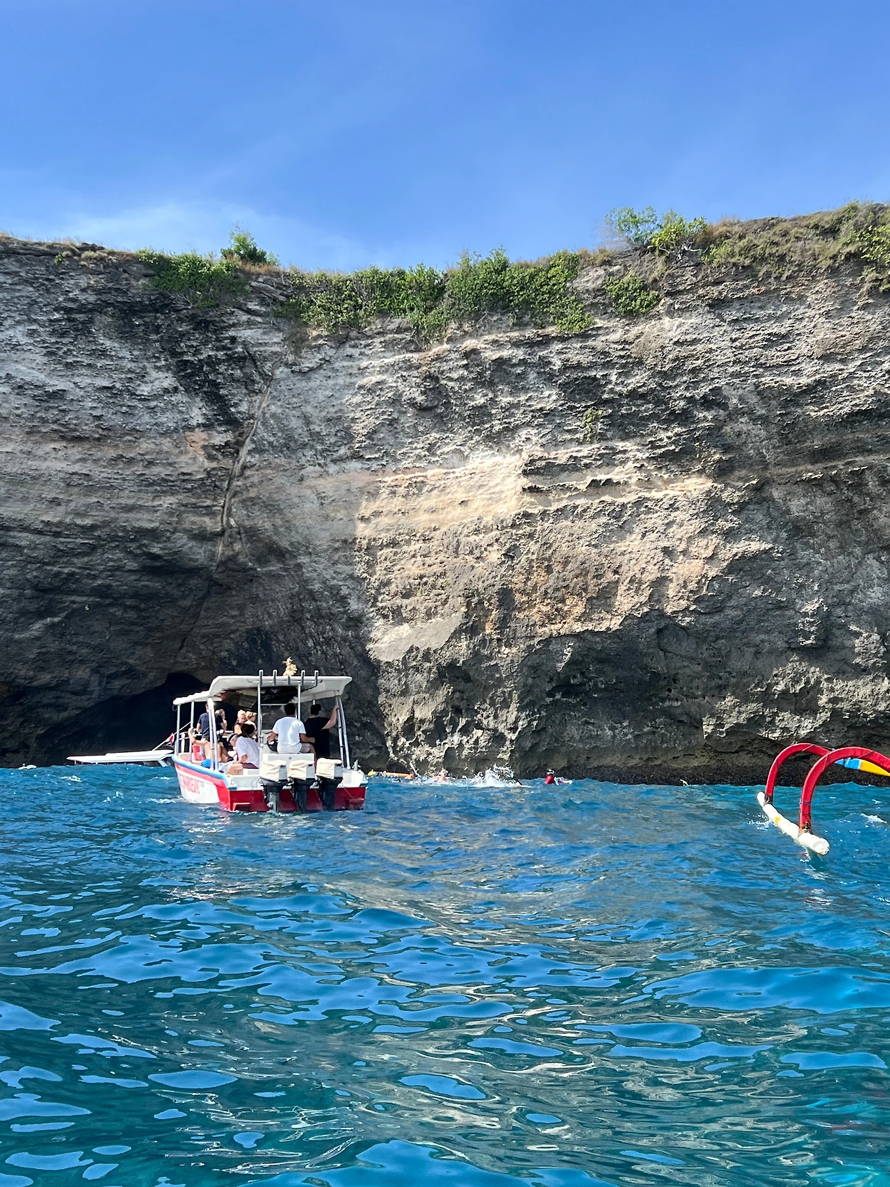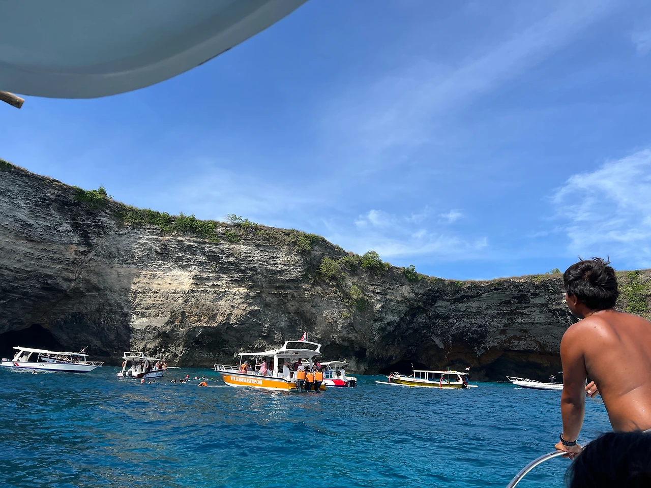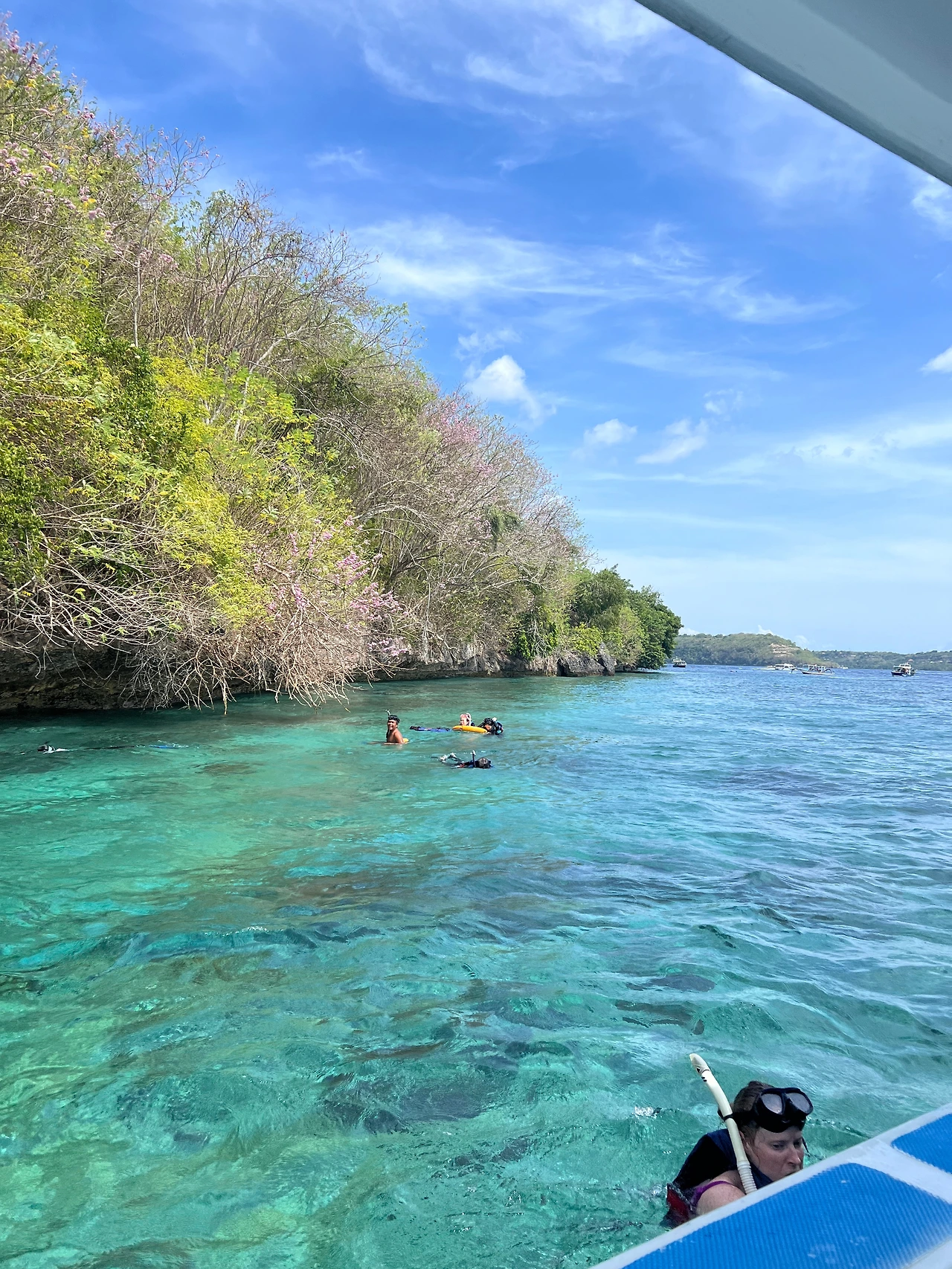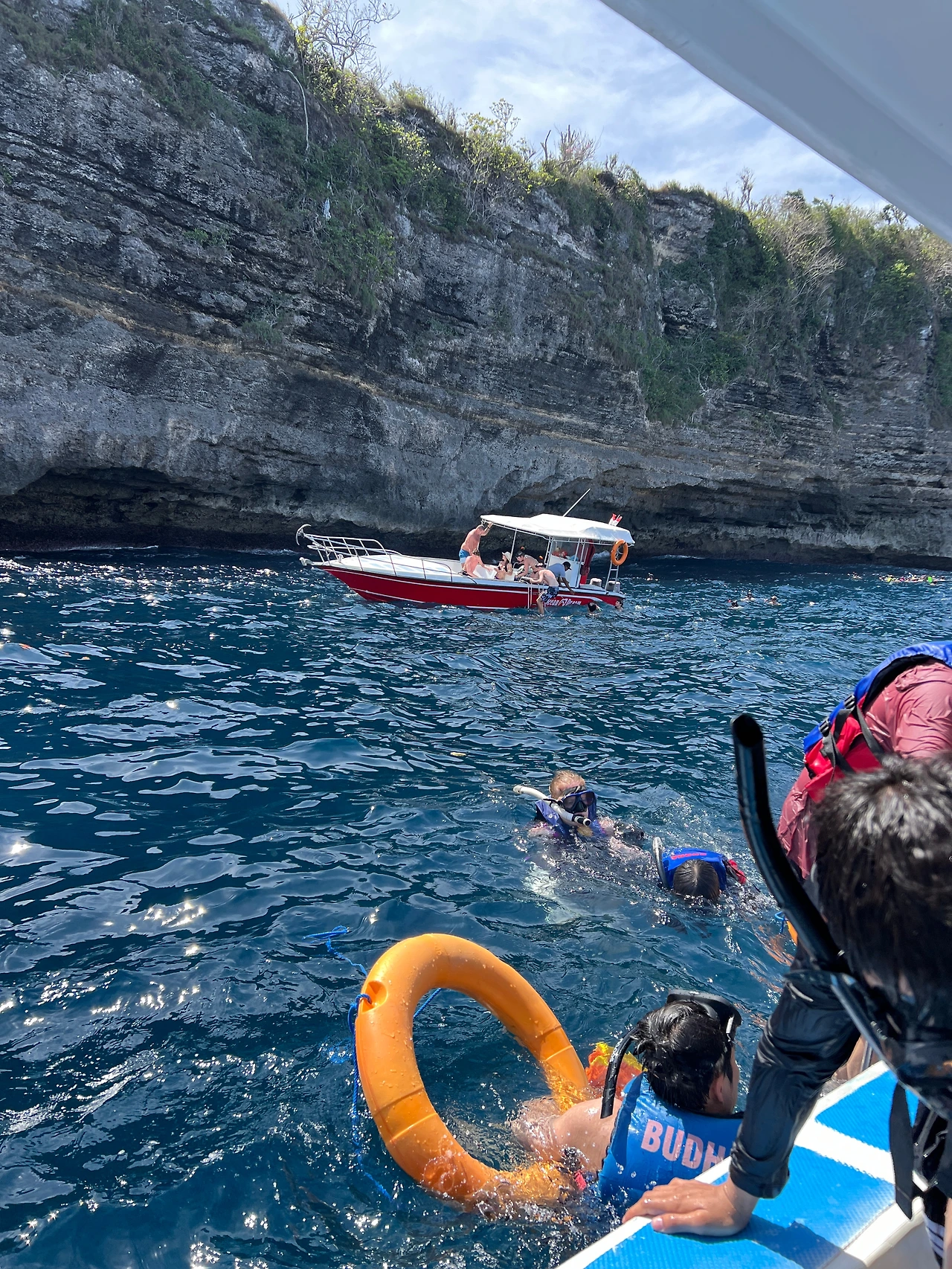 드디어 보트에 올라탔고 굉장히 유창한 영어를 쓰는 현지인 가이드와 함께 했다. 가이드들은 물과 간식을 나눠주었고, 스노클링 장비도 중간에 잘 안 쪼여져서 도와주고 물속에 들어가서도 수영을 잘 못하는 사람들을 위해 큰 튜브를 띄워 끌어주었다. 가이드가 같이 들어가니 안전함을 느꼈다. 누사 렘봉안과 누사 페니다의 세 포인트를 이동하면서 2시간 반동안 스노클링을 한다. 스노클링 포인트를 이동하는 길은 엄청 험하다. 파도가 세고 물이 다 튀긴다. 다행히 멀미약이 효과가 강해서 다행이었다.