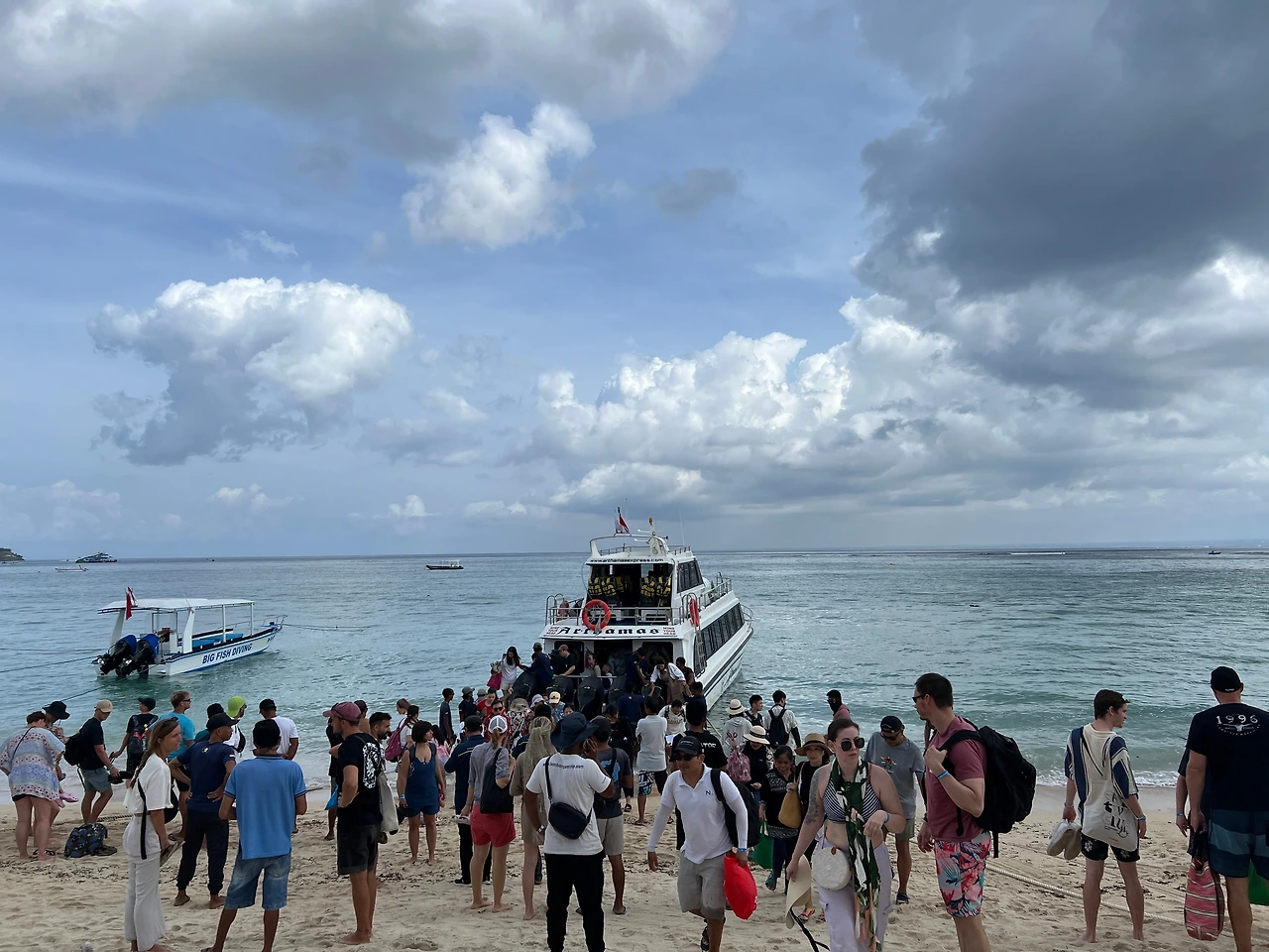 누사 렘봉안이라는 섬에 도착해서 우리는 또 큰 툭툭 같은 걸 타고 이동했다. 대학생 정도로 보이는 중국인 남녀 무리와 함께 탔는데 엄청 시끄럽다. 스노클링 배를 타는 곳에 도착해서 여러 무리들이 합류했는데 수영복을 입은 여러 인종의 사람들이 잔뜩 섞여 있다. 나도 원피스를 벗고 비키니 위에 구명조끼를 받아 입고 테이블에 앉아 대기했다. 오리발은 잠시 바닥에 두고서 물을 마시고 쉬었다. 지도를 켜보고 여기가 대체 어디지, 하고 내 위치를 나타내는 파란불이 껌뻑거리는 걸 의미 없이 쳐다보았다. 우리 테이블에 있는 곧 없어질 듯한 소두에 번 헤어를 하고, 새하얀, 그렇지만 여느 백인들처럼 점이 얼굴과 피부에 가득한 영국 여자와 굉장히 활달하고 뚱뚱한 아시아계 미국 여자와 스몰토크를 나누었다. 그들끼리는 영미권 국가여서 잘 통하는 것처럼 보였다.