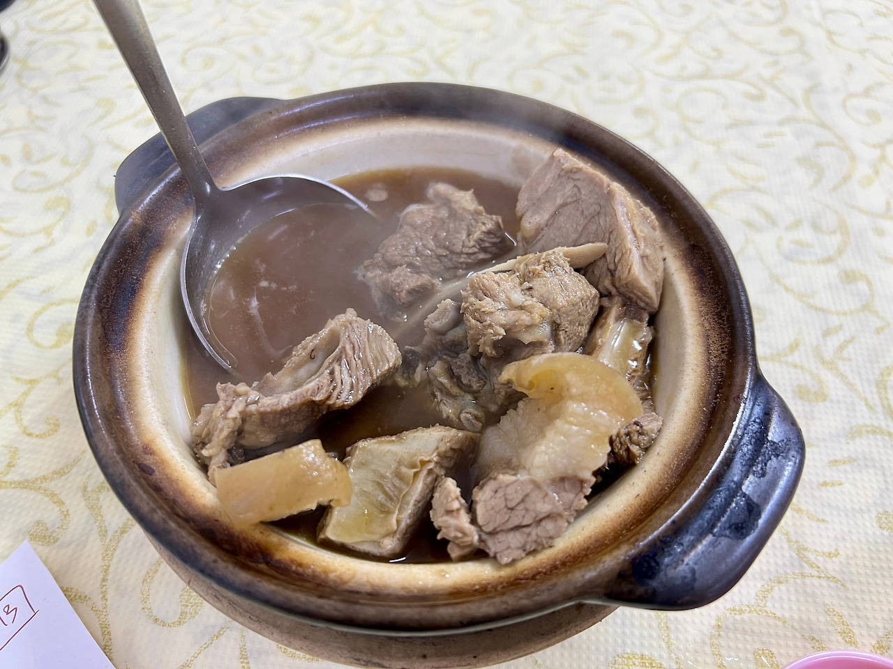바쿠테 국물을 한 입 떠먹어 보는데 맛있다! 왜 미슐랭인지 알겠다! 멀리 미슐랭 표시가 보이면서 고개를 끄덕인다. 고기는 굉장히 부드럽다. 한국인 입맛에 잘 맞는 맛이다. 갈비탕보다는 진득하고 갈비탕과 갈비찜 사이인데 갈비탕에 가깝긴 하다. 한방 향이 호불호가 있을 수 있다는 데 나는 한방 향에 익숙해서이기도 하고 향이 약하다. 한식하고 비슷한 맛이 나면서 다르다! 확실히 외국 음식이다. 그런데 시도해 보고 먹기 좋은 음식! 갈빗살이 너무 부드럽고 맛있어서 두 덩어리 정도 남기고 다 먹었다. 어느 정도 먹었을 때 눈에 들어온 옆에 곁들여 있는 다진 마늘과 고추 약간을 넣었더니 맛이 또 확 달라진다.