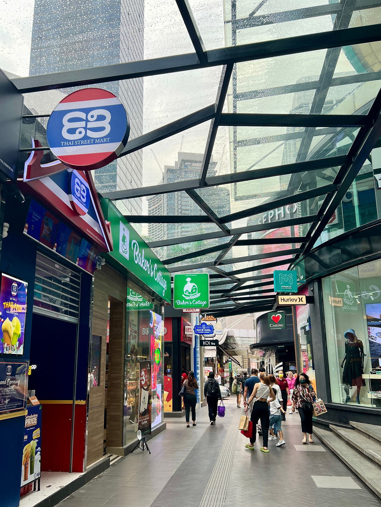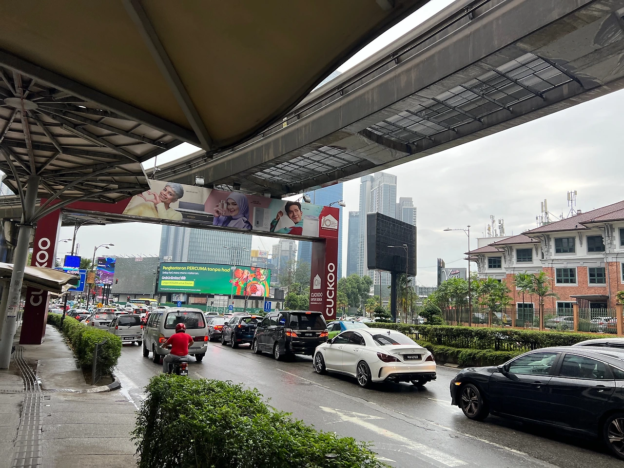 짐을 호텔에 맡기면 다시 돌아와서 역까지 가는 게 번거로울까 봐 그냥 들고 가기로 했다. 호텔에서 체크아웃을 하겠다고 다가가니, 예스 마담, 하면서 방을 점검하려고 까만색 무전을 친다. 금방 수색했는지 괜찮다며 보증금 50링깃을 돌려준다. 원래 100링깃인데 카드는 안된다 하구 내가 찾은 현금 100링깃은 스트렙실 사느라 깼다. 그럼 50링깃만 달라길래 줬다. 문지기 아저씨는 가는 길에도 문을 열어 주었다. 얇은 비가 추적추적 온다. 다행히 길을 건너니 차양막 같은 튼실한 구조물이 지하철 역까지 계속 있다. 더워서 인가 우기가 있어서 그런가. 다른 지하철역에도 계속 이어져 있어서 지하철역에서 내려서도 목적지까지 거의 젖지 않고 갈 수 있었다.
