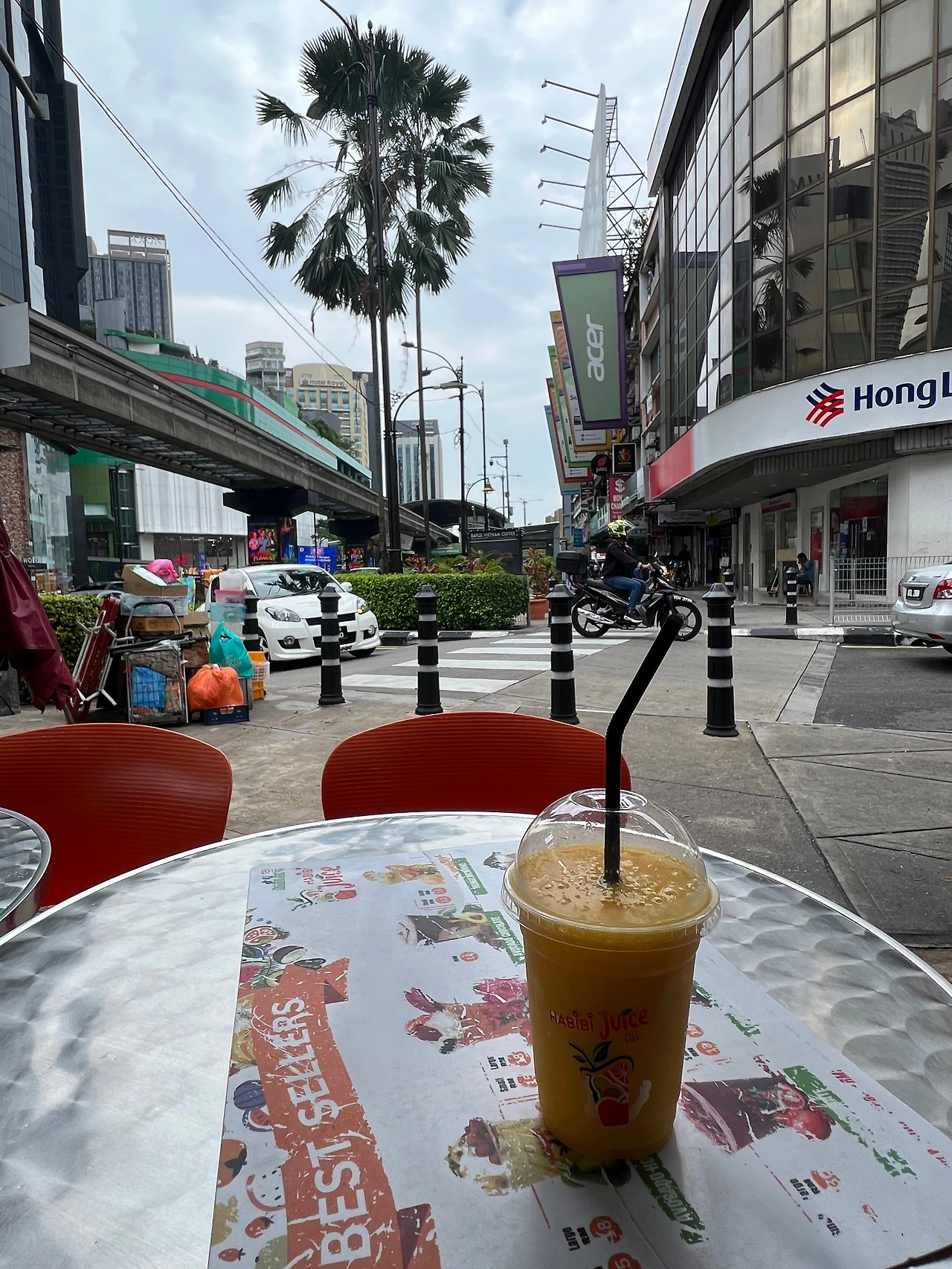 10링깃이다. 길이 바로 보이는 야외에 앉아서 기다린다. 잠시 뒤 달고 맛있는 노란색 망고 주스가 나왔다. 짐도 내려놓고 더위에 걷다가 힘든 걸 좀 가시게 하자, 하고 잠시 쉰다. 백인 남녀 두 명이 다가오더니 주스를 주문하려고 근처에 서 있다가, 내가 4명 자리에 가방을 놓고 앉아 있었던 터라 가까이 다가오길래 자리에 앉고 싶어 하는 줄 알고 가방을 집어서 옮기려고 했다. 그런데 여자는 내가 순간적으로 소매치기 등 위험으로부터 가방을 지키려는 조심스러운 행위를 한 줄 알고 Oh, Excuse me, 한다. 아, 나도 그러려고 하던 게 아닌데. 말하려 했지만 귀찮고 그들도 자리를 떴다.