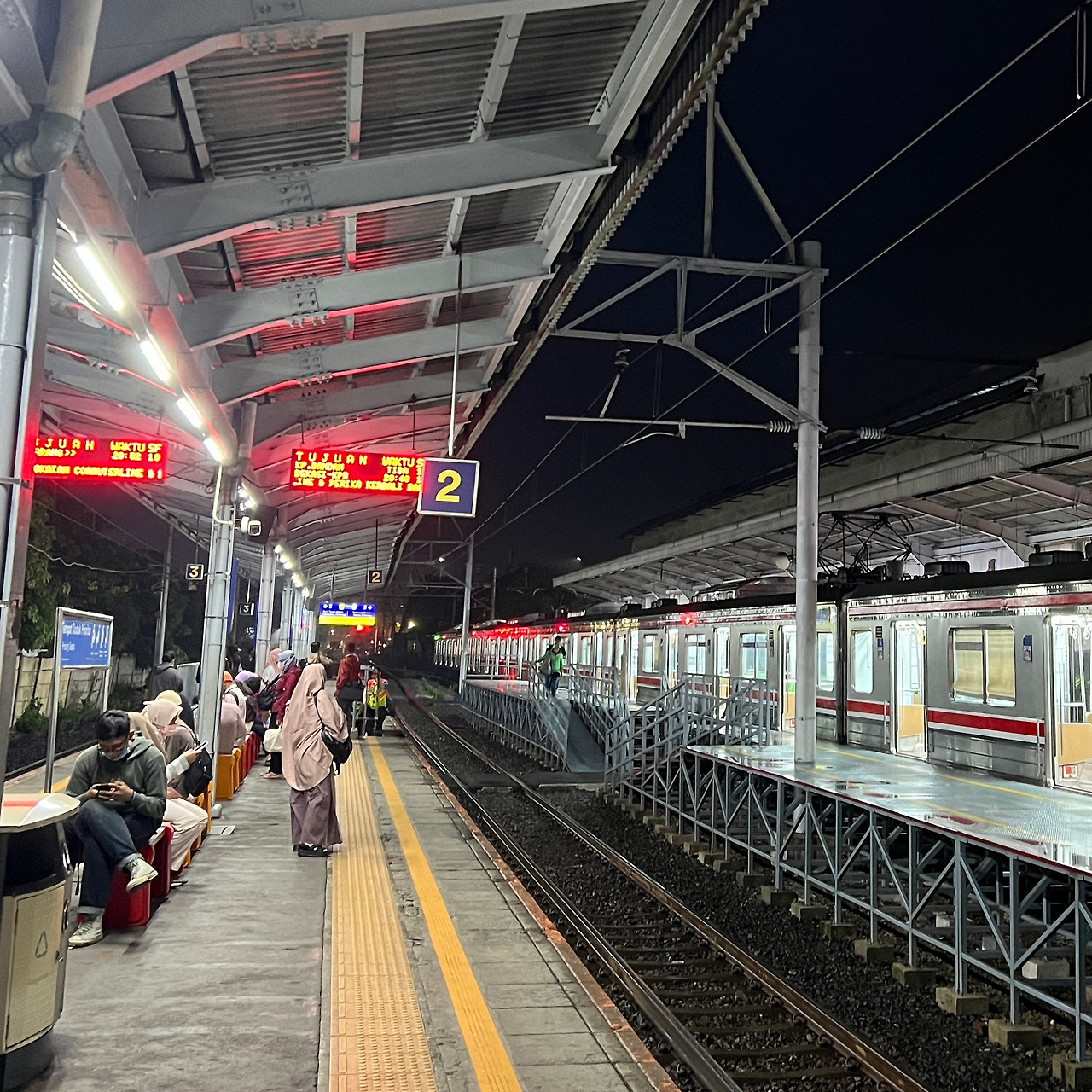 나를 도와준 율랴 덕분에 두리 역에 잘 도착했다. 이제 호텔 근처까지 하늘색 라인으로 갈아타 두 세정거장만 더 가면 된다. 벌써 어둠이 내렸고 더울 줄 알았는데 쌀쌀했다. 하늘색 라인으로 갈아타는 길은 명확히 눈에 들어오지 않았고 연두색 캐리어와 함께 여기저기 헤맸다. 2번으로 가라고 해서 왔는데 전광판을 봐도 헷갈린다. 구글 지도와 다르게 제 시간에 오지 않고 거의 30분을 기다렸다. 한국인, 아니 여행자는 나밖에 없고 다 현지인들이다. 자카르타 여행 내내 300원 정도 밖에 안하는 대중교통에서 나와 같은 외국인은 거의 없었다. 사람들은 점점 없어지고 이슬람 노랫소리만 꽹과리 치듯 요란하게 들린다.