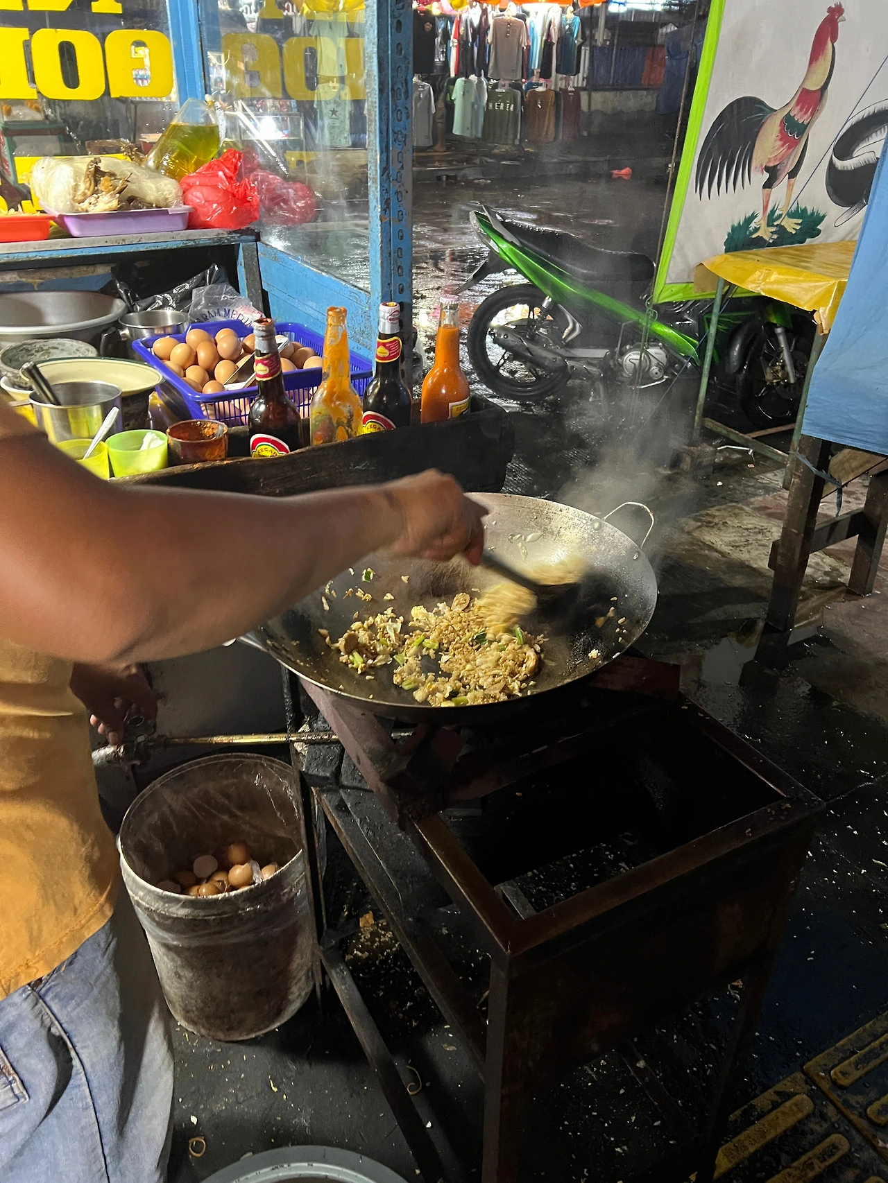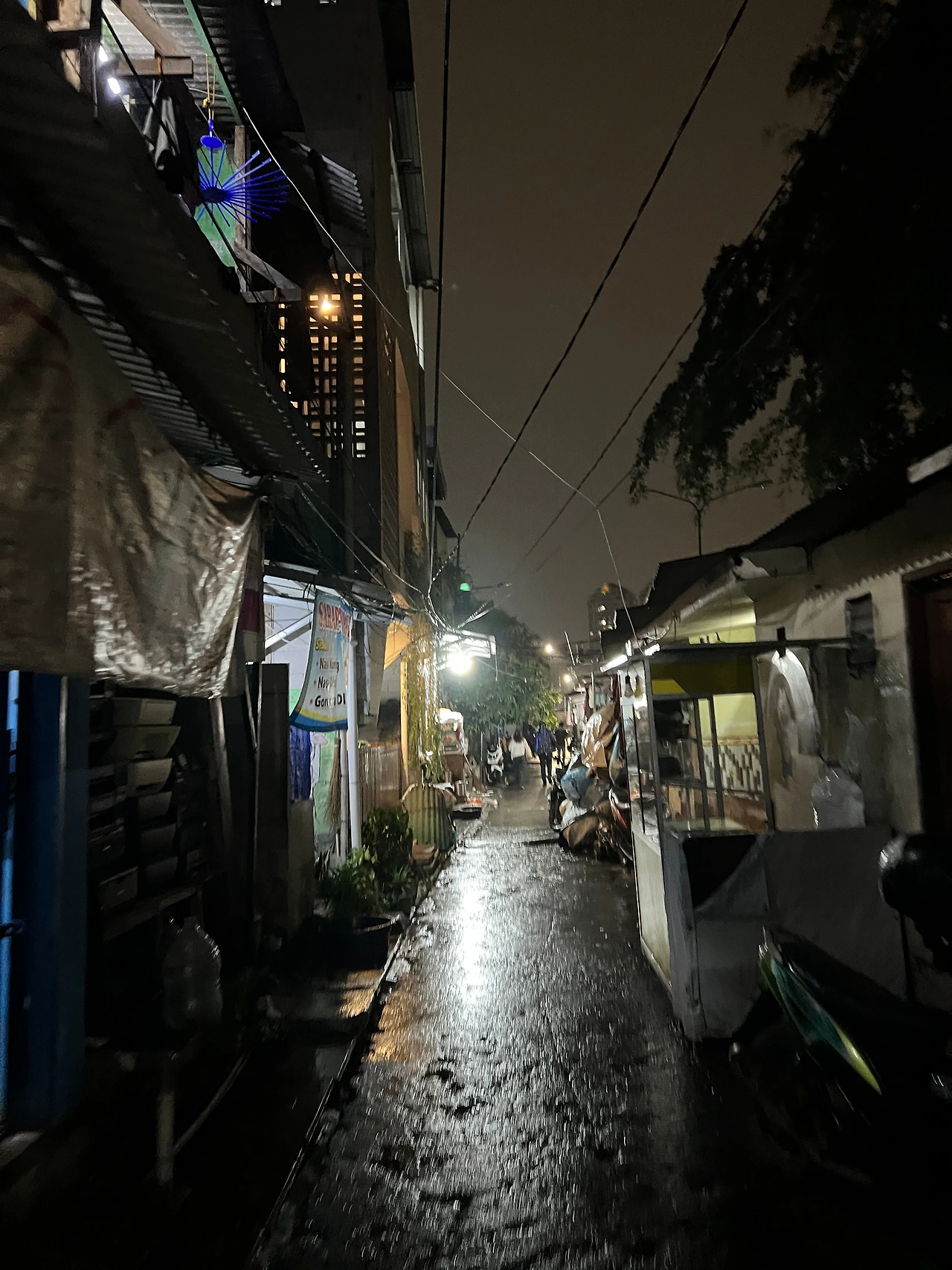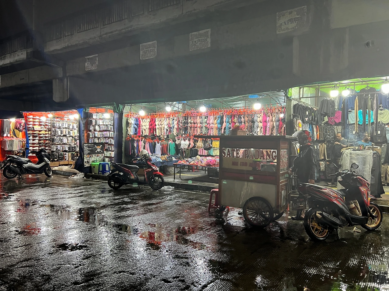 호텔은 4박에 11만 원으로 쌌다. 조금 돈을 더 주고 다른데 묵을까 했다가 지금 생각해 보니 그곳들도 딱히 위치가 좋진 않다. 일단 대충 정리하고 뭐 좀 사다가 먹자. 로비에 물어보니 야시장이 11시까지는 연다고 했다. 모자를 써도 비가 거세져서 무의미했다. 그래도 처음 인도네시아에 도착해서 새롭고 흥분되는 기분이 들었다.