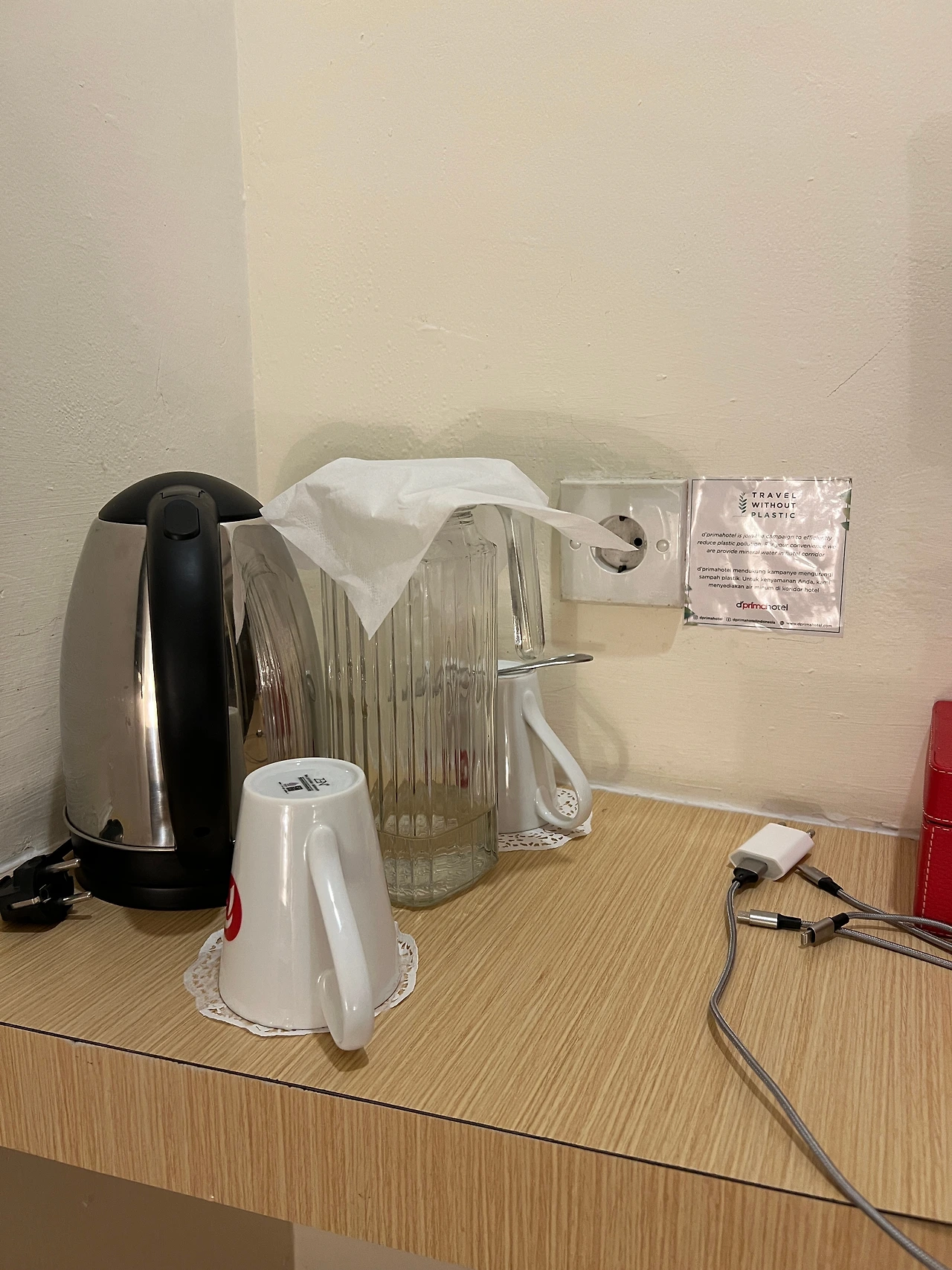 뭐야 물이 없네. 자세히 보니 환경을 생각해서 생수를 제공하지 않고 물병에 물을 떠서 마시라고 한다. 아 아까 복도에서 어떤 여자가 서 있던 곳이 정수기구나. 호텔 키 카드를 하나 들고 유리 물병을 가지고 나왔다. 정수기에서 물을 뜨는데 물이 안 나온다. 이렇게 누르는 게 아닌가? 온갖 것을 다 눌러봐도 안 나온다. 어떻게 사용하는 거지. 로비로 내려가 정수기 사용법을 묻는다. “이게 고장 난 건가요? 제가 잘 못 누르는 건가요?” 인도네시아인으로 20대 초반 정도로 보이는 어린 남자 직원은 당황하더니 잠깐 기다리라면서 같이 가보자고 한다. “이걸 누르는 게 맞나요?” 하고 누르며 말했다. 그러면서 또 잠시 기다리라고 하며 당황한 표정을 짓는다. 다른 층에 뛰어갔다 오더니 커다란 물병을 가져온다. 옛날에 많이 보던 정수기에 채우는 플라스틱 물병. 직원은 정수기 밑에를 열쇠로 열더니 빈 플라스틱 물병을 빼고 새 물을 채워 넣는다. 아 이게 생수를 넣는 이런 정수기였어? 아래에서 빨아 올리네. “감사합니다.” 인사를 하고 새 물을 2/3 정도 유리병에 따라서 방으로 들어간다.