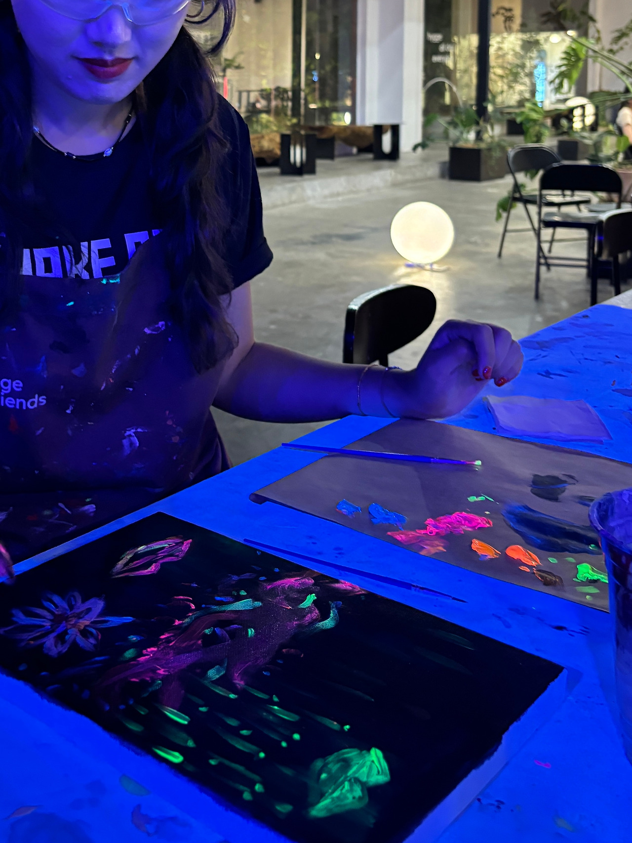 7시 조금 넘자 베트남 소녀는 UV 페인팅을 위한 세팅을 한다. 불을 끄고 LED조명 같은 파란색 불을 켠다. 다른 예시 그림을 보는데 너무 멋지다. 베트남 소녀는 오늘 내 수업의 선생님이다. 영어를 굉장히 잘해서 물어보니 외고 같은 걸 나왔다. 하노이에 있는 아트 스쿨 대학생이다. 와 만나서 반가워요! 수업에 선생님과 나 둘 뿐이라 이런저런 얘기를 많이 나눴다. 베트남은 아직 학기 중이며 저녁에 아르바이트를 하고 있는 것이라고 했다. 소녀는 어머니를 따라 여러 나라를 가봤고 일본도 가봤다. 베트남 월급에 외국 여행을 안 가본 사람이 더 많지 않을까, 생각하고 물어봤는데 아니었다. 부잣집 딸인가.
