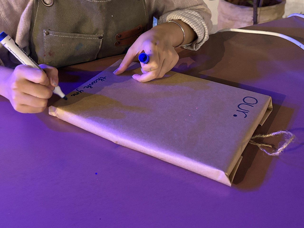 소녀는 내 사진을 찍어도 되냐며 찍고 나도 내 핸드폰으로 몇 장 찍어달라고 했다. “이만해도 되겠어요. “ 오른쪽 맨 밑에 내 낙관도 쓰고 마무리했다. 소녀는 글리터를 하겠냐고 해서 해달라고 하니 그림 전체에 뿌려준다. 움직일 때마다 반짝반짝 빛난다. 현지인과 대화도 나누고 여러 카페, 맛집 추천도 받았다. 전시에 관심이 있냐면서 인스타그램을 막 찾더니 괜찮은 팝업 전시가 있으니 가라고 주소도 알려 준다. 그리고 그림을 황토색 도톰한 종이로 싸서 호치키스도 찍어 준다. 와, 집에다가 잘 전시해 놔야지.