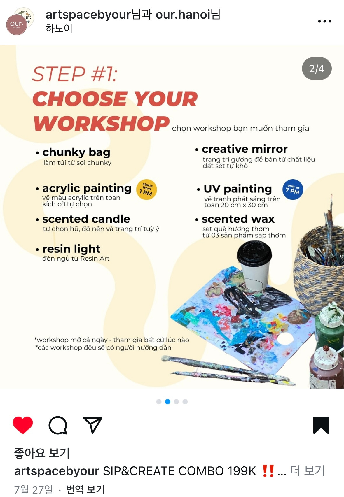 발리에서 그림 그리는 클래스가 너무 재미있고 색다른 경험으로 좋았어서 하노이 여행에도 인스타그램 등을 통해 페인팅 클래스를 찾아보았다. 그중에서 한 카페에서 진행하는 199동에 음료 한 잔과 원하는 활동에 참여할 수 있는 프로그램을 봤다. 아크릴 페인팅이나 UV페인팅을 해보고 싶은데 UV 페인팅 활동 사진을 보니 감각적이고 아름답다. DM을 보내서 다음날 예약할 수 있냐고 물었는데 흔쾌히 가능하다고 너무 친절하게 답장이 온다.