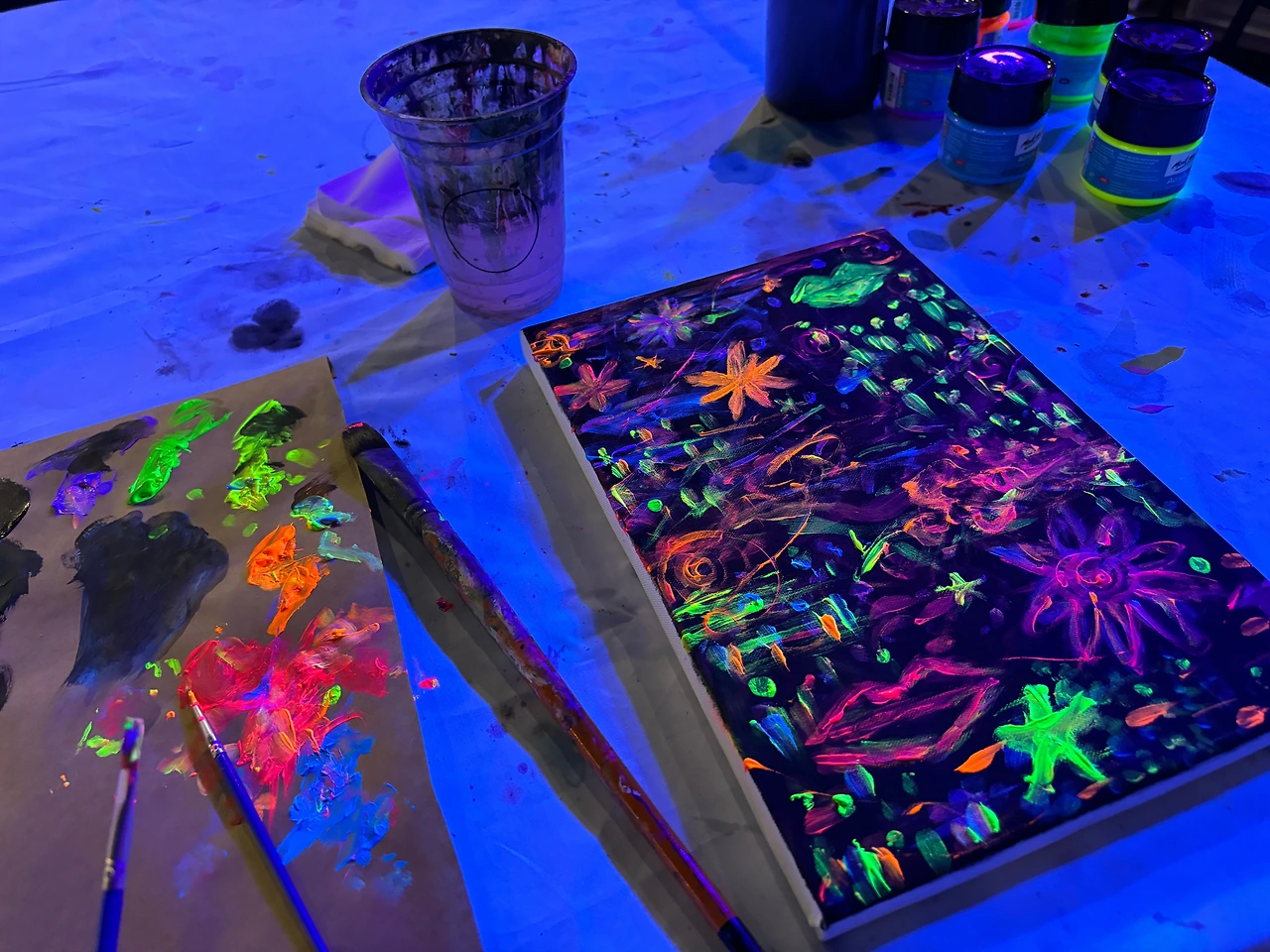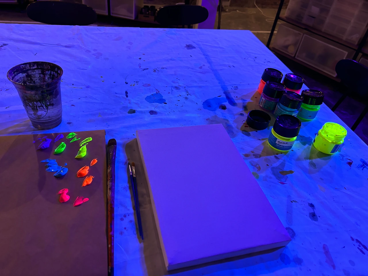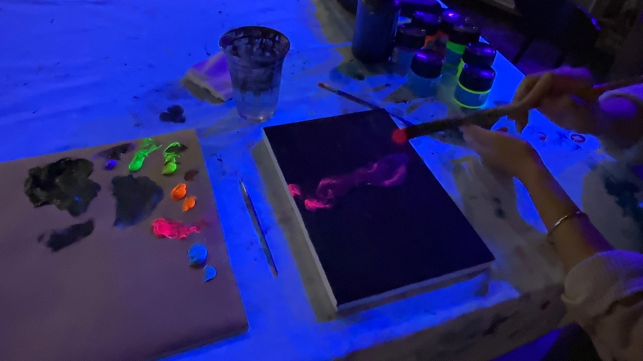 소녀는 먼저 물감을 짜줬다. 조명 아래에 형광색으로 빛나는 핑크, 연두, 노랑, 하늘, 보라색을 조금씩 짜주고 검은색 물감을 짜주며 하늘색이나 보라를 조금 섞어 바탕색으로 칠하라고 안내해 준다.