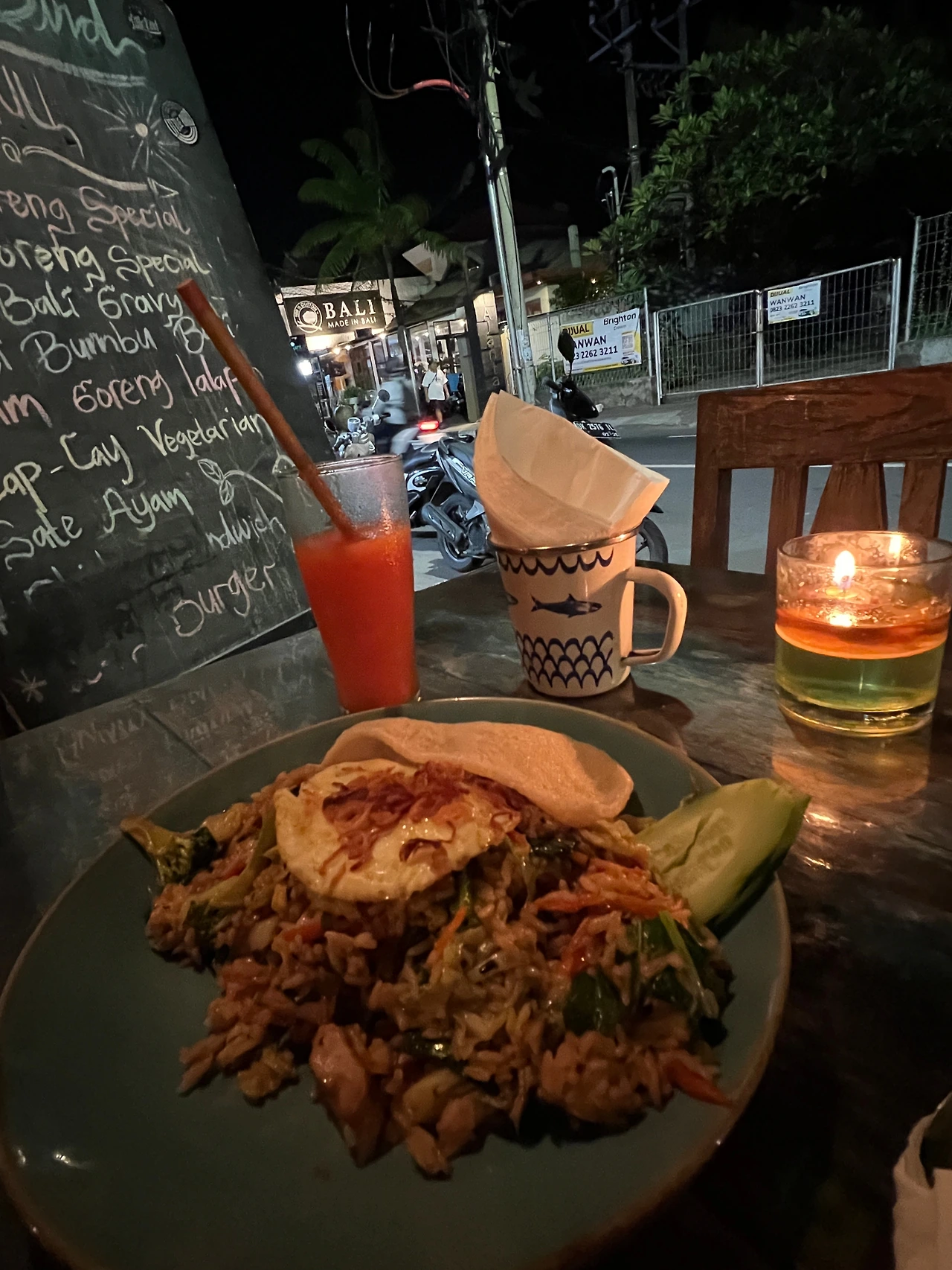 길을 가다 30-40대로 보이는 백인들이 앉아서 저녁 시간을 즐기는 분위기 있는 식당이 있어 들어갔다. 길 바깥으로 오픈되어 있는 식당으로 나시고랭을 팔았다. 음료는 음, 망고 주스를 먹을까 하다가 파파야 주스가 눈에 보이길래 왠지 먹어보고 싶어 맛있냐고 물어보니 맛있다고 확신 있게 말하는 반응이 괜찮아 그럼 설탕을 빼고 만들어 달라고 했다. 예쁜 새콤달콤색 진홍색 음료가 나왔는데 달콤하고 맛있다. 파파야주스도 맛있구나? 동남아에 오면 시키는 나의 음료 리스트 1. 망고 2. 코코넛 3. 아보카도에 4. 파파야가 추가되었다.