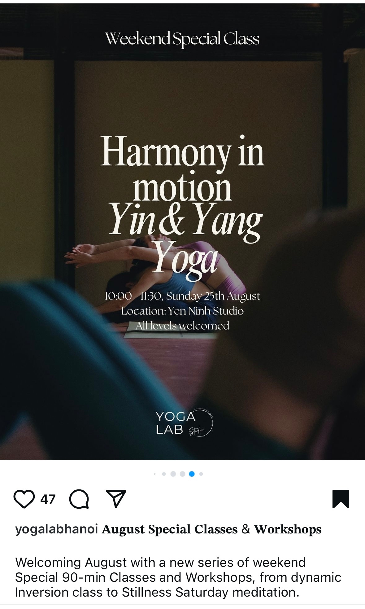 발리 우붓에서 요가가 너무 분위기 있고 몸도 개운하고 좋았어서 하노이 여행에서도 요가를 검색했다. 구글하고 인스타로 검색하다 영어로도 수업을 하는 곳을 발견해서 예약했다. 금요일 밤에는 yin yoga & qi gong이라는 수업, 일요일 오전에는 yin & yang 클래스다.