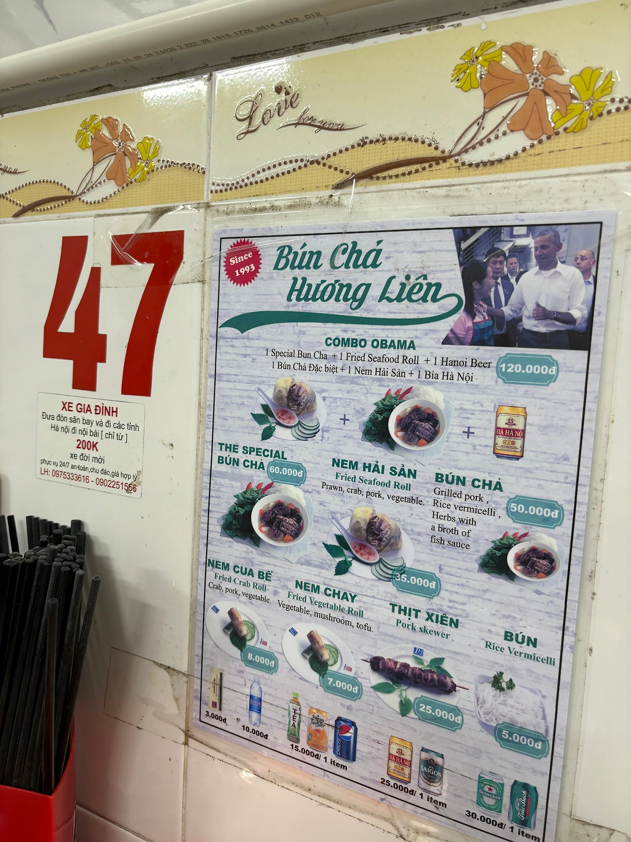 하노이엔 미슐랭 음식점이 많고 대부분 걸어서 갈 수 있는 곳들이다. 3천 원 대 쌀국수부터 저렴하게 즐길 수 있는 미슐랭들도 꽤 있다. 고급 미슐랭 식당도 1인 1-2만원대면 먹는다. 오바마 분짜는 페인팅 클래스에서 만난 현지 대학생 소녀가 추천해 준 곳으로 어릴 때부터 가족하고 분짜는 여기서만 먹는다고 해서 굳이 찾아가기 귀찮아서 안 가려 했다가 시간도 많으니 가자, 하고 찾아가 보았다. 오바마를 적극적으로 내세워 흥행한 듯 보인다. 관광객들이 벽에 걸린 오바마사진 하고 같이 사진을 찍는다. 사람이 많아 4층까지 올라가서 먹었는데 아예 오바마 세트 메뉴가 있다.