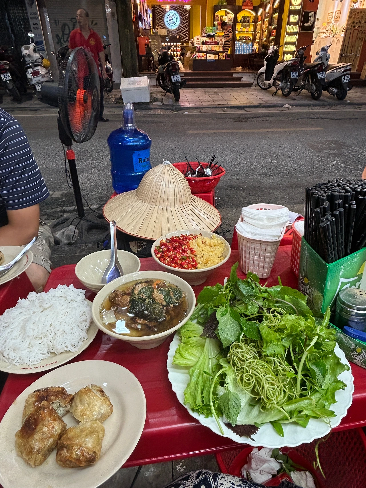 분짜닥킴이라는 분짜집도 미슐랭인데 간단하게 먹으려 했는데 아줌마가 적극적으로 영업하며 스프링롤까지 있는 세트 메뉴를 먹으라 해서 양이 분명히 많을 텐데도 6천 원 밖에 안 하니(그래도 에어컨 나오는 레스토랑에서 먹어도 6-7천 원인데 길에서 먹는 것치고 비싼 것이다) 그냥 시켰다. 정말 맛있게 먹은 3천 원짜리 넴루이 집도 그렇고 신선한 채소가 나오는 게 너무 좋다. 근데 채소를 너무 많이 줘서 이거 너무 많아요, 하고 말했는데 못 알아듣고 가서 많이 남겼다. 재사용할 것 같은데 내가 손으로 막 뜯고 남은 것, 이것도 재사용된 거겠지?