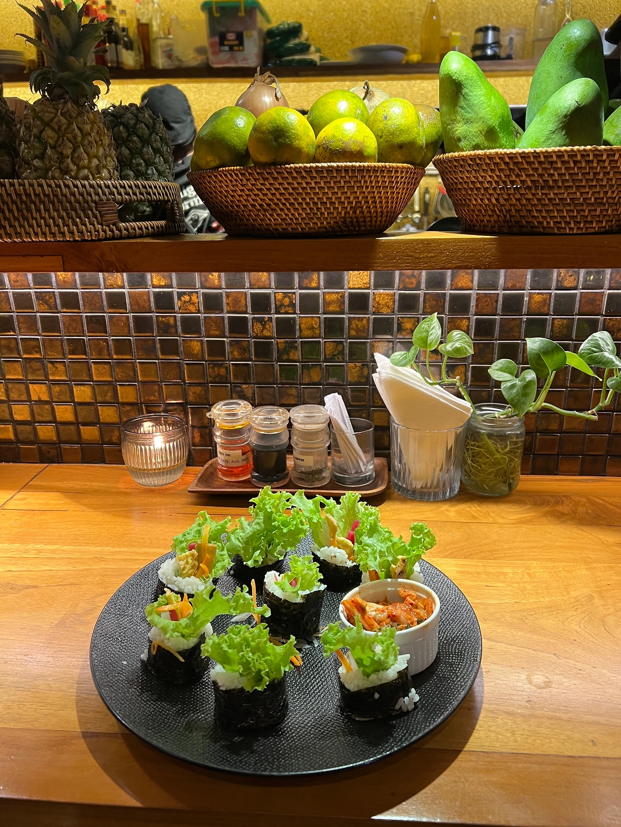 김밥이 도착했는데 이렇게 썰려서 플레이팅 된 김밥이라니, 너무 재밌잖아! 하고 사진을 찍었다. 두껍게 썰린 덩어리씩 한 덩어리 당 상추잎이 꽃처럼 피어난 형태인데 어떻게 이렇게 만들었지? 하고 호기심이 생겼다. 한 입 먹어보는데 와, 너무 맛있다! 한국 김밥 맛하고 거의 비슷하다.