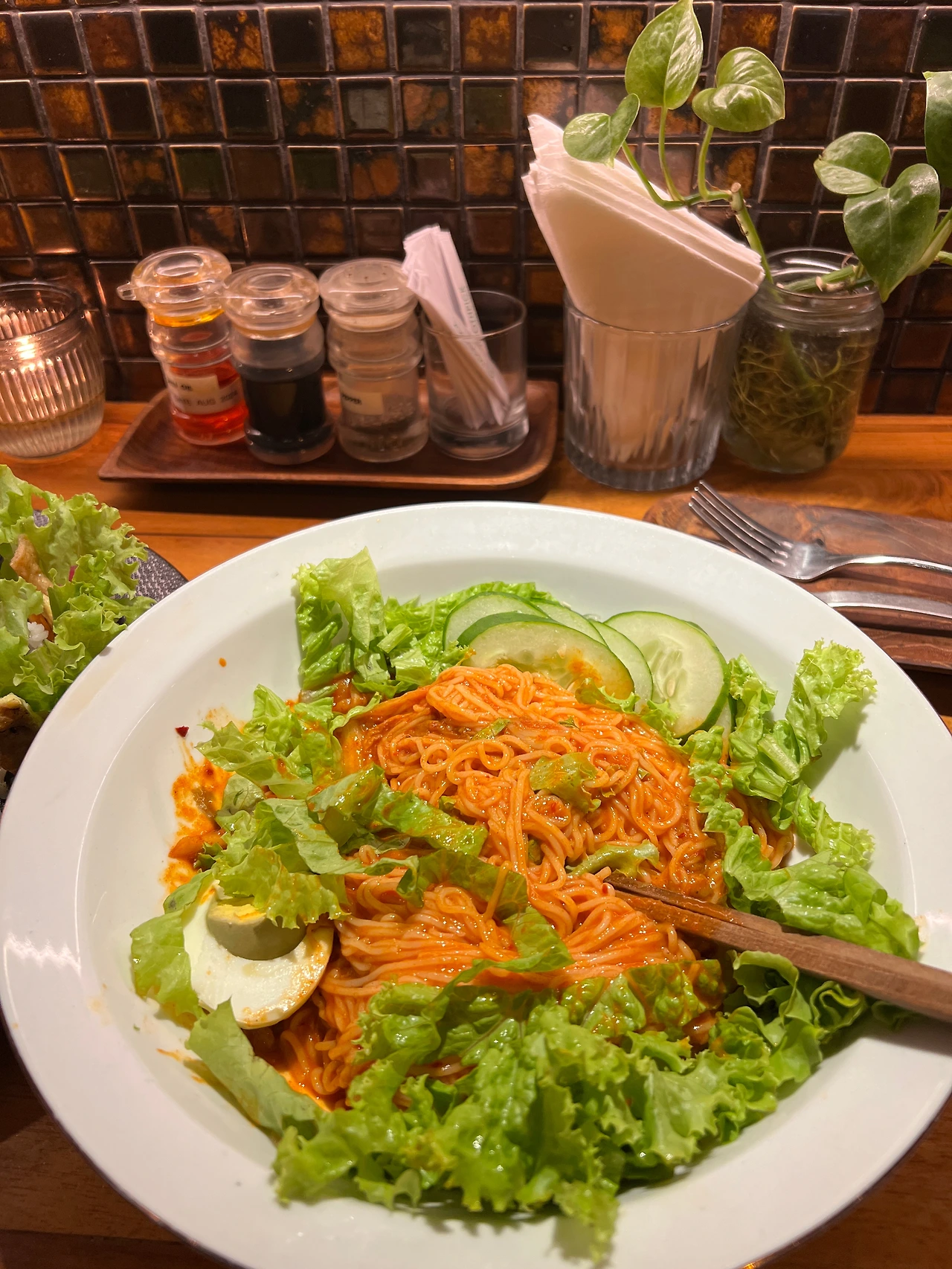 김밥을 거의 다 먹어갈 무렵 비빔국수가 나왔다. 비빔국수를 가져다준 직원에게, “와, 김밥 너무 맛있어요. 그리고 생김새가 너무 창의적이에요! 한국인이 만든 건가요?” 하고 물으니 인도네시아인인 젊은 여자 직원이 기뻐하며 고맙다고 했다. 그러면서 여기 요리사들 중 한국인은 없다고 했다.