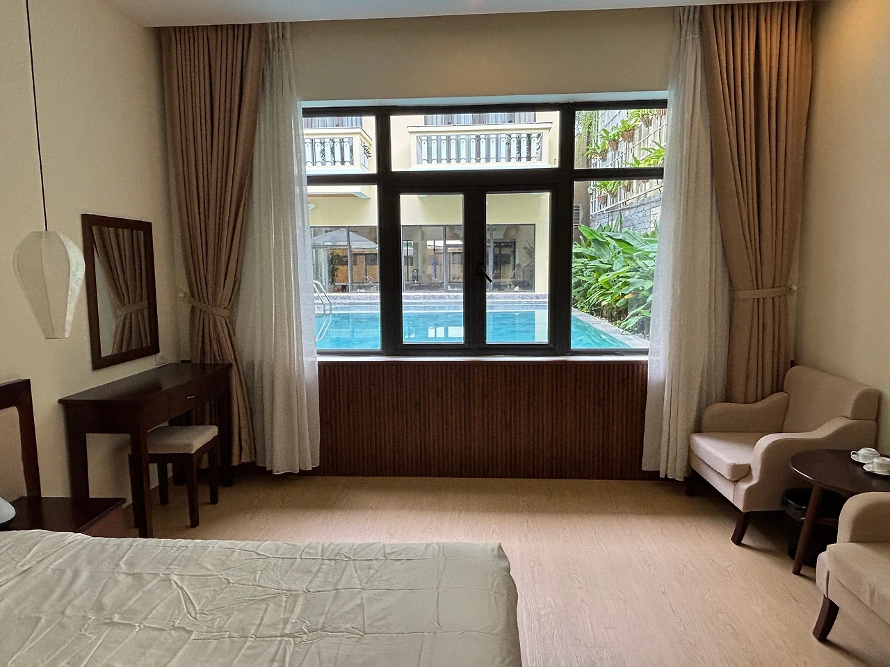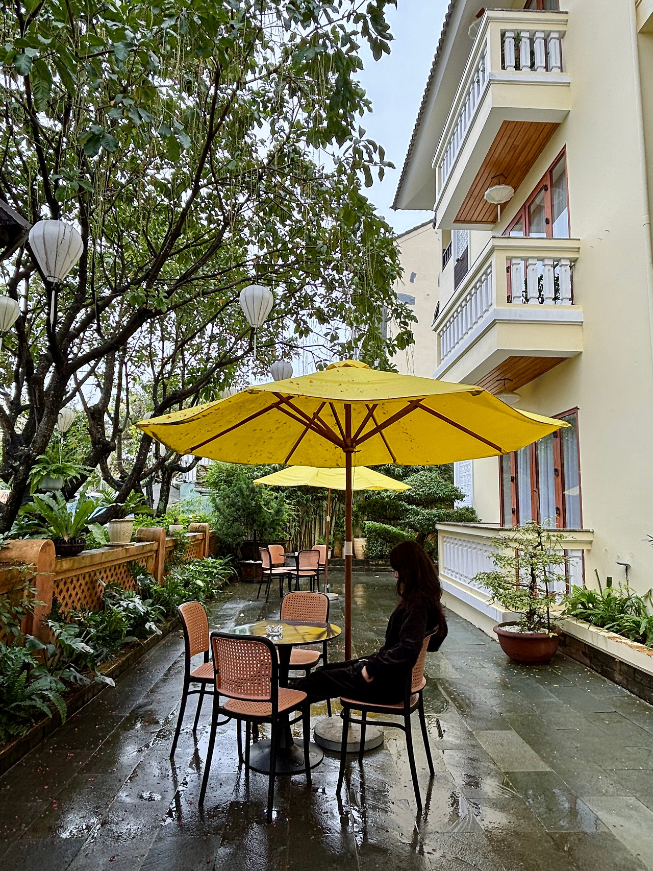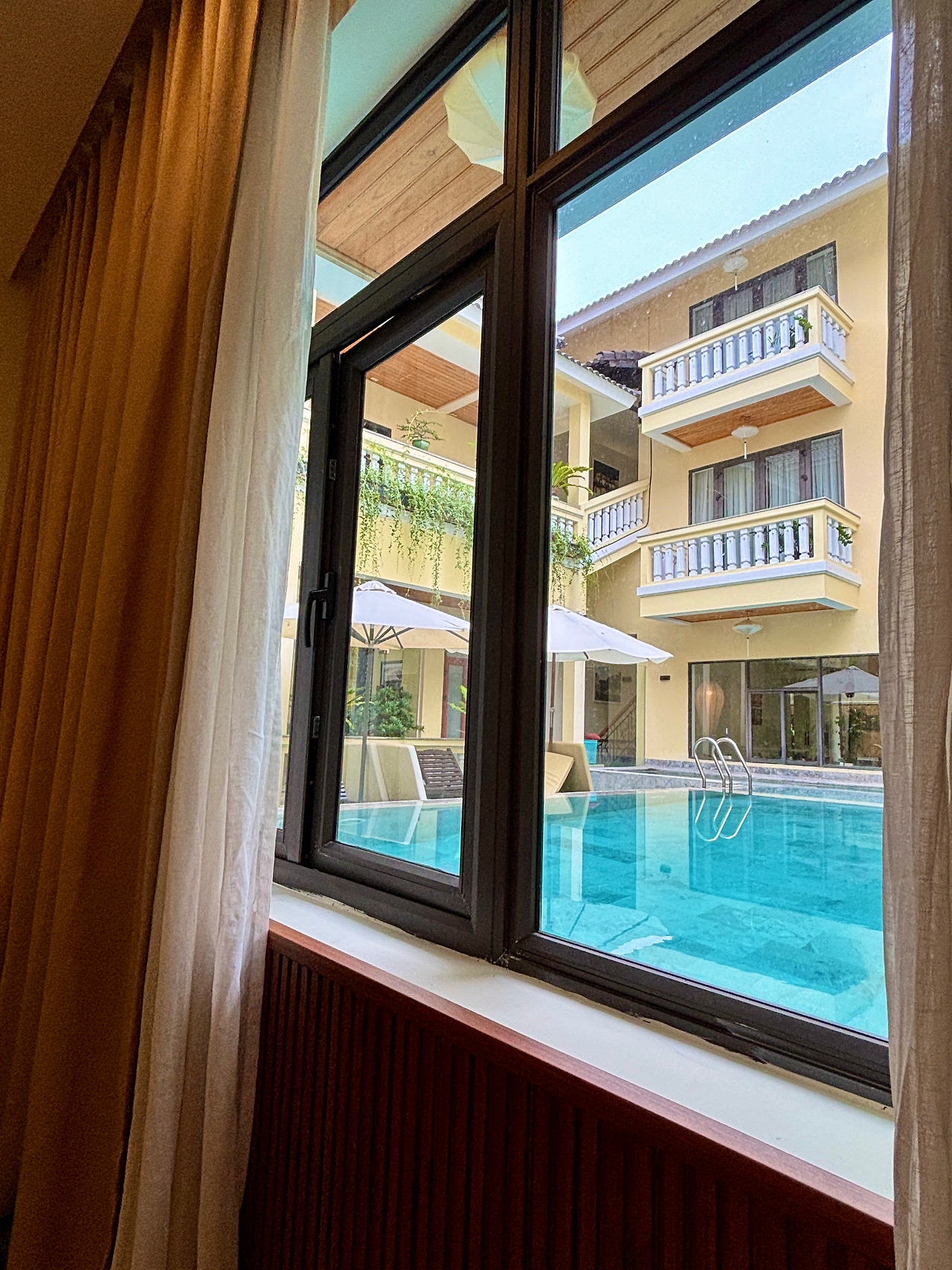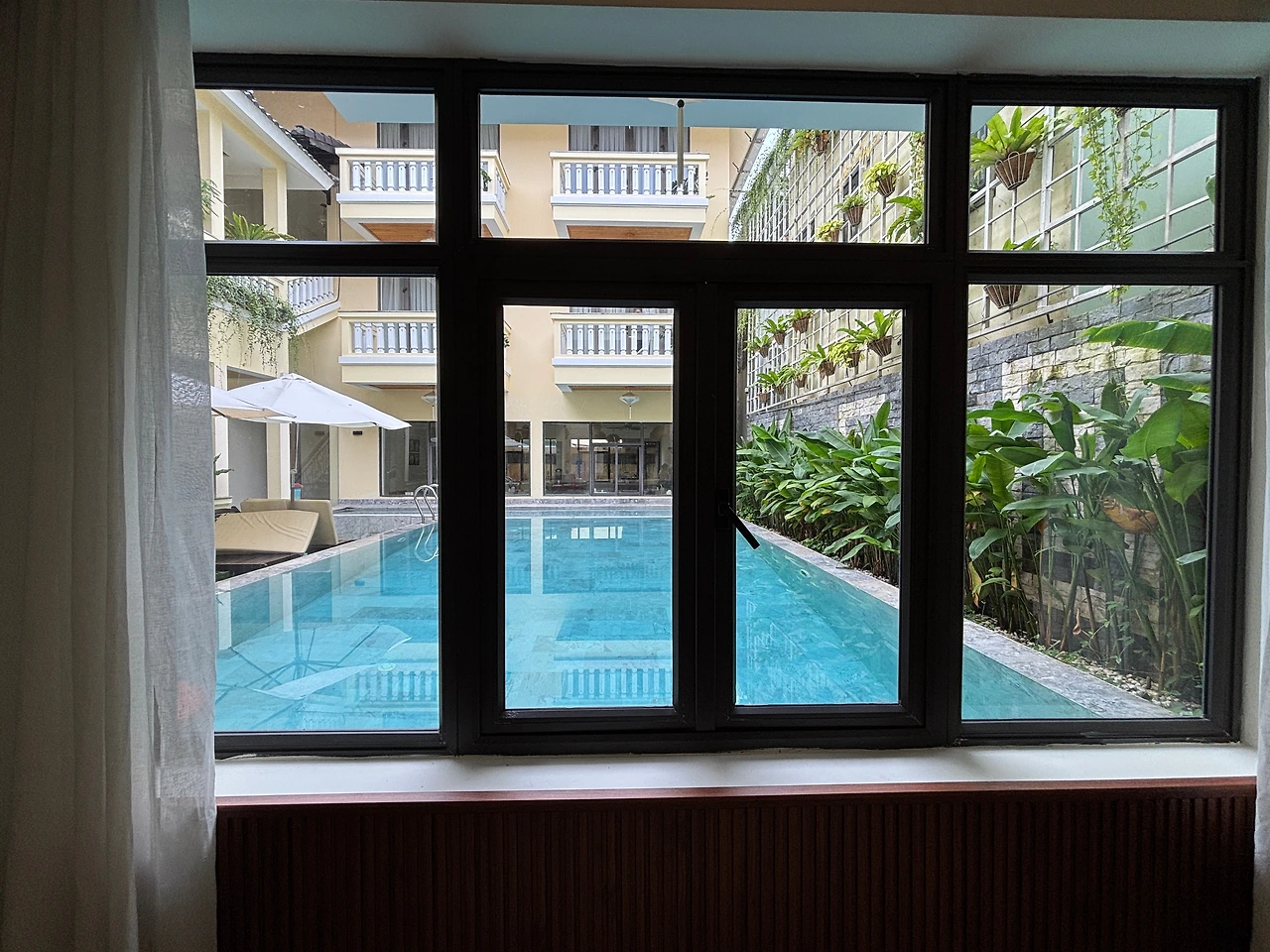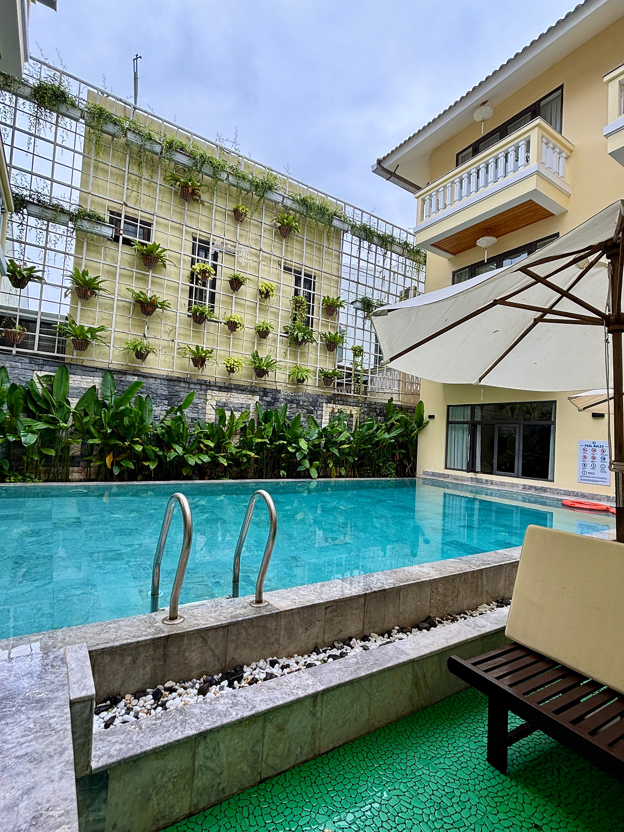 리셉션에 있는 베트남 여자 직원에게 이름을 말했더니 방이 꽉 차서 청소를 해야 해서 지금은 체크인이 안되고 1시 이후에 오면 가능하다고 했다. 혹시나 침대 두 개 짜리로 바꿀 수 있냐고 물었는데, 역시나 방이 꽉 차서 어렵다고 했다. 여느 베트남 호텔 리셉션 직원과 마찬가지로 영어가 잘 통하고 친절하다. 일단 짐을 맡기고 점심을 먹으러 나가기로 한다. 잠깐 둘러보는데 수영장이 있는 풍경이 너무 예쁘고 아늑하고 깨끗하다. 밥을 먹으러 나가는 길에 야외 테라스에서 사진을 찍었다. 세수도 안 하고 머리도 안 감았지만 처음 도착해서 예쁜 배경에서 사진을 찍으면 기분이 좋다. 기분이 정화가 된다.