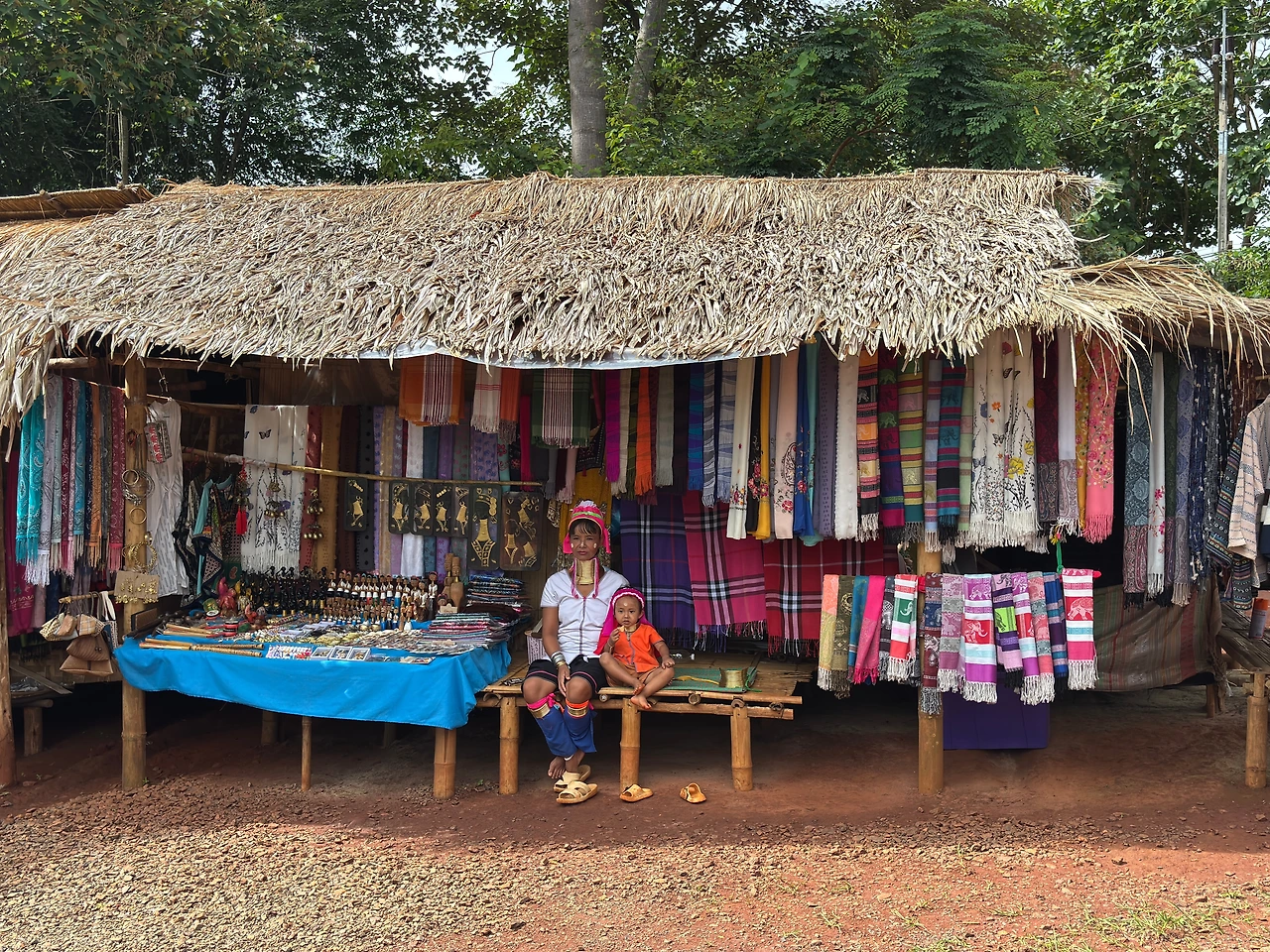 사진만 찍고 휙 하고 가버리는 건 인지상정이 아니니 팁을 주거나 물건을 구입해야 하는데, 이왕이면 기념품을 하나 사기로 한다. 그래도 롱넥 부족이라고 하니 목에 링을 낀 여성을 모티브로 한 목각인형을 사기로 한다. 제일 작은 건 100바트, 중간은 150, 큰 건 200바트이다. 와, 되게 비싸네. 그래도 중간 정도 되어야 예뻐서 빨간색 스커트 색깔을 한 목각 인형 하나를 산다. 그렇게 천막 부스?가 죽 이어져 크게 한 바퀴를 돌면 관광이 끝나는데 좀 이색적인 아이템이 있으면 사주려고 했는데 그냥 시내에서도 볼 수 있는 뻔한 태국 코끼리 파우치라든가 목각 인형도 다 똑같은 걸 판다. 좀 차별화라도 되면 골고루 사줄 텐데 판매 전략이 아쉽다.
