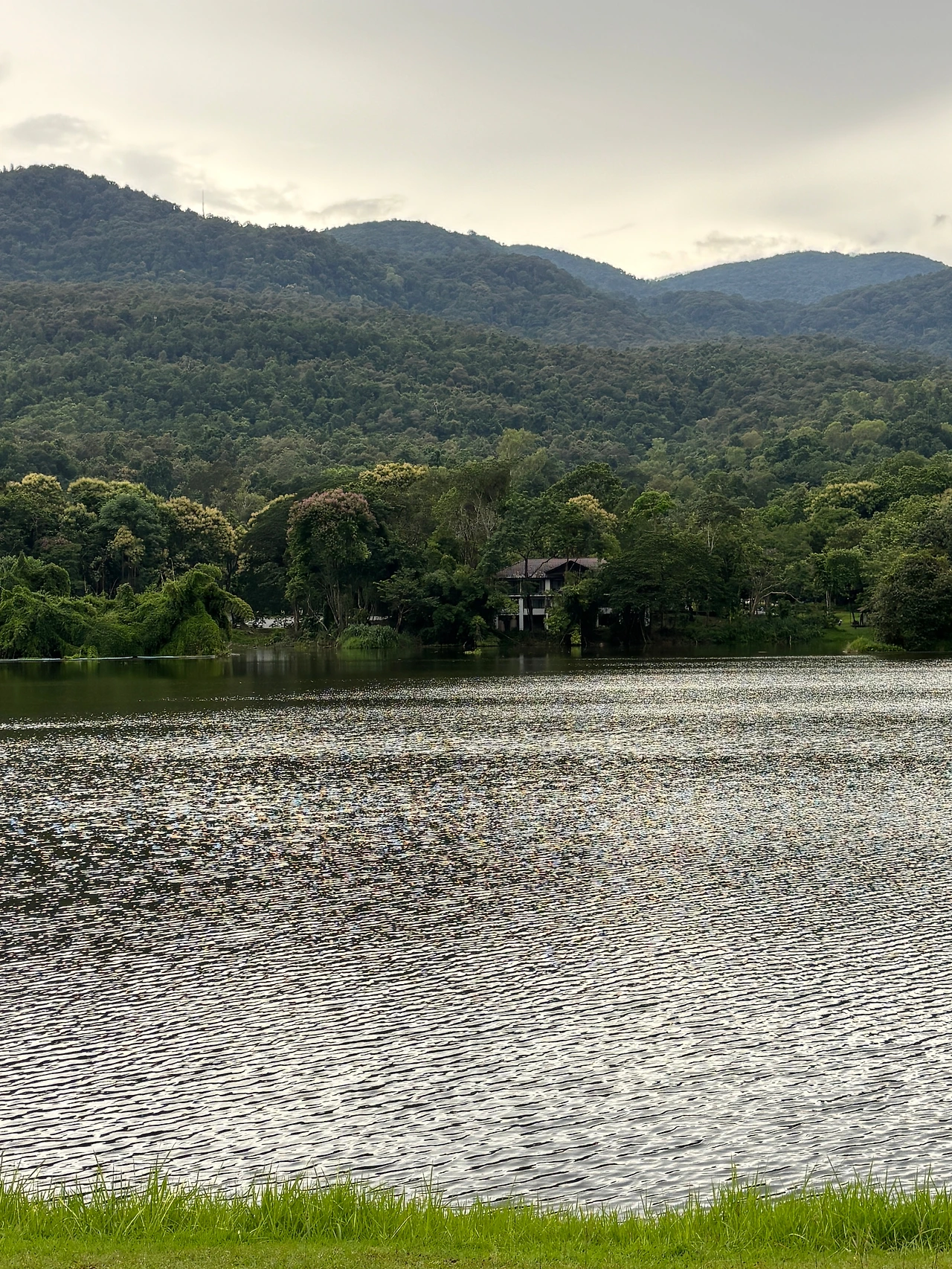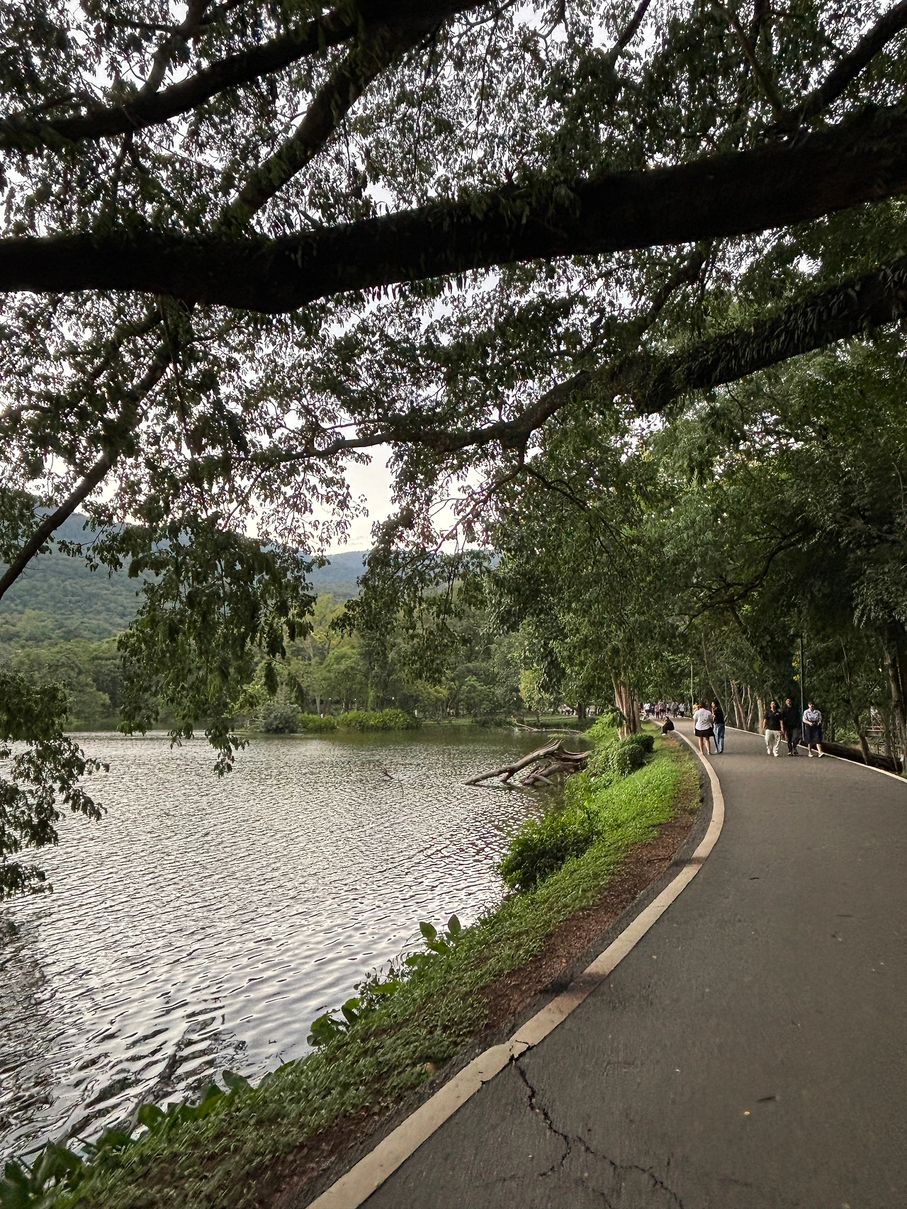 앙깨우 호수까지 걸어가는 10여분은 평지여서 힘들지 않은 데다 날씨도 선선해서 좋다. 호수 근처에는 시야가 뻥 뚫리게 연두색 잔디가 깔린 넓은 언덕 같은 게 보이고 그 위를 따라 올라가면 호수가 보인다. 아 저수지와 호수의 차이는 뭐지? 난 그냥 호수라고 할래. 하늘과 호수를 둘러싼 산과, 잔잔하게 움직이는 호수가 마음을 안정시킨다. 시원한 바람도 부니 기분이 좋다. 벌써 사람들이 많다. 학생들도, 관광객들도 있다. 트랙이 있어서 운동복을 입고 조깅을 하는 사람들 슬슬 보인다. 여기서 선셋을 본다고 하던데 그때까지 앉아서 기다리기에는 지루해서 포기하고 나도 한 바퀴 돌아본다. 아주 약간 빗방울이 떨어지는데 거슬리지는 않는다. 내 뒤에 한국어가 들린다. 중년의 한국 아저씨 아줌마들이 여행을 온 건지 선교를 온 건지 교인들인 것 같다. 여기가 치앙마이인지 한국인지 모르겠다. 지금은 가방도 무겁고 신발도 운동화가 아닌데 다음에는 짐을 두고 지퍼가 있는 반바지에 핸드폰 하고 돈 여분만 꾸겨 넣고 와서 조깅을 해야겠다고 생각했다.