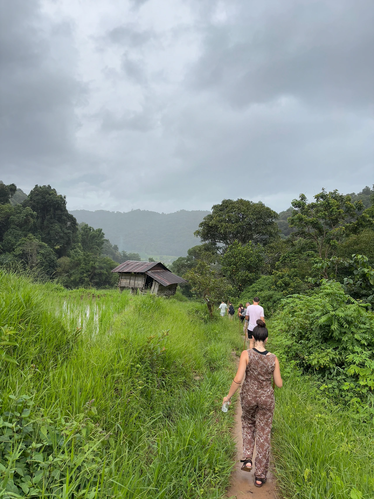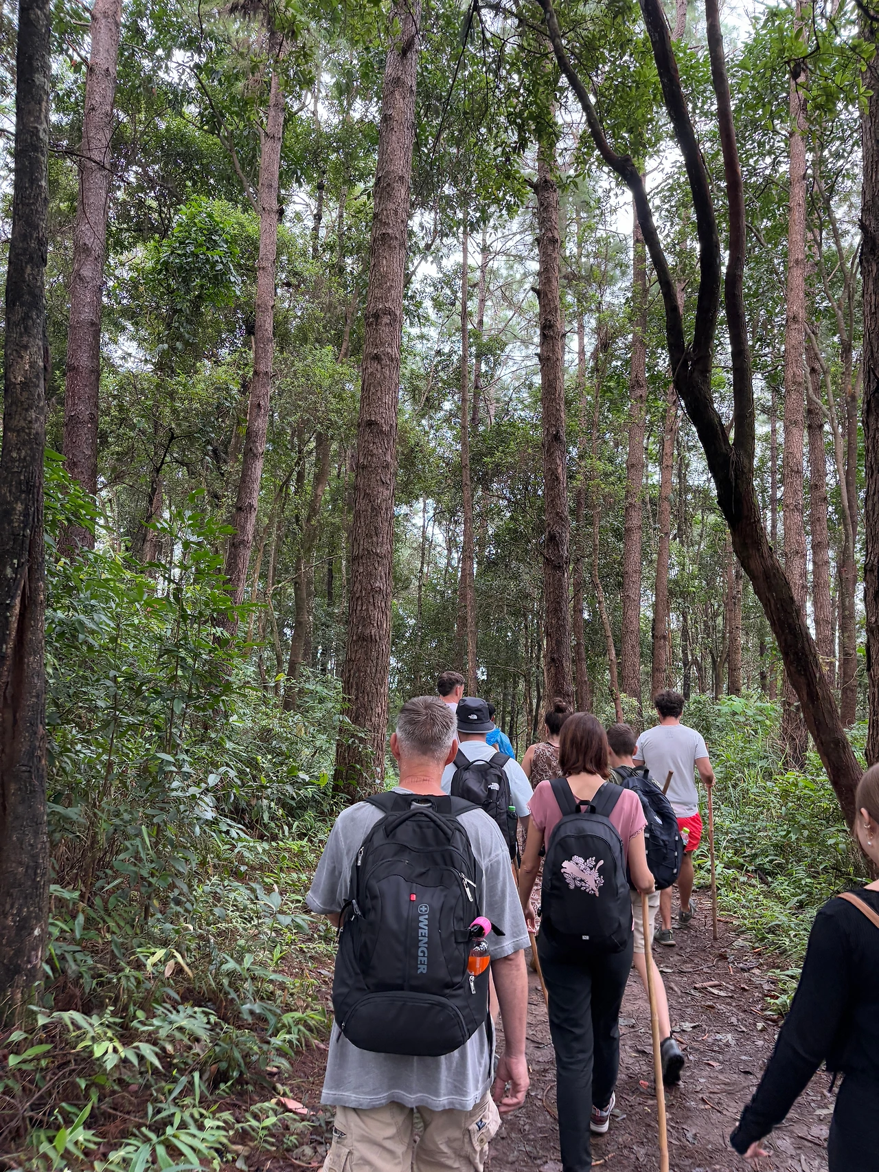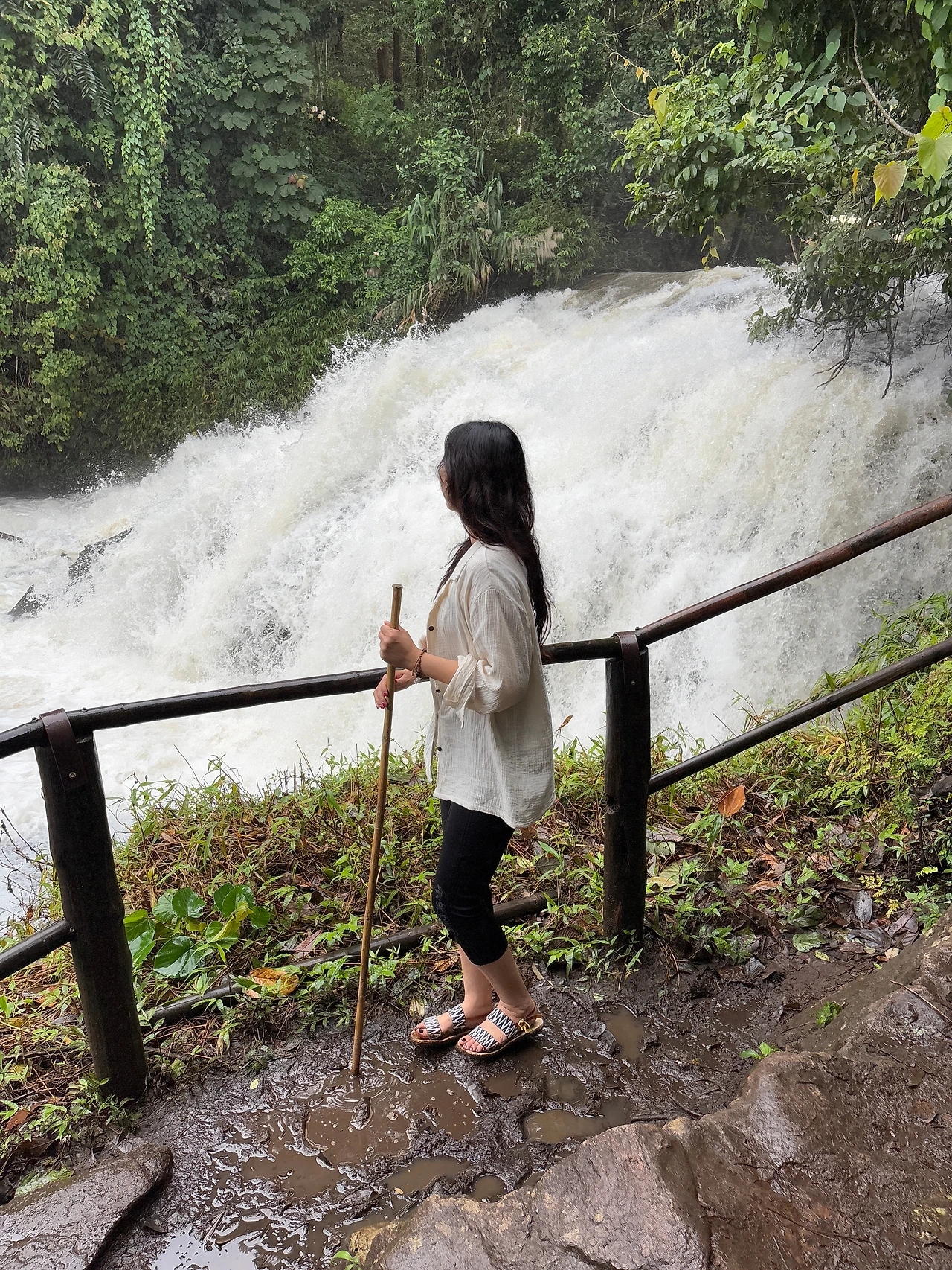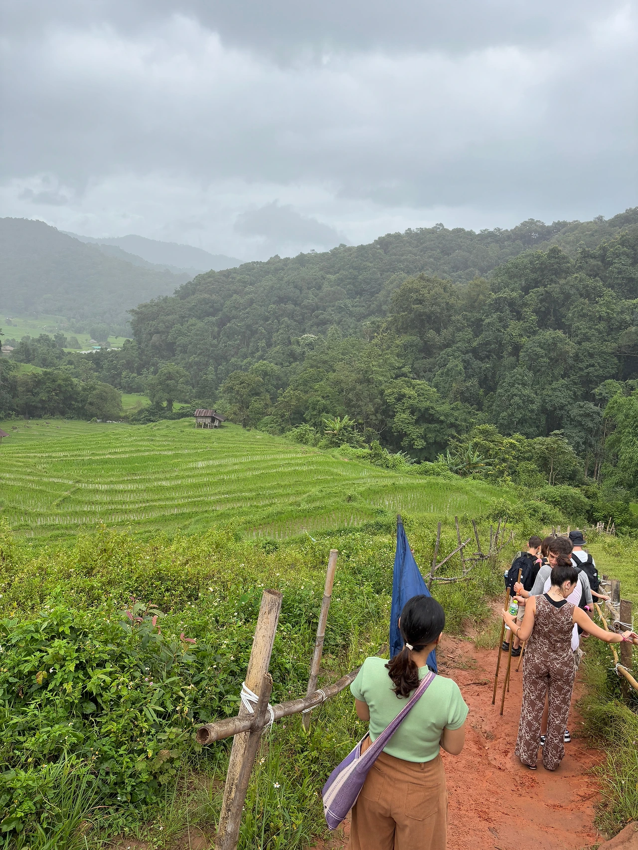 너무 추워서 트레킹을 할 수 있을까 싶은데 트레킹 입구로 차를 타고 다시 도착해서는 날씨가 맑아졌다. 비도 오지 않고 선선해서 좋다. 입구에서 남자 현지인 가이드가 새로 와서 길 안내를 해준다. 나무 막대기를 하나씩 나누어준다. 나도 가볍고 키에 맞는 나무막대기 하나를 집었다. 시작부터 같이 간 여자 가이드는 사진을 되게 잘 찍어준다. 태국 사람인데 얼굴이 갸름하고 코도 오뚝하고 예쁘게 생겨서 너무 예쁘다고 말해줬더니 함박미소를 지으며 좋아했다. 그러면서 “너도 예뻐.” 하면서 한국인들은 피부가 좋고 모공도 작다고 덧붙인다. 내가 몇 살인지 궁금해서 묻길래 ”30 몇 살이야,“ 하니 정확하게 말하지 않는 것에 웃으면서 ”그건 나도 30 몇 살이긴 해, “하고 말했다. 영어를 정말 잘하길래 치앙마이의 젊은 사람들은 영어를 다 이 정도로 잘하냐고 하니 자기는 대학에서 배웠지만 더 어린 친구들은 어릴 때부터 배워 훨씬 더 잘한다고 했다.