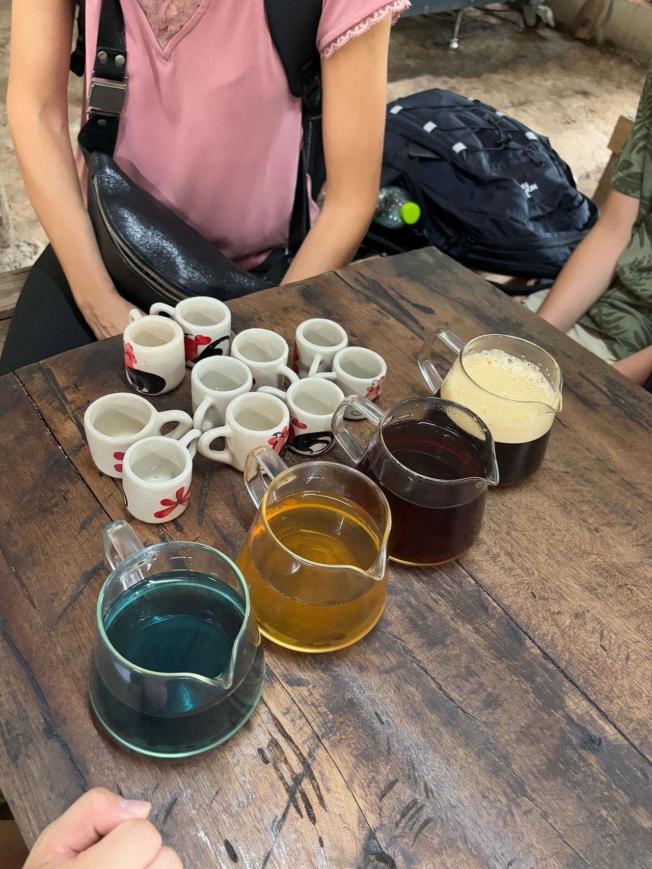 온통 진흙 범벅이 된 샌들과 함께 도착한 마지막 코스는 매끌렁루앙 마을이 나오고 한 카페에 도착한다. 한국의 패키지 투어처럼 강매나 불필요한 곳에 데려다주는 게 아니라 잠깐 쉬면서 커피와 차를 시음하고 필요한 게 있으면 사면되는데 가격도 저렴하다. 가이드 마이크 같은걸 머리에 차고 어디선가 핑크색 도인복장을 하고 아저씨가 나타나 유창하게 커피와 차 메뉴를 하나하나 설명해 주고 사라진다. 전문적인 느낌이 이곳 분위기와 안 어울려서 웃긴데 좋은 정보를 주니 좋다. 이 차는 피부에 좋고 뭐 눈에도 좋고 등등.