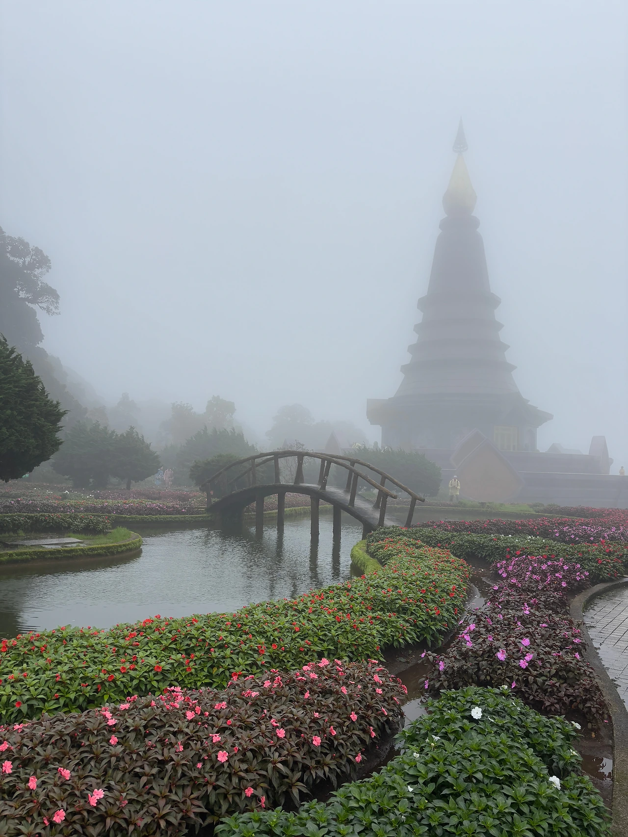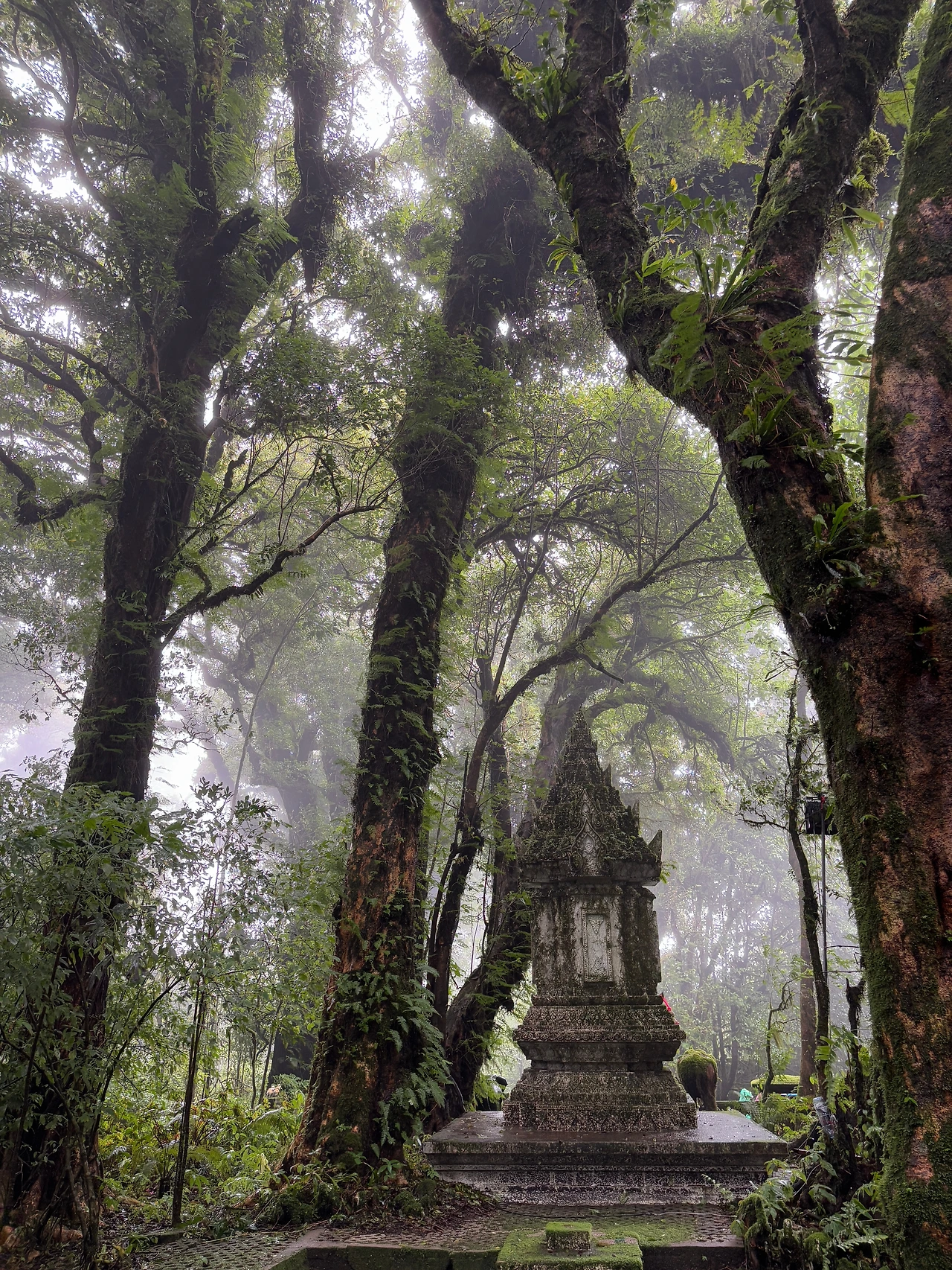 우리 팀 말고도 가이드가 이끄는 투어 팀이 많았다. 비바람이 불고 안개가 끼니 커다란 나무로 둘러싸인 숲 속이 신비로우면서도 으스스한 분위기로 가득하다. 어린이들도 많다. 추워서 이빨을 부딪히며 으으, 하면서 가이드의 설명은 대충 흘려듣고 이 시간이 빨리 끝나기를 기다린다. 이곳 가장 높은 정상은 태국에서 가장 높은 산이라고 했다. 그래서 이렇게 추운 건가. 하루 중에 여름과 겨울을 넘나 든다고 누가 말했다.