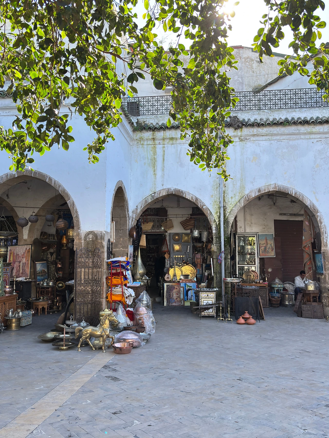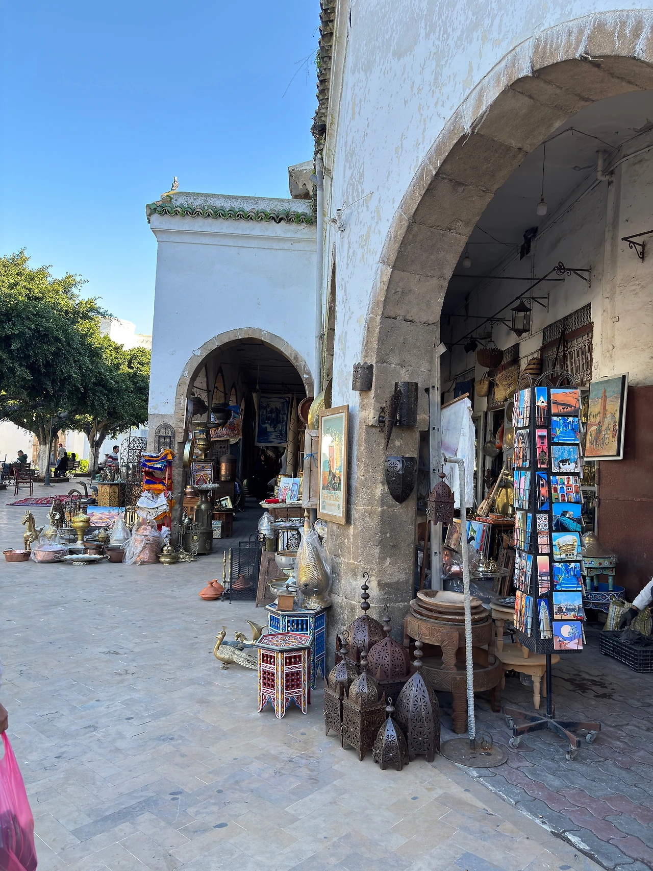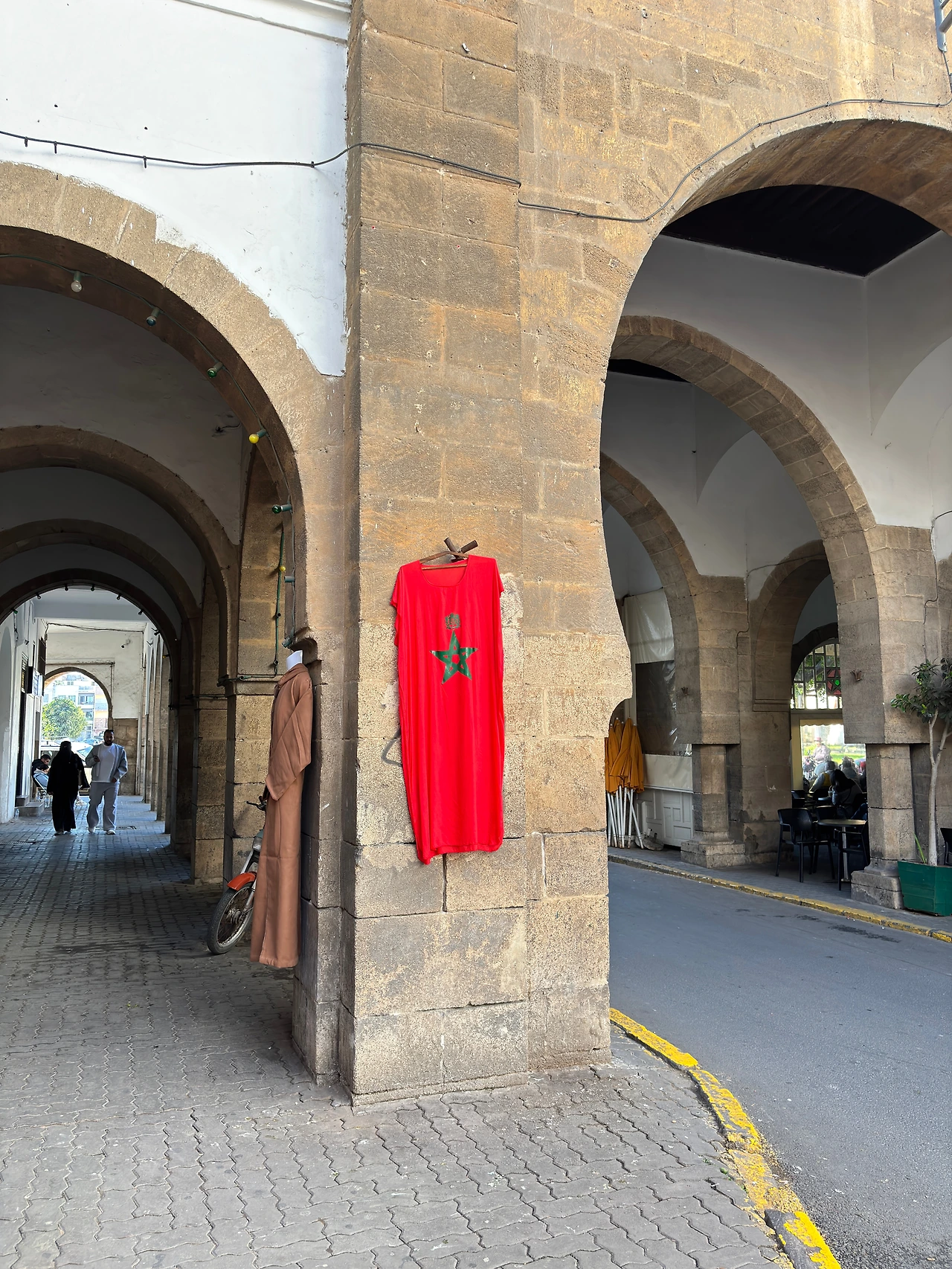 하부스 골목에 들어서니 다른 나라에서 보았던 유대인 지구 같은 느낌도 드는데 크림색과 황토색의 이국적인 건물들이 있고, 상점이 많다. 햇살이 가득 들어오는 위치에 있는 푸르른 공원은 도심 속 작은 휴식처가 된다. 잠깐 멈춰서 사진도 찍어본다. 아치형의 커다란 문을 통과해 들어오면 역시나 기념품, 젤라바 같은 옷들, 미술품 등을 파는 골목이 나온다. 걷는 내내 사실 다른 메디나나 그런 곳과 다른 색다른 특성은 못 느껴서 굳이 여기까지 힘들게 버스 노선과 길을 찾아가지고 올 정도는 아니라고 느낀다. 제미나이는 하부스가 1910년대 프랑스 보호령 시절에 만들어진 뉴 메디나라고 부르는 곳이라면서 프랑스 + 모로코식 느낌이 섞인 곳으로 추천해 주었는데, 딱히 특별한 매력은 모르겠다. 그래도 도떼기시장 같은 호텔 근처의 복잡한 메디나 거리와 달리 관광객 없이 현지인들만 있는 상대적으로 한적한 곳이어서, 그래도 와서 보니까 또 산책할 만은 하다. 메디나는 주로 짝퉁 같은 옷이 많다. 걷다가 약간은 지치고 당 떨어지는 그런 에너지여서 여러 가지 옷을 입은 현지인들을 벤치에 앉아서 보니 신기하고 재밌다.
