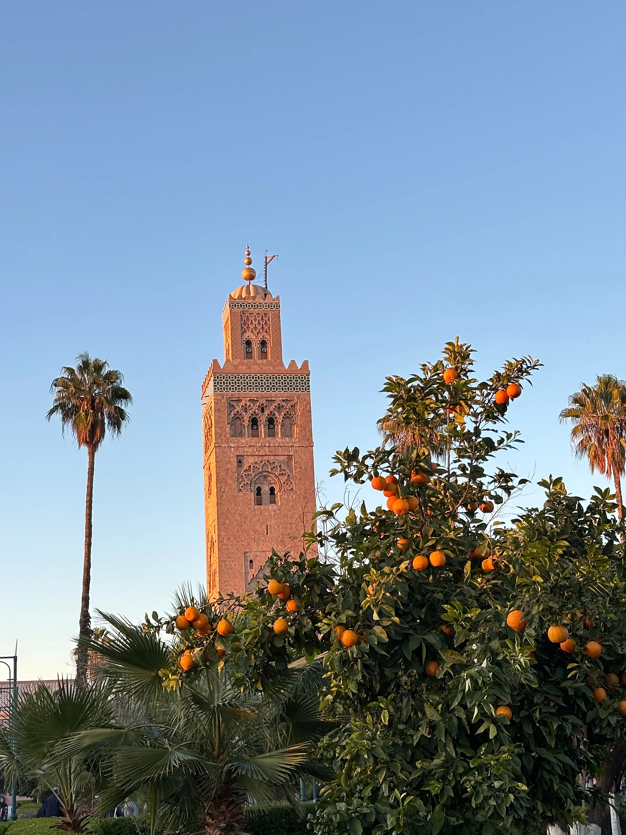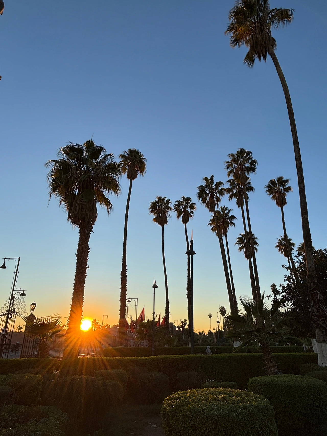 샌드위치를 든든하게 먹고 정처 없이 한번 걸어보는데 멀리 버스 타고 지나가면서 봤던 야자수 가득한 정원이 보였다. 해가 은은하게 지기 시작하여 하늘이 연한 주황색으로 밑에서부터 올라오려고 하는 무렵이다. 저기 한번 가볼까, 하고 그쪽 방향으로 걸어가는 길은 외국인은 거의 없고 하루를 마감하거나 집에 가는 듯한 바쁜 모습들의 현지인들이 많았다. 공원에는 벤치가 곳곳에 있고, 잘 구획되고 깨끗하다. 키가 커서 목을 위로 한참 빼고 보아야 하는 야자수들이 빼곡하고 중간중간 오렌지 나무들이 있다. 모로코에는 어떤 도시건 길가에 오렌지 나무가 많아서 귀엽다. 오렌지 나무는 주먹 크기의 탐스럽고 땡땡한 주황색 오렌지들이 가득 매달려 있어서 버스를 타고 지나가도 그 생명력 있는 아우라가 쨍-하고 빛난다. 지나갈 때마다 저걸 따먹어도 되는 걸까, 하고 생각한다. 하나쯤 따먹어도 괜찮지 않을까, 맛은 어떨까 궁금하다. 10-20 디르함으로 가격이 다양한데 어디서나 신선하게 짜주는 오렌지 주스는 너무 싱그럽고 새콤달콤하다. 오렌지 3-4개를 바로 잘라서 짜준다. 모로코에 있는 동안 매일 오렌지, 아보카도, 망고, 바나나, 석류 주스를 기분이 내키는 대로 사 먹었다. 감기에 걸렸을 때는 비타민 섭취를 해야 한다며 자주 먹었다.