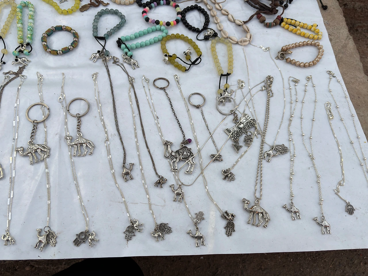 “이런 거 하나에 얼마예요?” 하고 낙타 목걸이를 가리키며 말했다.