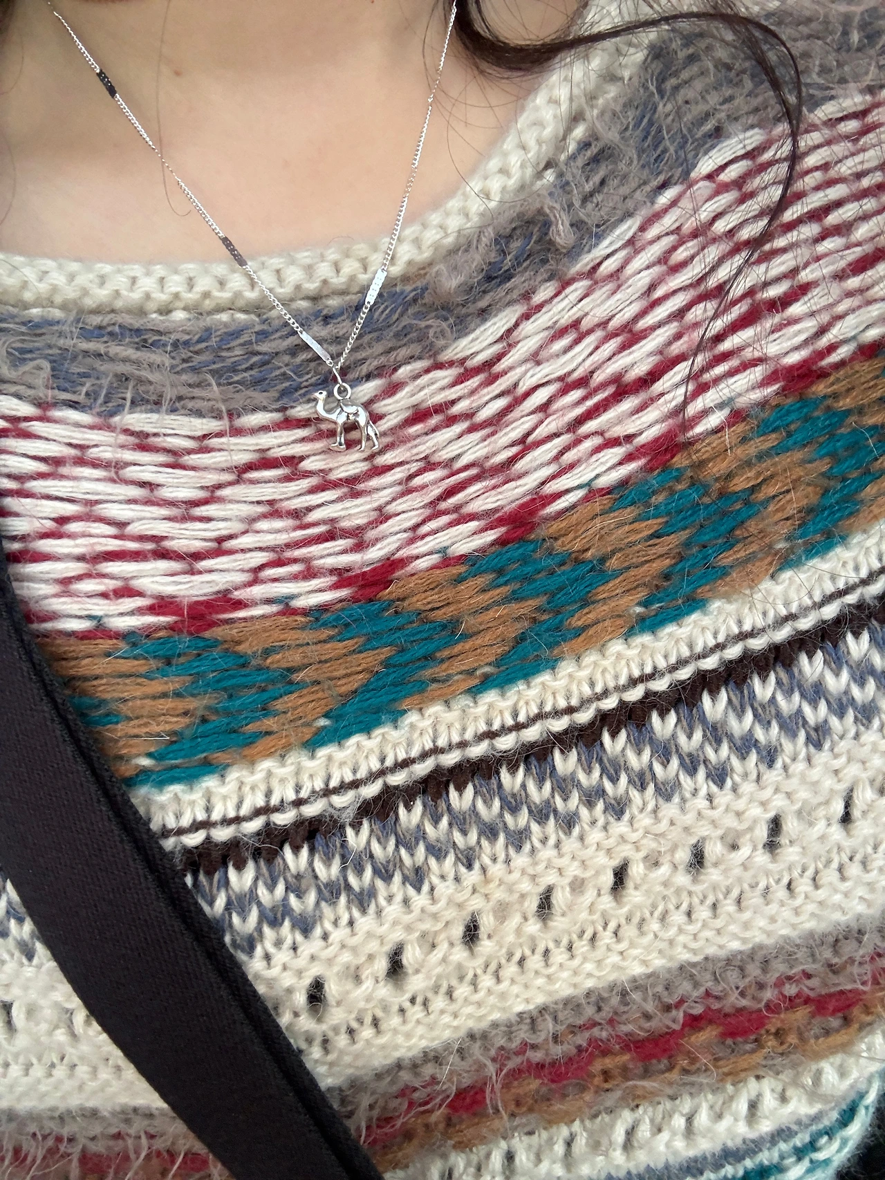 그중 줄도 규칙적인 반짝거림이 특이한 마음에 드는 것 하나를 골라서 80에 사고 목에 한 번 차서 셀카로 찍어보고 집에 돌아왔다. 메디나를 구경하면서 한 시간 정도 정처 없이 쏘아다니다가 집에 돌아왔다. 저녁시간이라 골목골목 발 디딜 틈 없이 사람은 많았고 복잡했다. 그렇게 집에 돌아와 거울을 보는데 어랏? 줄만 남고 낙타 펜던트가 사라졌다! 어떻게 차 보자마자 이럴 수가. 좌절하고 사라진 목 부위만 계속 만진채 황당해하는 내 표정을 계속 보았다. 어떻게 이럴 수가, 오랫동안도 아니고 그냥 집에 돌아오는 길이었잖아. 휴. 너무 사고 싶었던 건데 잃어버려서 너무 속상했다. 어떻게 이렇게 쉽게 빠져버렸지. 목 부분의 니트는 약간 뜯겨 있었는데, 누가 채간 걸까. 아니면 니트에 걸려서 툭하고 떨어진 걸까. 결국 아직 며칠 더 있으니까 아저씨한테 가서 펜던트만 하나 더 사야겠다, 하고 마음먹었다.