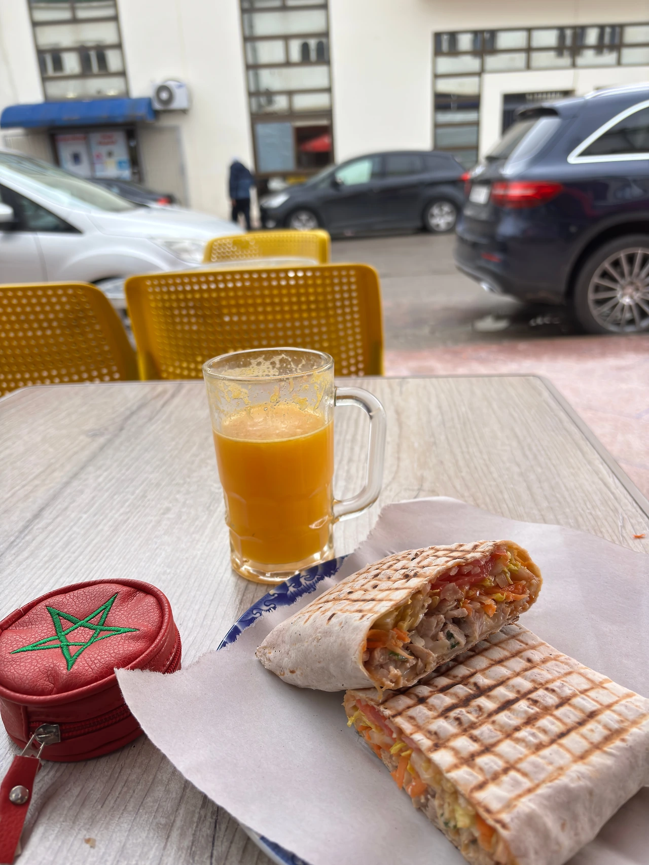 그렇게 버스 터미널을 크게 한 바퀴 돌고 돌아오는 길에 뭐좀 먹고 가기로 생각하고 노천에 아저씨들이 모여서 빵과 커피를 먹고 있는 집에 들어간다. 밖에 치킨 바베큐를 굽고 있어 뭔가 식사도 할 수 있는 곳 같다. 나도 커다란 빨간색 코카콜라 천막이 쳐져 있는 야외 자리에 앉았다. 대충 치킨 타코와 오렌지 주스를 시켰는데, 이 둘에 55 디르함이다. 페스 물가가 워낙 비싸서 이것도 정말 싸게 느꼈는데, 라바트나 카사블랑카에서 같은 메뉴를 먹는다면 35 디르함 정도면 먹었을 것 같다. 메뉴를 시켰는데 약간 오래 걸린 것이 진짜 정성스럽게 요리를 해준다. 안에 들어가는 치킨은 잘 구워져 있고 속에 들어간 야채도 신선하며 빠니니 또띠아도 맛있다. 오렌지 주스도 신선하게 그 자리에서 짜주는데 너무 달콤 새콤하다.