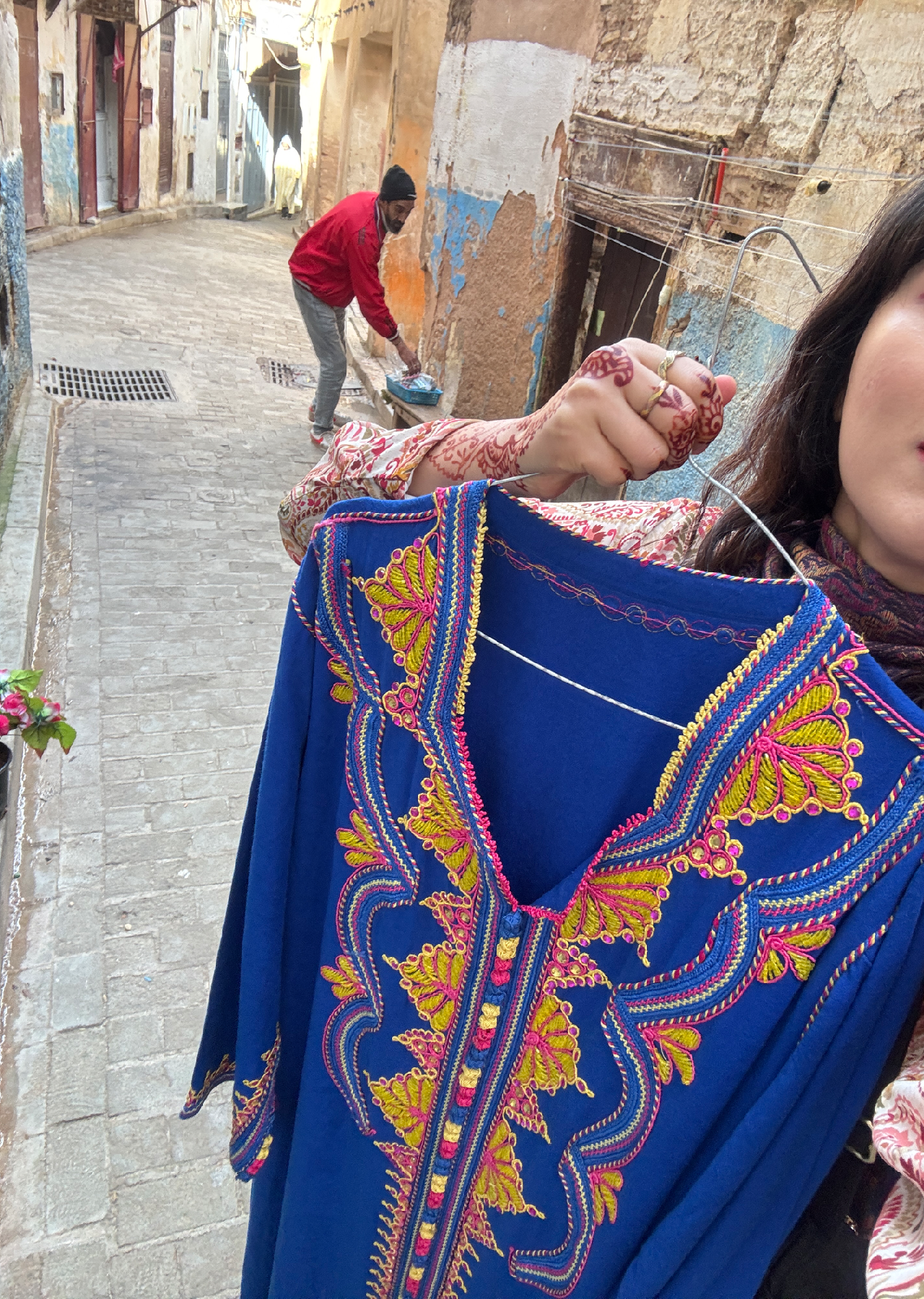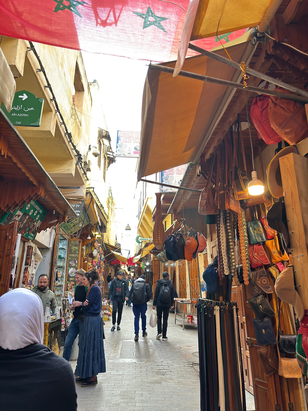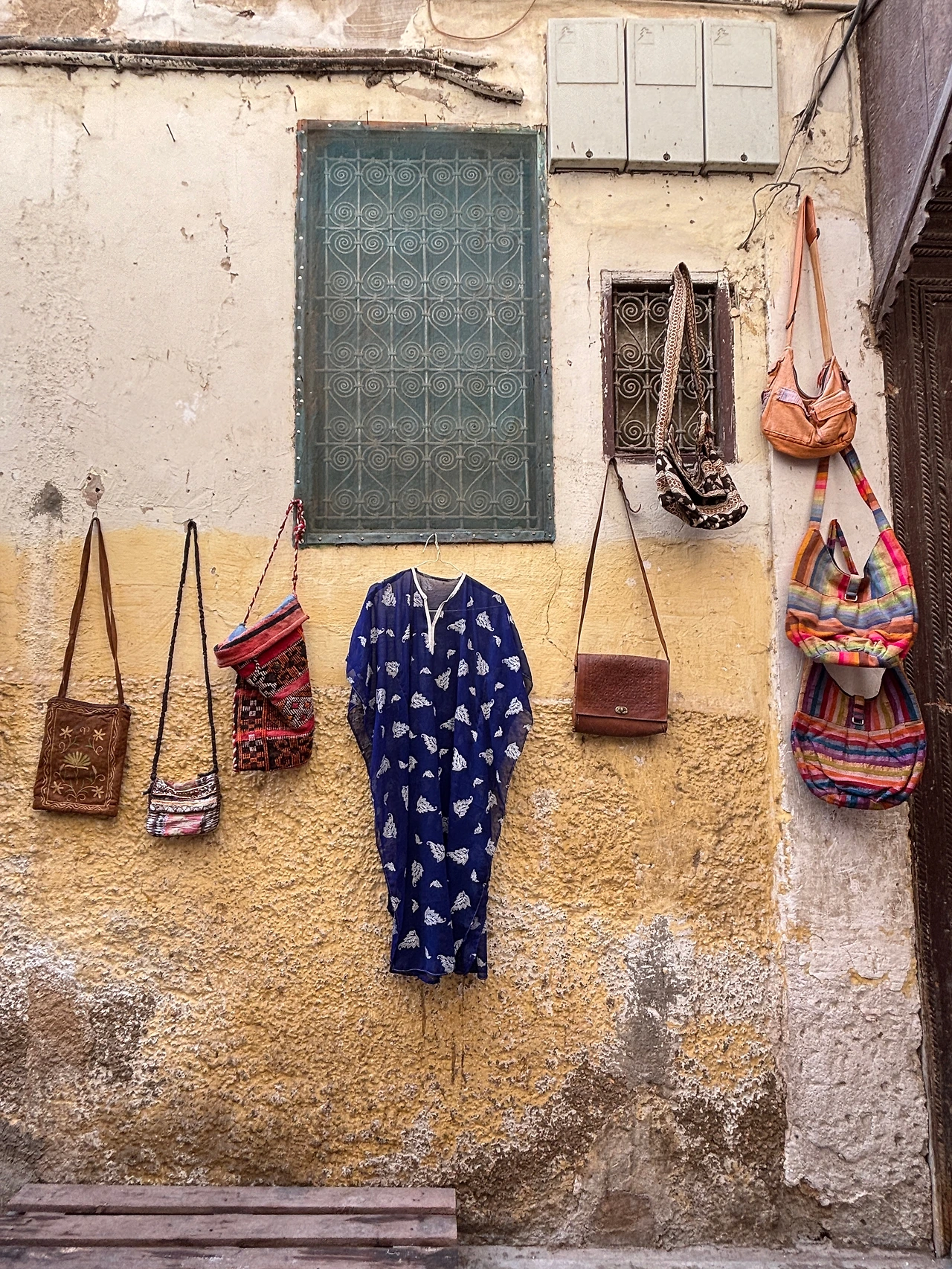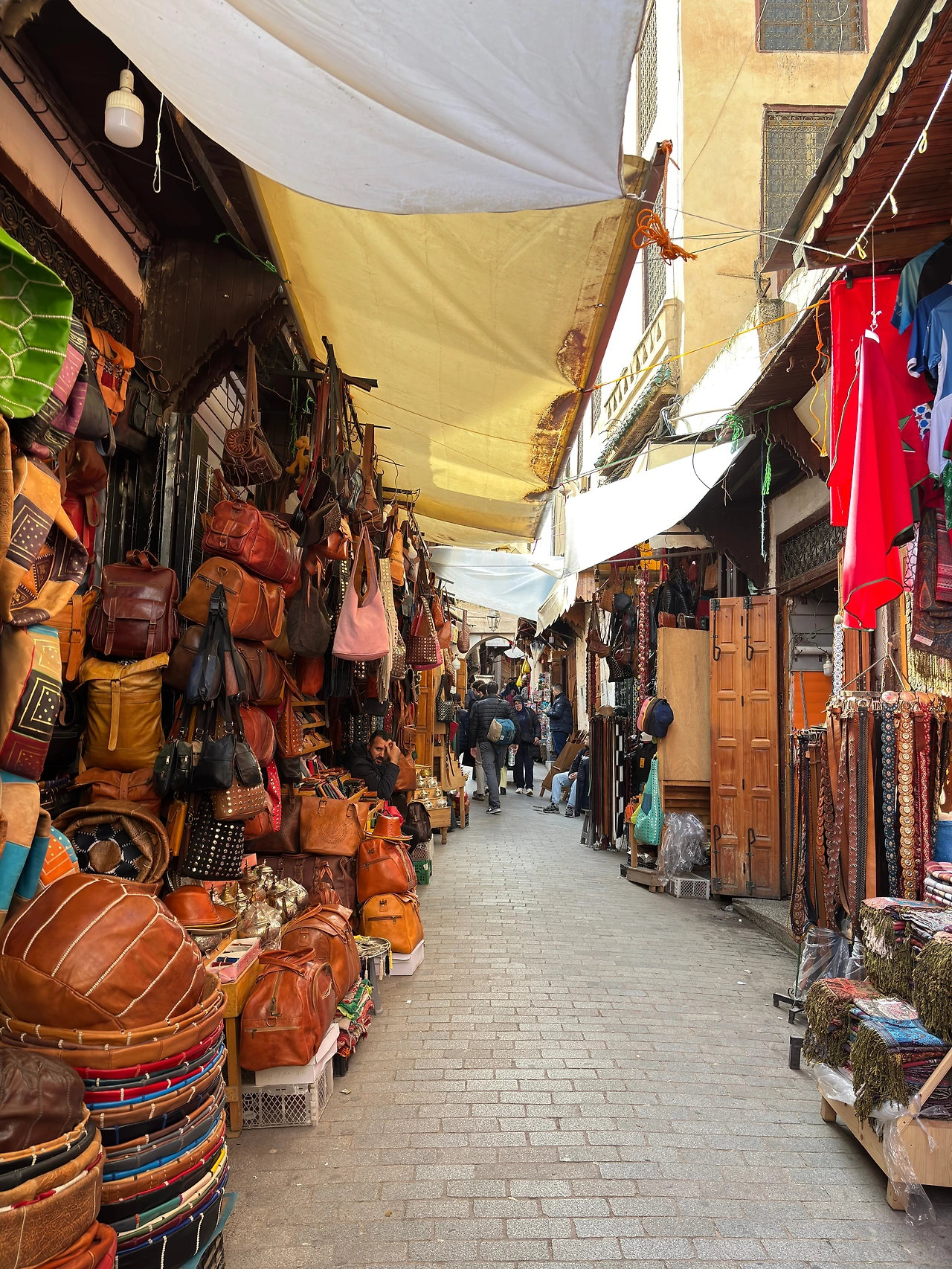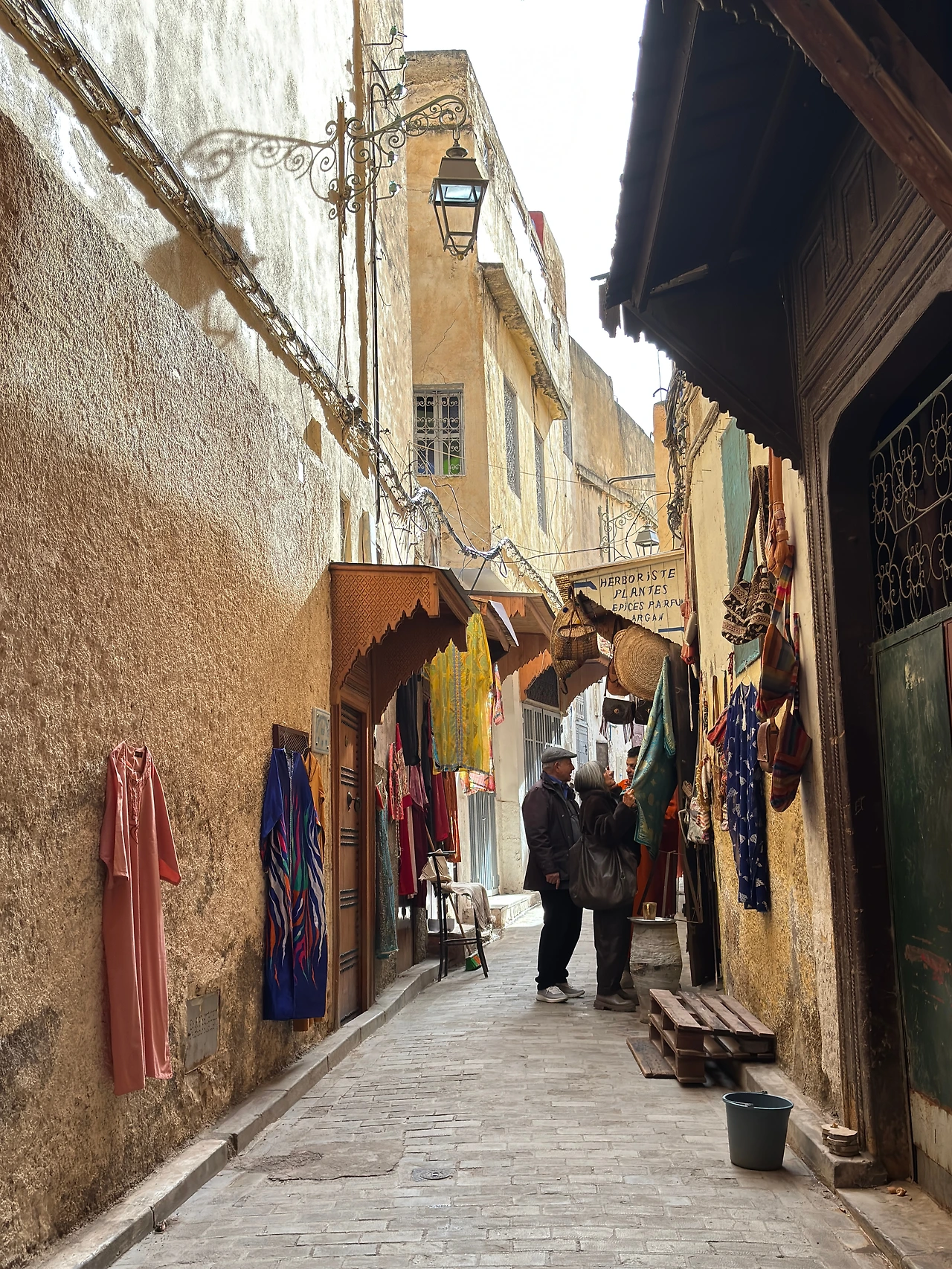 여기까지 오는 길에 관광객들이 잔뜩 들어가는 골목이 있어서 따라 들어갔더니 섬유를 가공해서 스카프와 옷을 만들어 파는 골목이 나왔다. 골목에 단단한 빨랫줄 같은 데다가 스카프를 보기 좋게 전시해 놓고 판매한다. 아저씨들마다 계속 자기 스카프를 보러 가라고 영업을 했다. 그런데 지금 좀 쌀쌀해 가지구 스카프를 하면 좋을 것 같아서 이 집 저 집 보다가 한 코너에서 보라색의 신비로운 색감과 문양이 예뻐서 계속 쳐다보고 만져보았다. 이 골목에서 시세를 파악해 보니 처음에 250-300 디르함을 부르고 조금씩 깎아주는 것 같았다. 무슨 제품을 파는 곳이든 250부터 부르는 게 국룰인 듯했다. 보라색이 예뻐서 보는데 아저씨는 야, 이거 사겠구나 나를 적극적으로 붙들고 이것도 걸쳐봐라 저것도 걸쳐봐라 목에 둘러준다. 내가 마음에 들어 한 보라색은 뒤집으면 핑크도 나온다고 하면서 실크다, 하고 자기가 180까지 해주겠다고 했다. 이게 실크라고? 실크라면 너무 싼데. 저번에 실크로 유명한 터키 부르사에서 금색 실크 목도리를 사 왔는데 6만 원 정도 했었는데. 실크라기엔 너무 싸서 실크로는 믿기지 않았지만(나중에 제미나이에 물어보니 선인장 실크?라는) 뭐 그래도 너무 부드럽고 색감이 예뻐서 모로코 감성으로 하나 갖고 싶었다. 나는 학생이다, 더 깎아줘라, 하니 얼마까지 괜찮냐고 물어서 100이라고 하니 그럼 150에 해주겠다, 그렇게 흥정하다가 120에 해서 만족했다. 관광객과 판매자 모두 만족한 가격은 서로를 행복하게 만들어준다. 이럴 경우 결과적으로 관광객은 여전히 결코 싸게 산 것은 아닌데, 페스 한복판에 스카프를 잔뜩 놓고 파는 곳에서 힐끗 보면 가격이 50에 붙어있다. 흠, 나는 아침부터 사서 추울 때 하고 다니고 마음에 드는 걸 골랐으니, 그리고 상인이 직접 만들어서 파는 곳에서 샀으니 뭐 괜찮아. 하고 스스로 정신을 치유하고 달래야 한다.