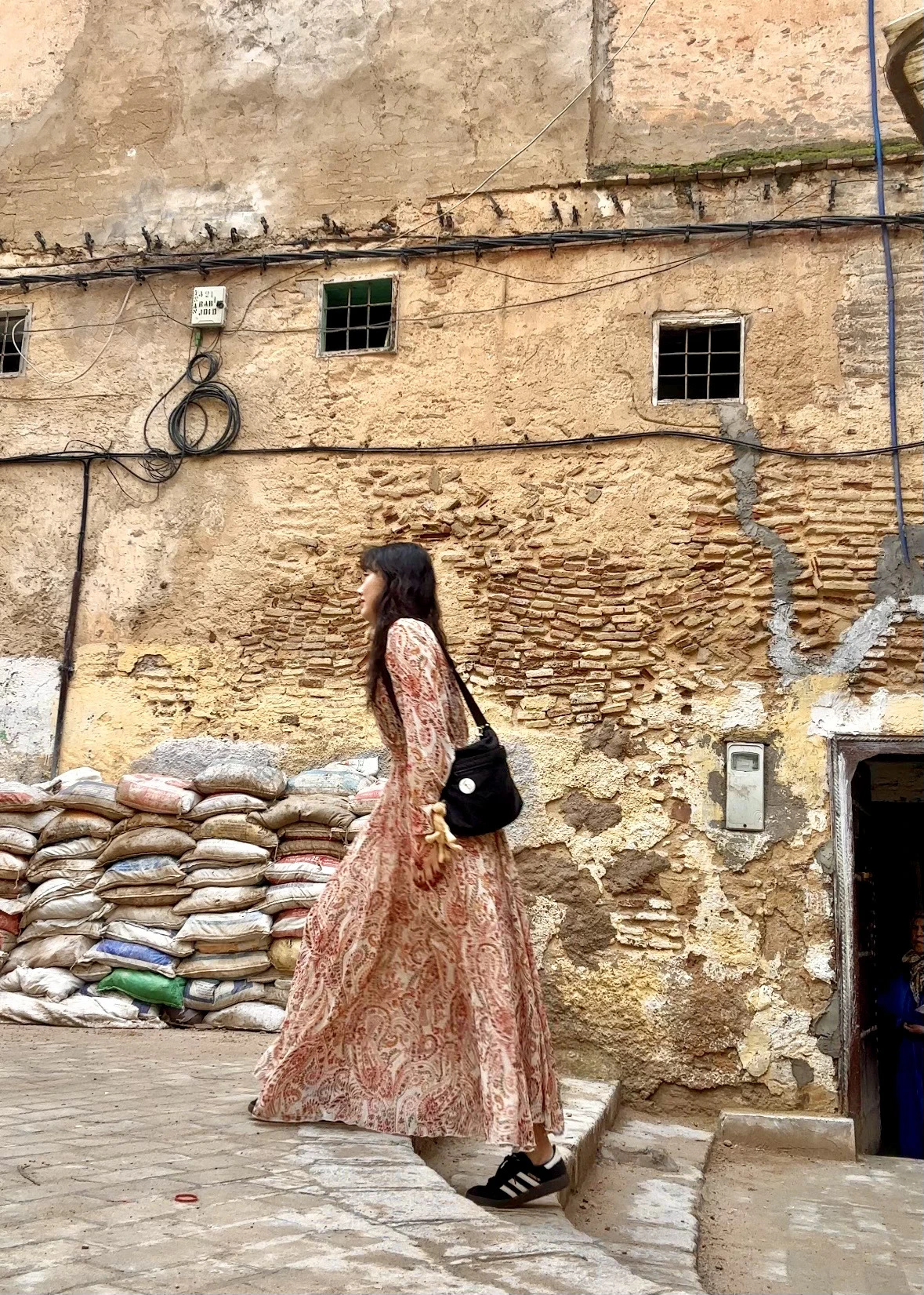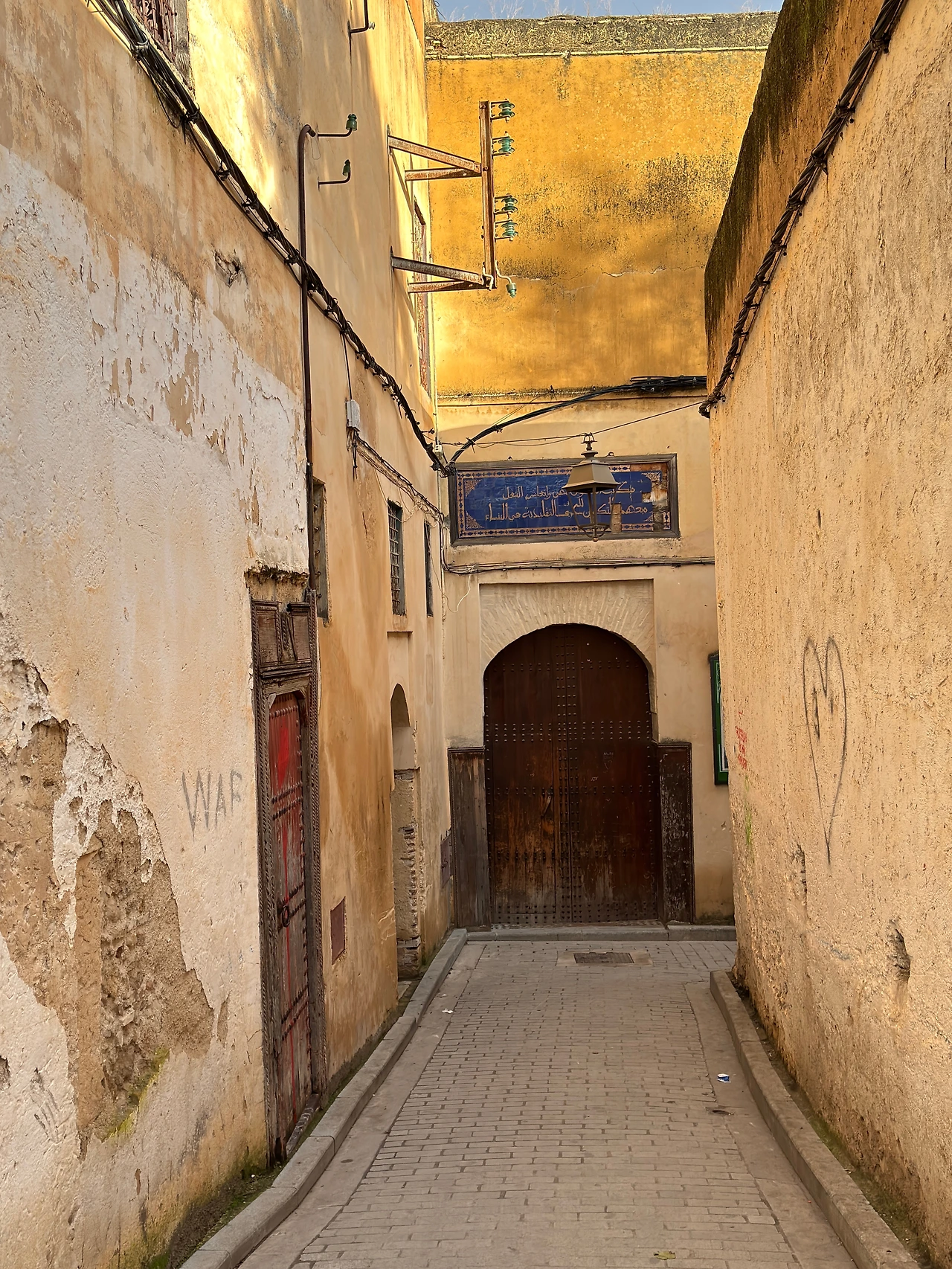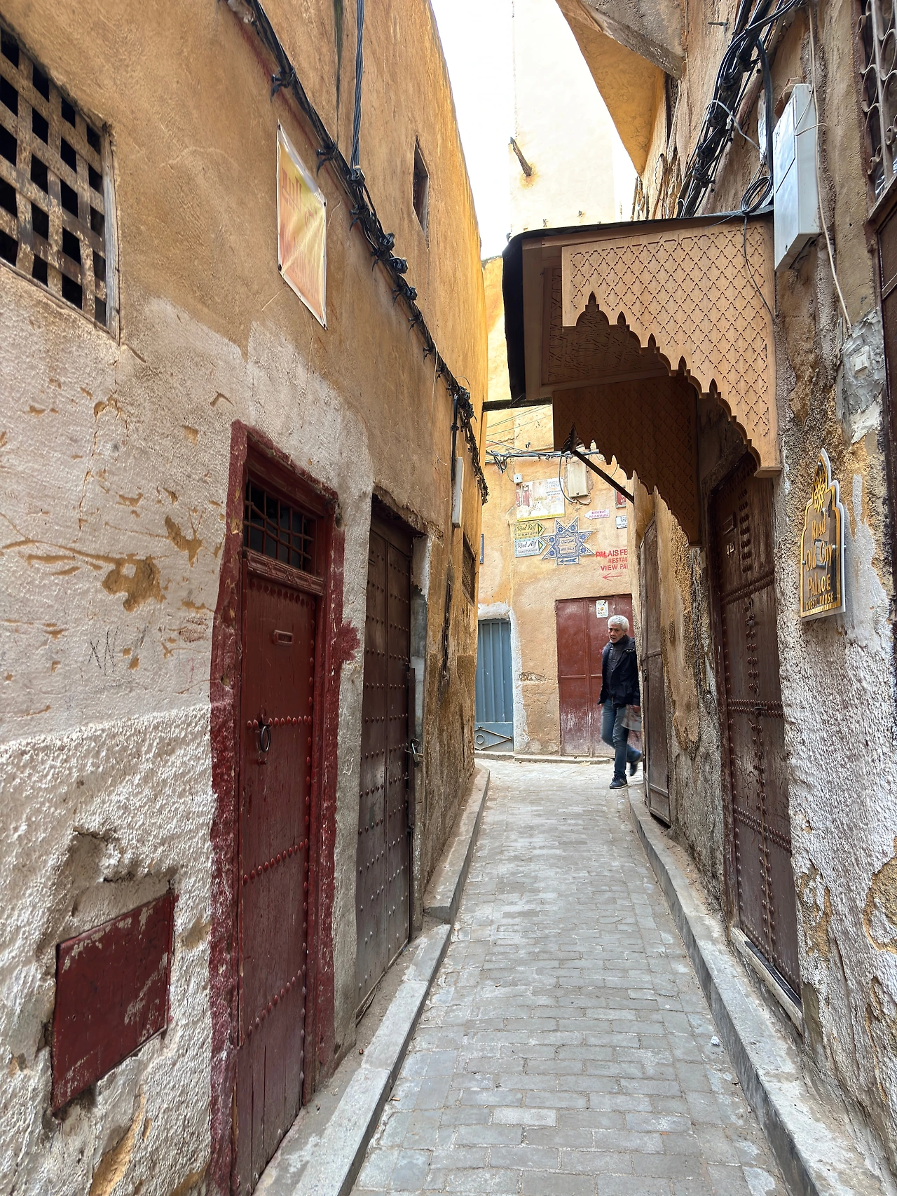 옷을 갈아입고 숙소를 나왔다. 페스의 구도심이라고 해야 하나 메디나는 미로처럼 복잡하다. 바르셀로나 피카소 미술관 근처의 황토색으로 된 거리처럼 목을 하늘로 꼿꼿이 들어 보아도 그 끝이 안 보일 만큼 높고 단단한 벽으로 둘러 싸인 좁은 골목들의 연속이다. 숙소에서 나오자마자 길을 잃지 않기 위해 한 손에는 지도를 켜고 구불구불한 길을 따라 걷는다. 개나리색, 바랜 레몬색, 황토색 벽이 오래되어 낡은 벽들과 캐리어 덜덜거리게 하는 회색 돌길을 걷다 보면 방긋 웃어주는 현지인 아이들도 만나고 꼬질꼬질한 고양이들도, 무슬림 복장을 한 퉁퉁한 여인들도 마주친다. 이런 길이 계속 반복되는 걸까, 하고 걷다가 그래도 차가 다니는 도로로 이어지는 길로 나왔는데 나타난 햇빛과 사람 사는 소리에 너무 숨통 트인다. Bank of Africa라고 파란 배경에 쓰여있는 은행이 나타나고, 와 내가 진짜 아프리카에 와있구나, 하고 영상에서 접한 아프리카 풍경 같은 길과 현지 복장을 입고 돌아다니는 사람들이 나타난다. 이국적인 풍경에 감탄사를 내지른다. 저 멀리 온갖 낡은 색의 갖가지 변주된 노란 황토색 건물들이 압도한다.