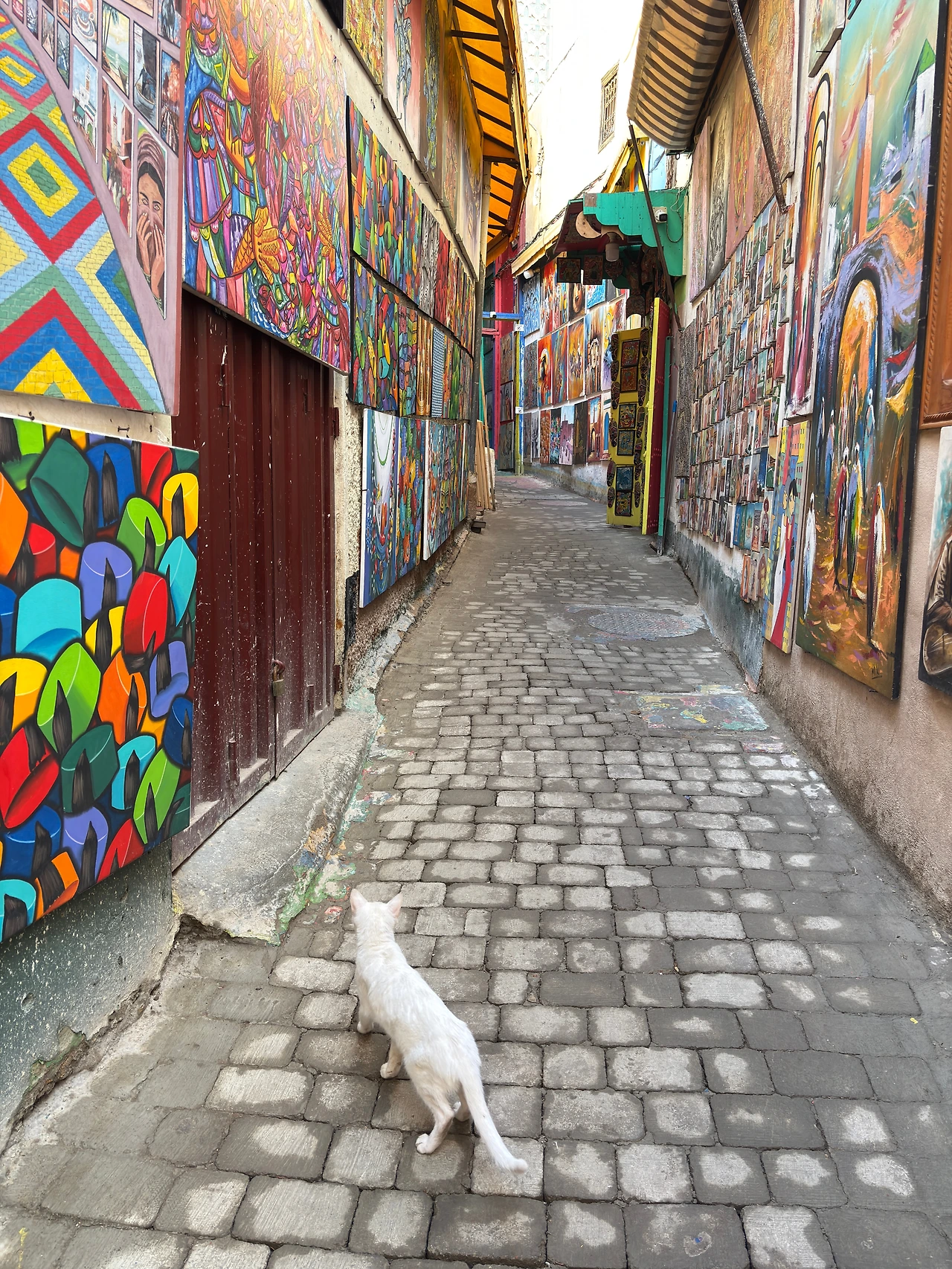목이 말라서 카페에 들어갔다가 오히려 목 퍽퍽한 아보카드 스무디를 마시며 목을 좀 축였다. 카페도 길에서 만난 청소년 같은 남자애가 좋은 레스토랑이 있다며 안내해 줘서 따라갔는데 숙소와 식당을 겸하는 곳이었다. 가격표를 보니 모든 메뉴가 100 이상이라 마라케쉬에 비해서도 너무 비쌌다. 그래서 음료만 시켰는데, 음료가 올 때까지 기다리면서 테라스를 내려다보니 바랜 황금빛 건물들의 빈티지한 뷰가 아름다웠다. 중세 시대 한복판에 들어온 것 같다. 그렇게 조금 쉬다가 나와서 걷는데 손바닥만 한 회색 아기고양이가 다가와 내 다리에 자기 몸을 부빈다. 아악 너무 귀여워서 안 만질 수가 없겠어. 평소 동물을 잘 못 만지고 길고양이를 만지면 위생에 안 좋다고 경고를 받았지만 너무 귀엽고 사랑스러워서 쓰다듬게 되었다. 너무 작고 소중해. 번쩍 들어서 품 안에 안고 싶은 걸 간신히 참았다. 고양이를 귀여워하는 동료에게 나중에 자랑하려고 동영상도 찍었다.