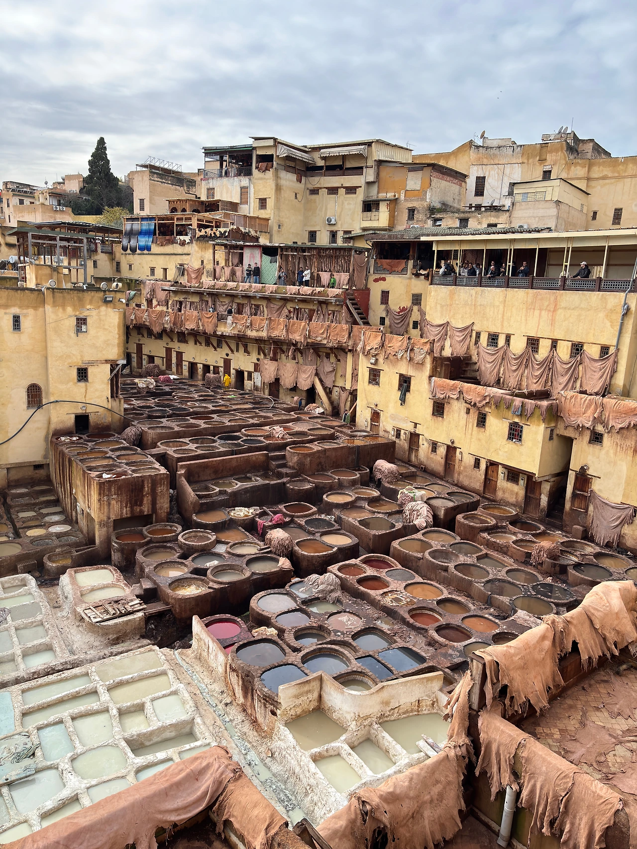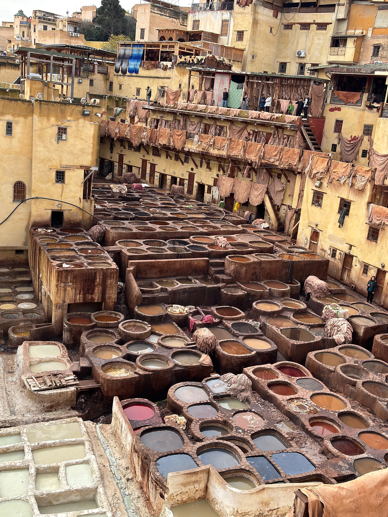 현지인들은 이 복잡한 미로 같은 길도 빠삭하게 알고 있어서 날렵한 몸으로 막 날아다닌다. 남자들은 뚱뚱한 사람이 잘 없다. 웬만한 남자보다 걸음이 빠른 나도 따라잡기 어려울 만큼 걸음이 엄청 빠르다. 어떤 다리도 지나고 처음 가본 골목을 지나면서 그가 일한다는 테너리에 도착했다. 그는 가는 길에 노랗게 염색되어 널려있는 가죽을 보면서 이건 염소 가죽이다, 하고 알려주고 길 안내를 잘해준다. 지나가는 길에 만나는 많은 사람들이 그에게 말을 건다. 현지인들도 있고 누가 봐도 외국인인 외모인 사람들도 있다. 다 아는 동네 사람이거나 쉬는 날 만난 여행자들이라고 해서 낯선 사람을 따라가면서 약간은 의심을 하며 따라가고 있었기에 안심이 되었다. 염색 공장입구에는 옷이며 가방이 형형색색으로 염색된 가죽 제품들을 팔았고, 껑충껑충 뛰어다니는 그를 따라 위층으로 올라가니 테너리 풍경이 펼쳐졌다. 와, 와보길 잘했다. 진짜 진귀한 풍경이다. 염색 냄새가 짙게 풍겨왔다. 그래도 괴로울 정도는 아니었다. 입구에서 그가 손에 들려준 민트향을 맡으면서 풍경을 내려다보았다. 그가 사진을 찍겠냐고 묻더니 핸드폰을 가져가서 이리저리 사진도 열심히 찍어 주었다.