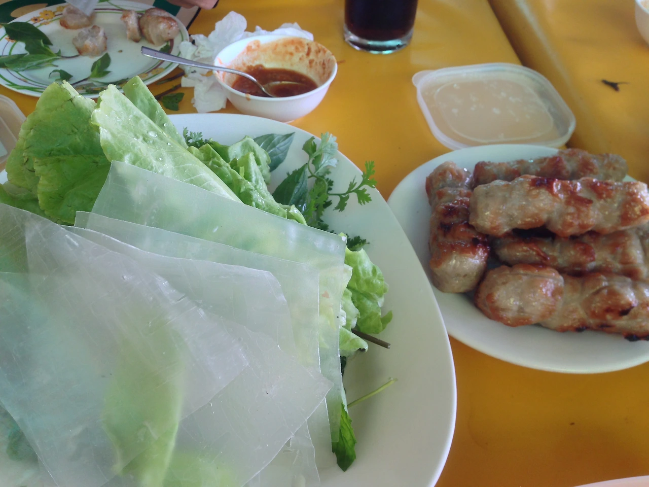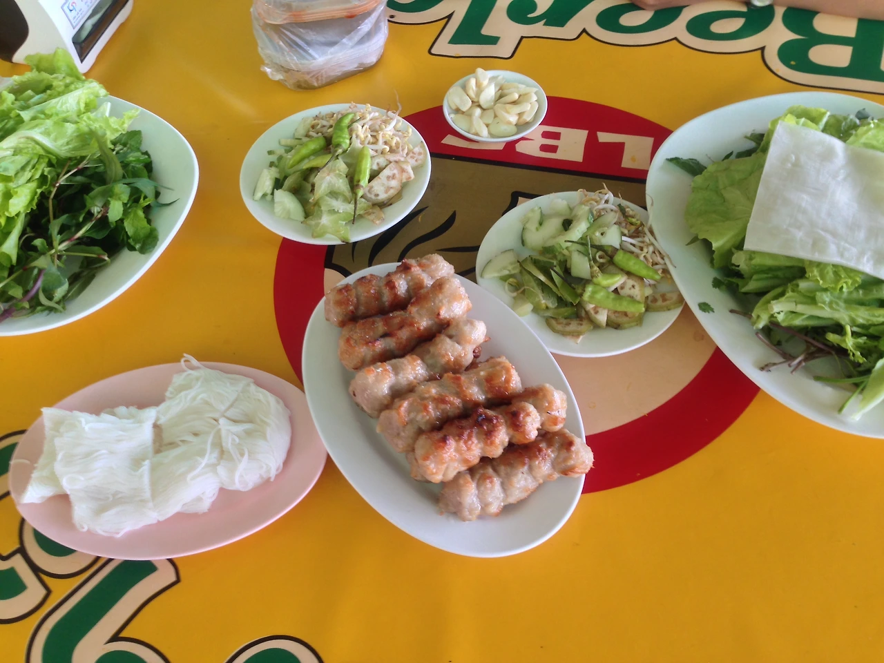 넴느엉이라고 표기하는 게 맞는지 모르겠지만, 저 소세지 같은 돼지고기를 야채에 싸먹는 베트남 요리인데 특히 저 쌈장이 정말 맛있다. 우리엄마는 라오스식 된장이라고 표현하는데, 땅콩이나 땅콩가루가 들어간 것 같다. 무지 고소하고 맛있다.