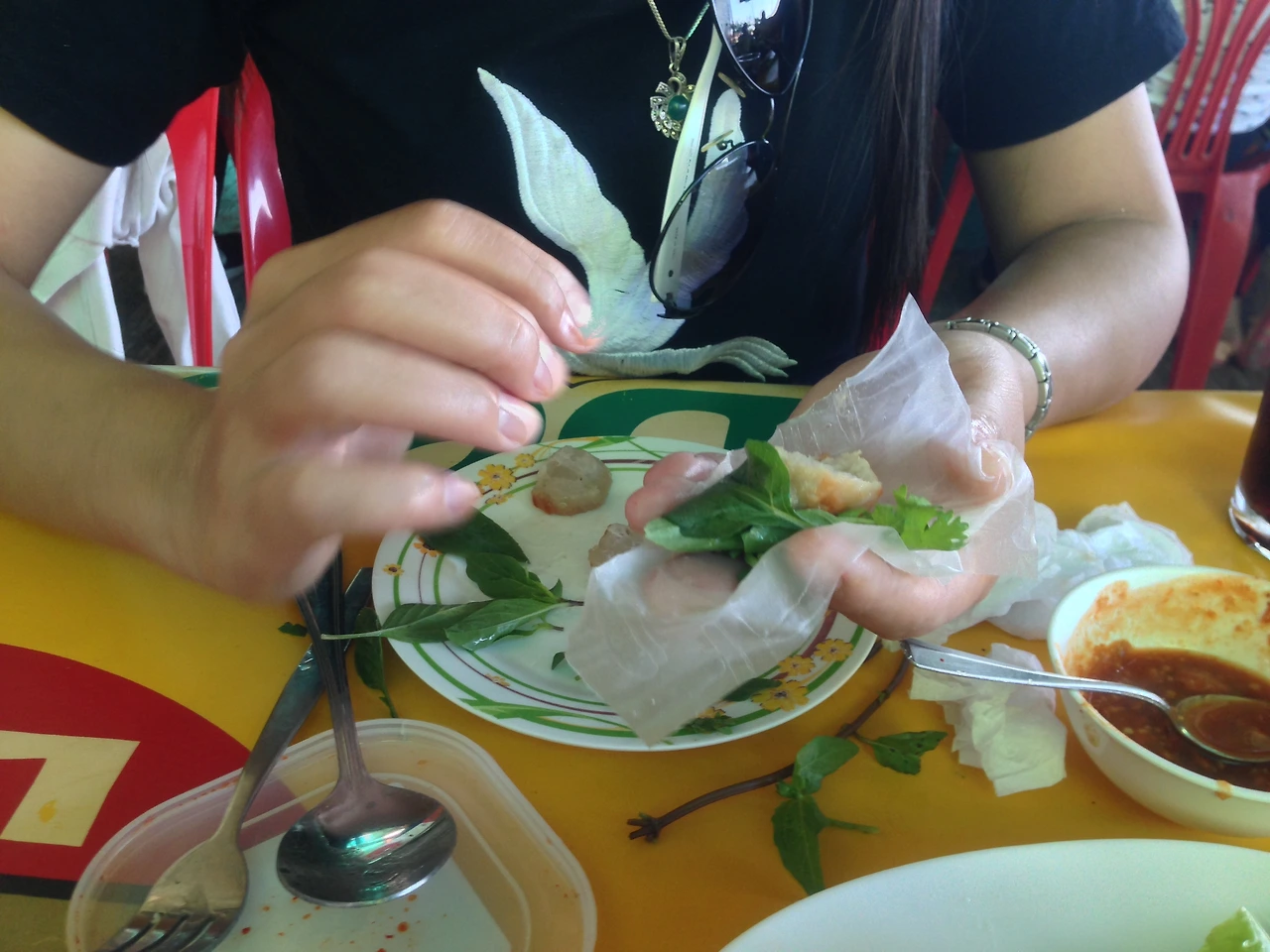 쌈 채소가 정말 다양하게 나온다. 정말 향이 강한 것 빼고는 다 먹을 수 있다. 라이스페이퍼에 여러 싱그러운 채소를 올려 고기와 함께 싸먹는다. 손으로 싸먹으라고 저렇게 손 씻는 곳도 있다. 나는 특히 별모양인지 단풍잎 모양으로 생긴 것이 독특하고 맛있었다.