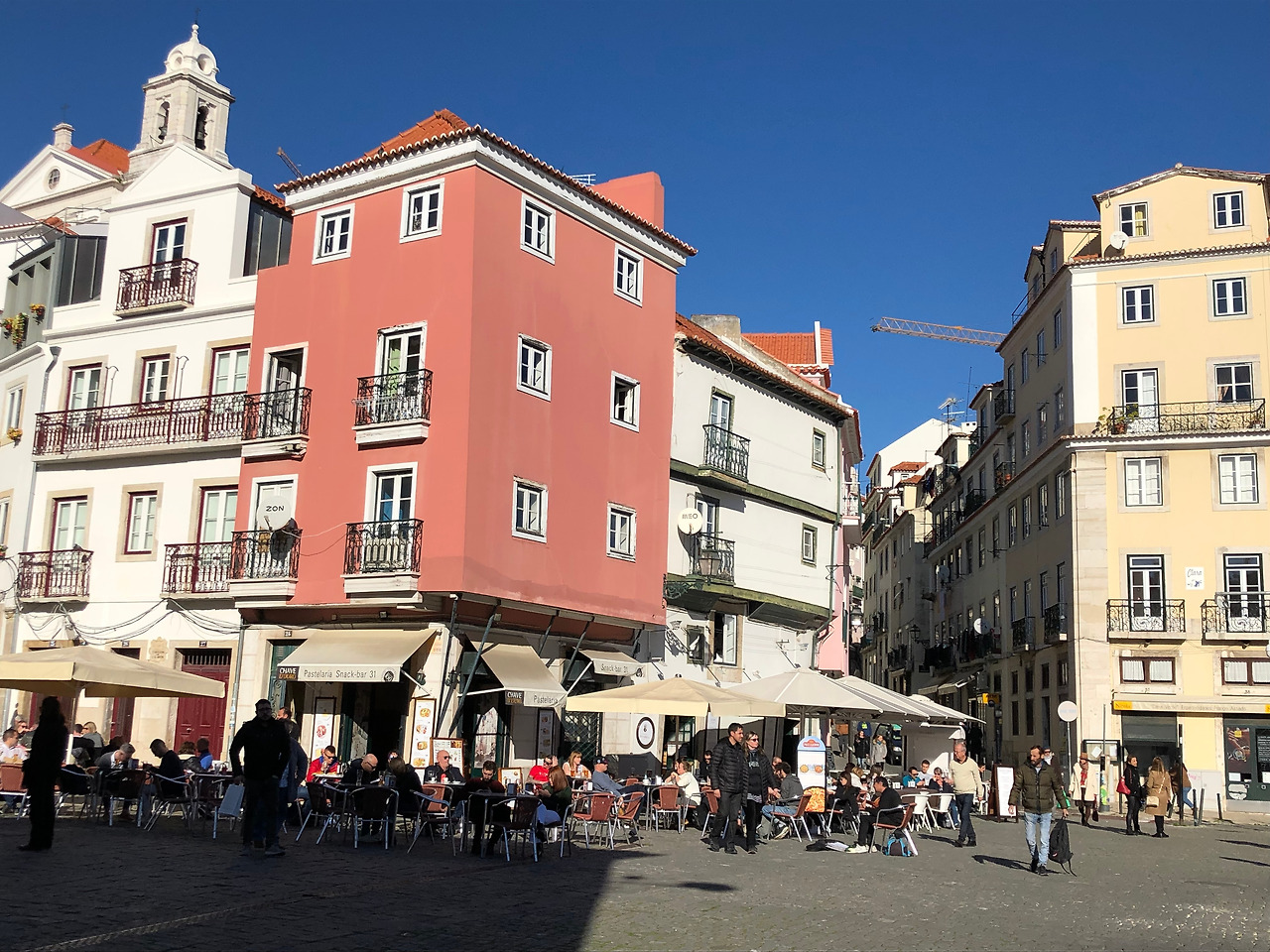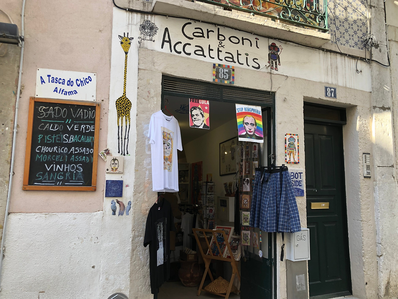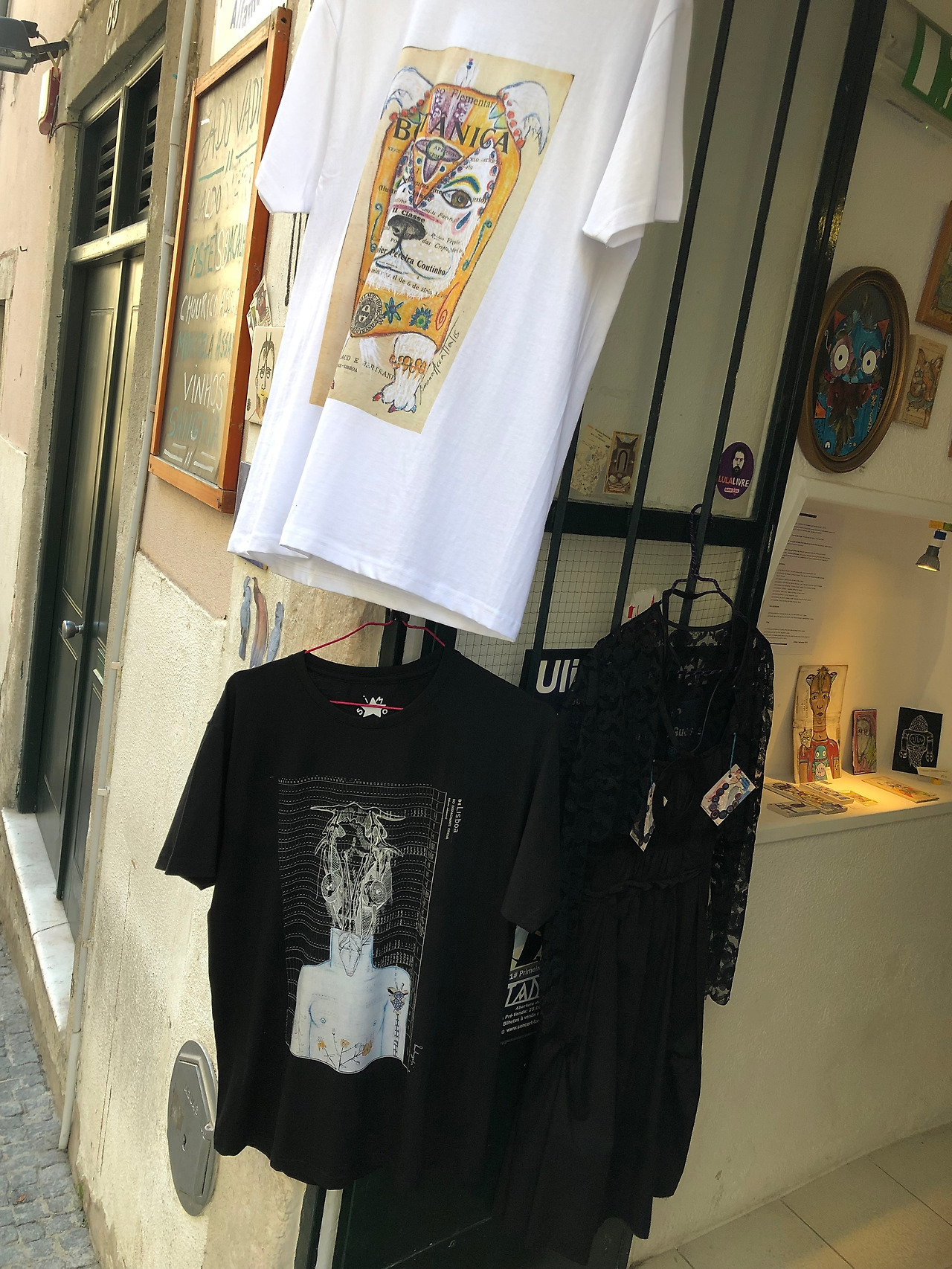 파두 박물관에서 벼룩시장이 열리는 성당 쪽으로 걸어 올라가는 골목골목의 건물들도 색감이 예뻤다. 독특한 티셔츠를 파는 상점 등 전형적인 기념품 샵이 아닌 곳도 많았다.