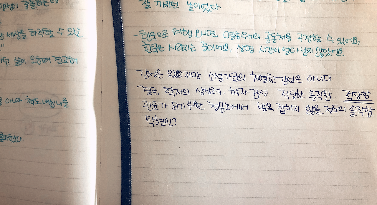 책을 읽으며 든 생각을 끄적인 노트를 펼쳐 본다. 내가 이 책을 읽으며 느낀 날것의 감정이다. 나는 저자의 적당한, 정제된 솔직함, 그래서 유머러스함이 부러우면서도 날것 그대로의 감정, 추한 감정 역시 활자로 보존해야 할 가치가 있다는게 평소 생각이다.