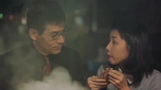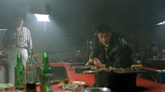 담배를 꺼내 문 우 형사. 그가 단골인 듯 익숙하게 곱창을 굽는 건너편 바의 커플 손님에게 라이터를 빌립니다. 별 뜻 없는 그의 행동에 등 뒤에서 긴장한 시선을 보내던 주인장이 갑자기 맥주잔에 소주를 들이켭니다. 사실 그 커플은 그날 낮 살인극의 주범 장성민(안성기)과 그 애인 김주연(최지우)이었거든요. 우 형사가 낌새를 알아챘을 때, 성민과 주연은 이미 사라진 뒵니다. 화로 위 곱창과 마시던 술잔을 내팽개친 채.
