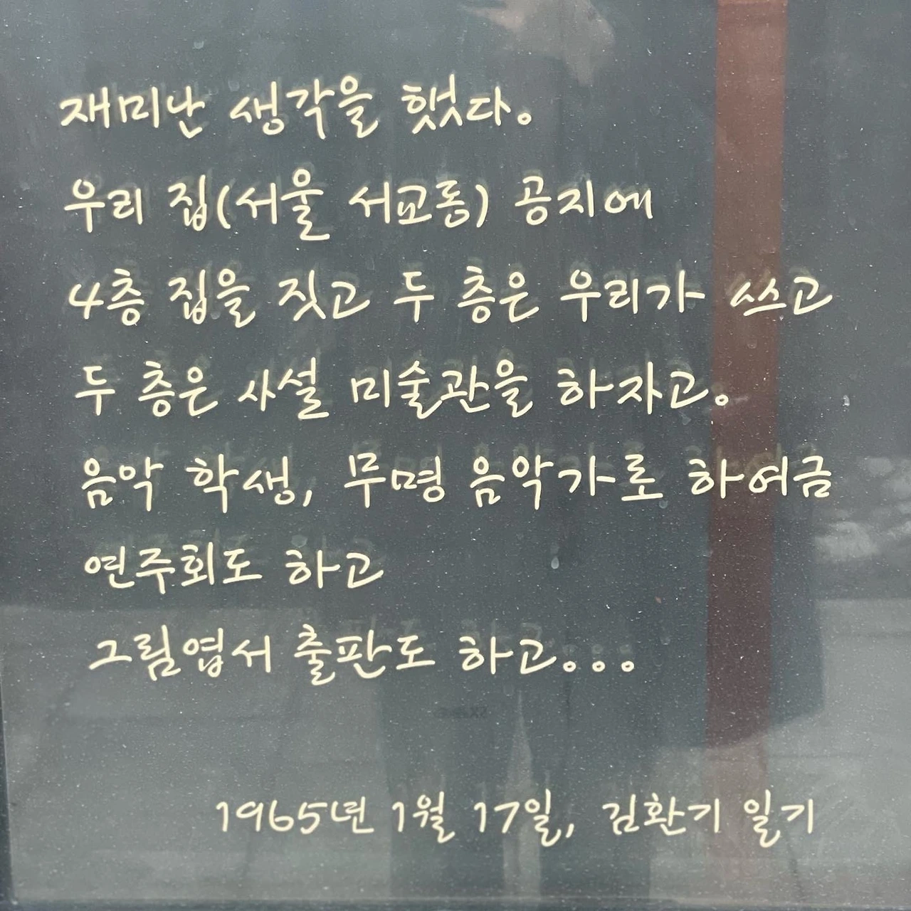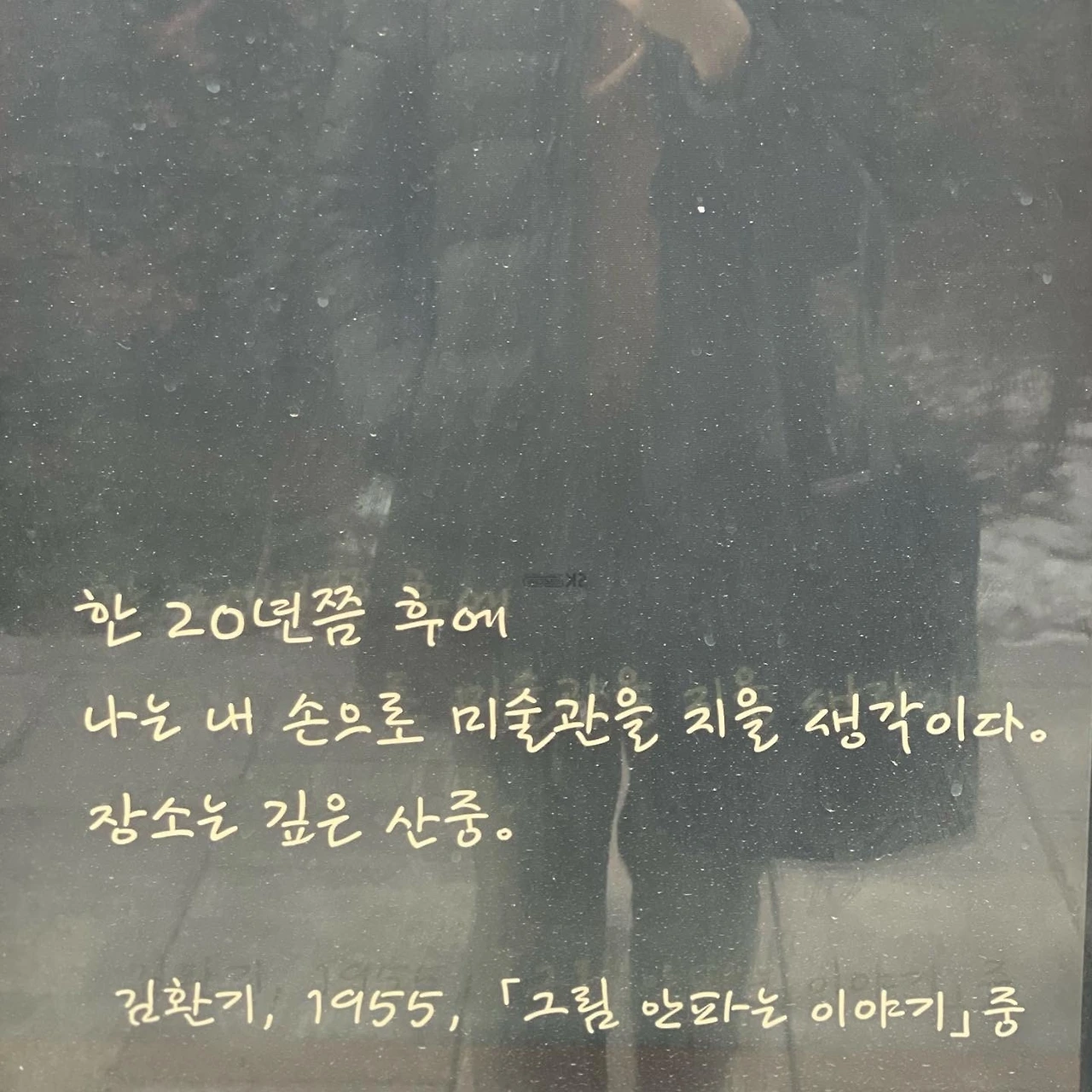 새해를 맞이해서 좋아하는 미술관에 들렀다. 나름 깊은 산중에 마주한 '환기미술관'에서 하는 기획 전시가 이번달 18일까지라 부랴부랴 다녀왔다. 화백의 이름을 따서 지어진 미술관은 작품 수에 제한이 있기 때문에 기획과 관점을 달리해서 전시를 하는 편이다. 이번에는 개관 30주년을 맞이하여 건축물에 대한 이야기로 구성되었다. 별관(수향산방)으로 가는 길에 크게 눈에 띄지 않았지만 들어온 문구가 있었으니,