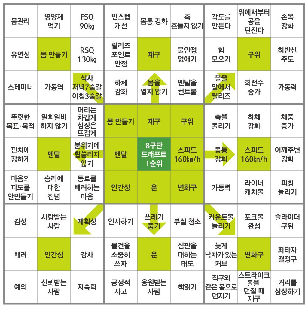 여기서 '8구단 드래프트 1순위'가 오타니 쇼헤이의 핵심목표, 핵심목표를 감싸는 8개의 키워드는 바로 세부목표입니다.