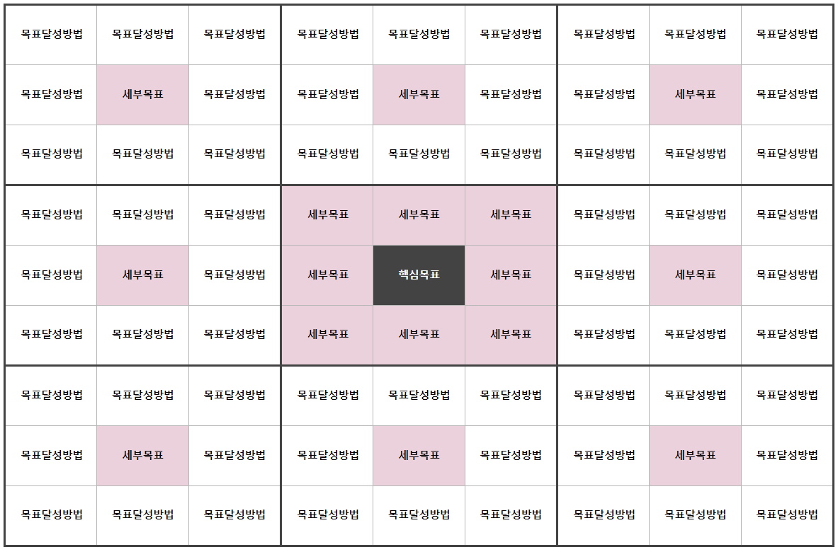 3. 핵심목표 주변 8칸에 핵심목표를 이루기 위한 세부목표들을 적는다.