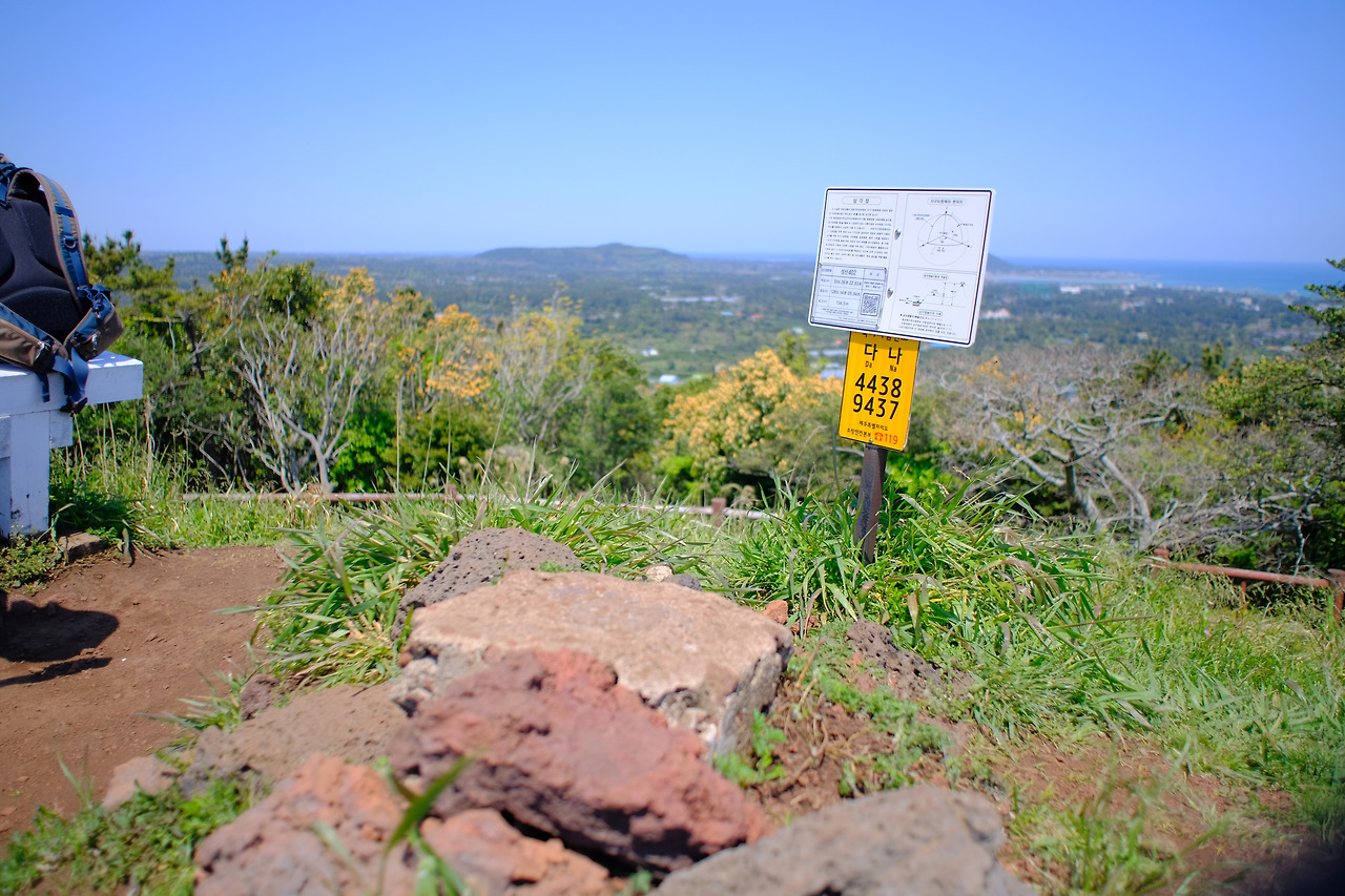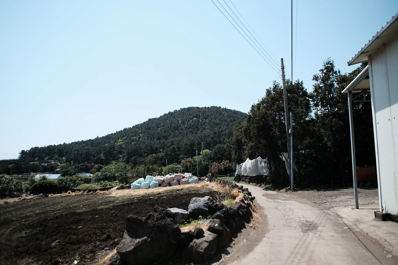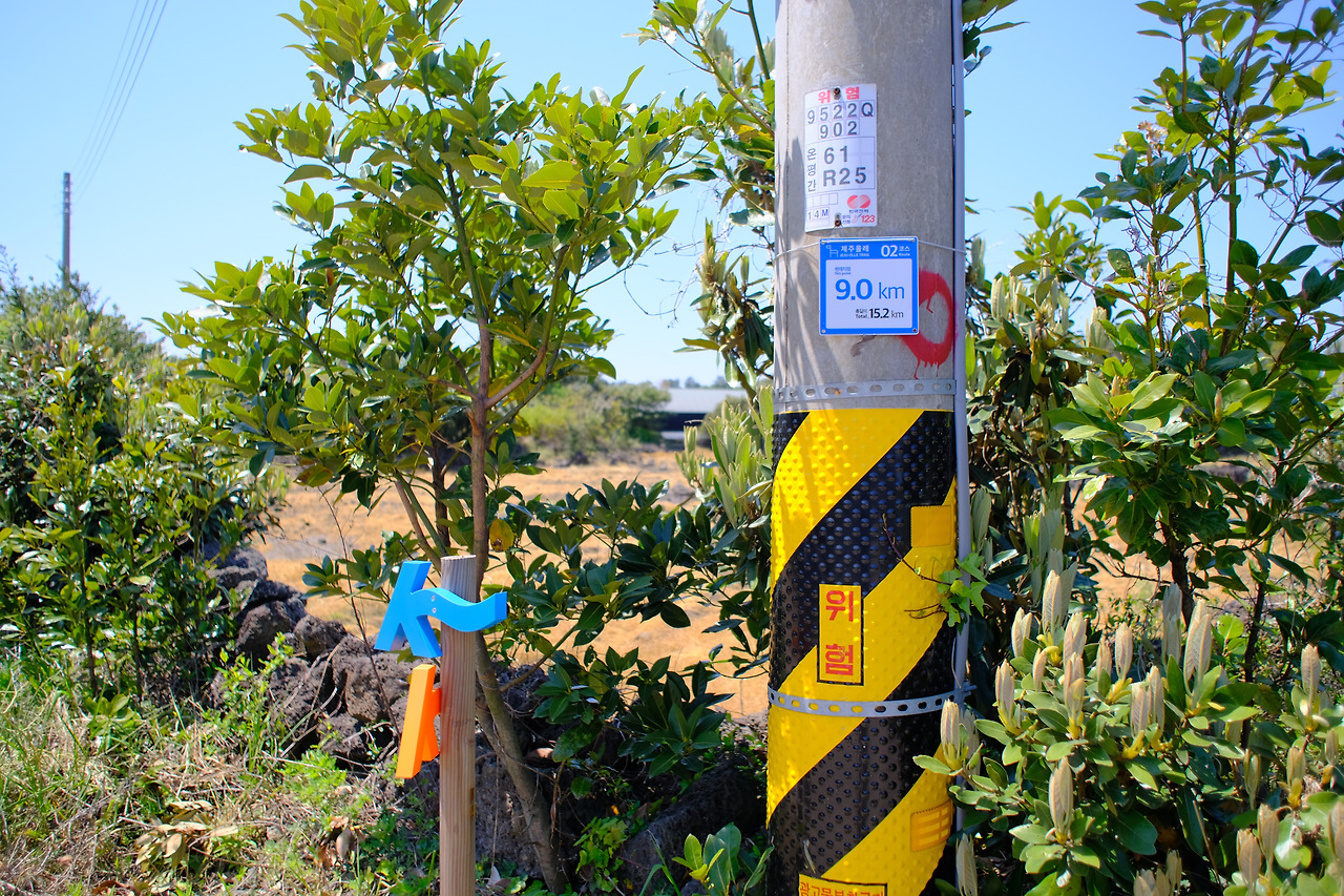 간세의 머리 방향을 향해 걷다 보니 7km 지점 플레이트가 나왔다. 출발한지 20여 분밖에 지나지 않았던 터라 7km에 대한 감흥은 없다. 정자 앞 전봇대 주변 한라봉 무인 판매대가 보였다. 가격은 1봉지 1000원으로 1봉지에 2~3개가 있었고 현금은 함에 넣으면 될 것이다. 2코스 시작점에서 출발했다면 쉬엄쉬엄 정자에서 먹었을 수도 있었을 테지만 휴식하기에 이른 시간이고 들고 다니기에는 배낭의 무게가 무거웠던 탓에 아쉬운 마음을 뒤로하고 멀리 보이는 대수산봉을 향해 다시 출발했다.