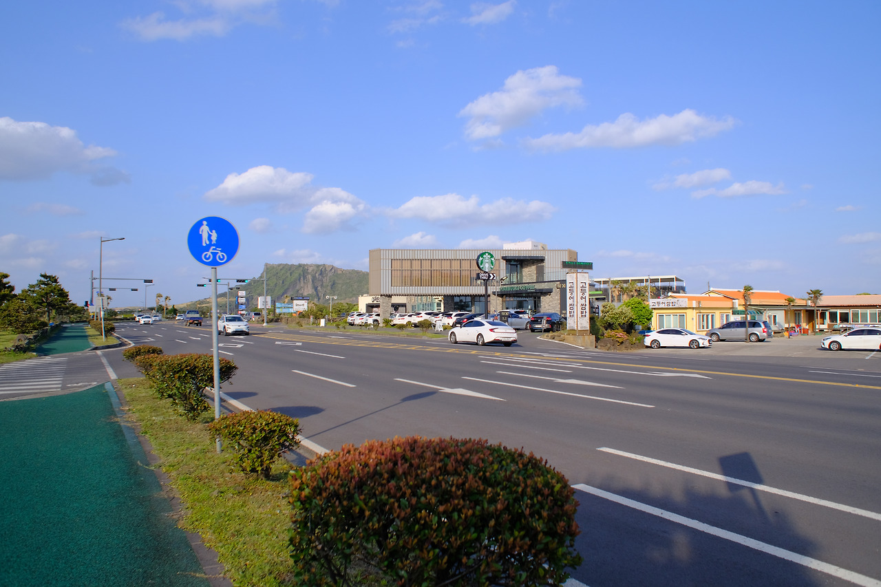 스타벅스에 주문을 하고 자리에 앉아 지도와 스마트폰을 보며 계산을 해본다. 2코스의 경우 광치기 해변에서부터 자연스럽게 남쪽을 향하지 않고 식산봉을 오르기 위해 북쪽을 둘러 내려오는 형태였다. 17:00가 넘어간 시간. 제주 동마트까지의 거리는 5.7km로 2시간 이내면 마칠 수 있는 거리였다. 동마트까지 가는 것을 목표로 스타벅스 건너편으로 넘어가 리본과 이정표를 따라 다시 걷기 시작했다. 하지만 길을 걷다 보니 조금 이상한 느낌이 든다. 식산봉을 가야 하는데 방향은 다른 곳을 향하고 있었기 때문이다. 유작가가 제주올레로 전화를 걸어 문의해본 결과 공사로 인해 우회되는 구간이었다.