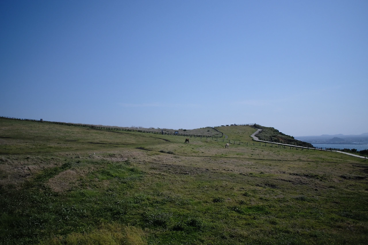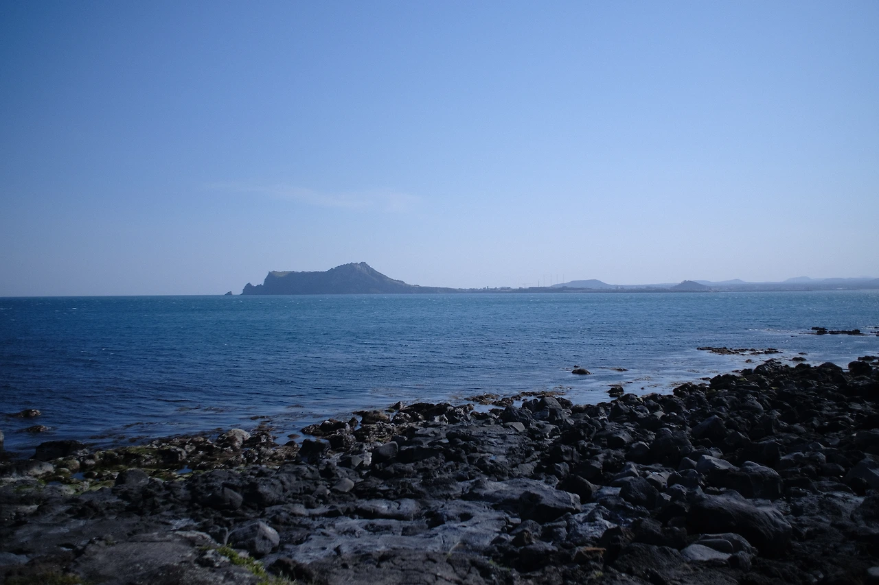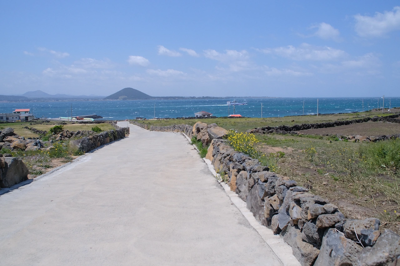 마을을 지나 밭과 돌담 길을 걷다 보면 탁 트인 섬의 저편에 성산일출봉과 지미봉이 보였다. 오늘도 하늘이 매우 푸르고 쾌청하다. 시원한 풍경에 기분이 좋아진다.